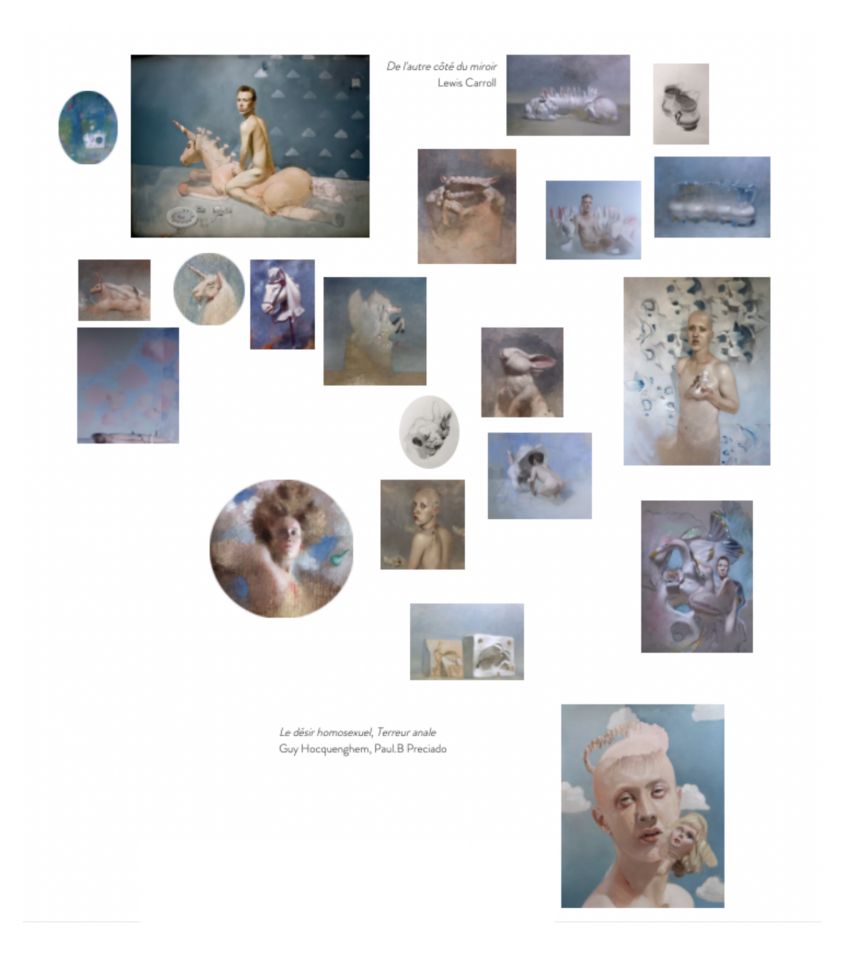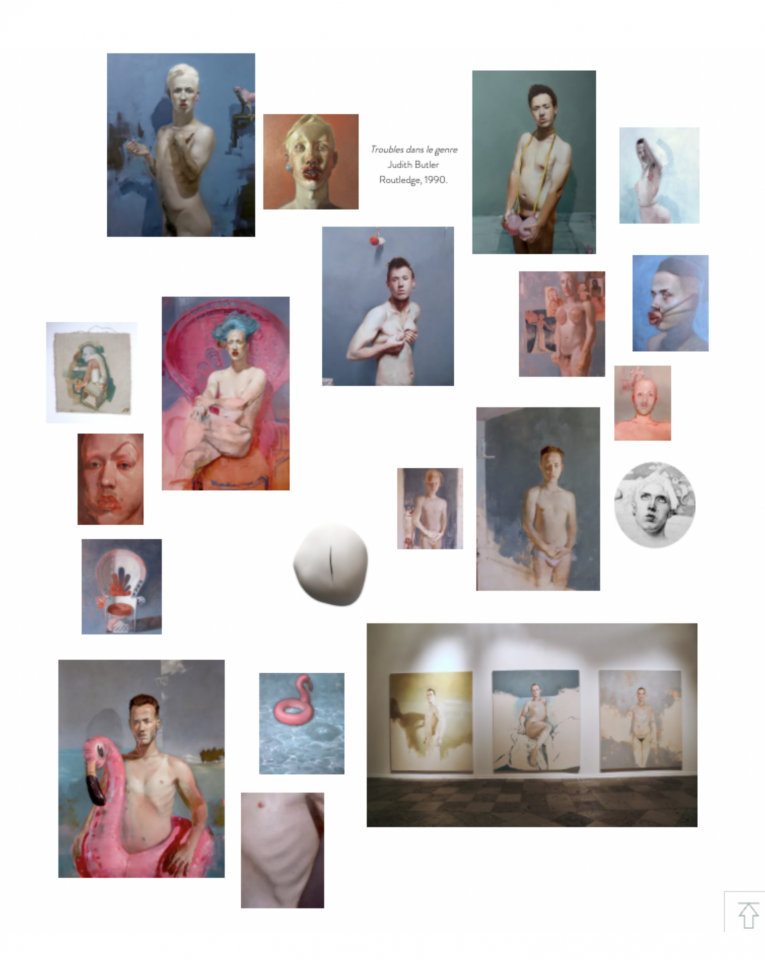 « C’est une réflexion autour de la notion du corps et de l’autoportrait dans lesquels émerge le rapport au genre et aussi à la sexualité. La peinture et le dessin sont principalement les médiums utilisés pour traiter ces notions dans la représentation. Ainsi, l’autoportrait est amené à se décliner dans différentes mises en scène dans lesquelles viennent ponctuer des objets du quotidien. Ce projet me permet d’examiner les relations qui découlent entre le(s) sujet(s) et les contextes reconstruits dans lesquels ils sont amenés à évoluer. Le corps apparaît ainsi en constante mutation, dans un renouvellement continuel de sa représentation et des symboliques qui s’y greffent. Les sujets, les objets et les contextes deviennent alors une multiplicité de fenêtres ouvertes et se conjuguent pour faire émerger différents systèmes symboliques.