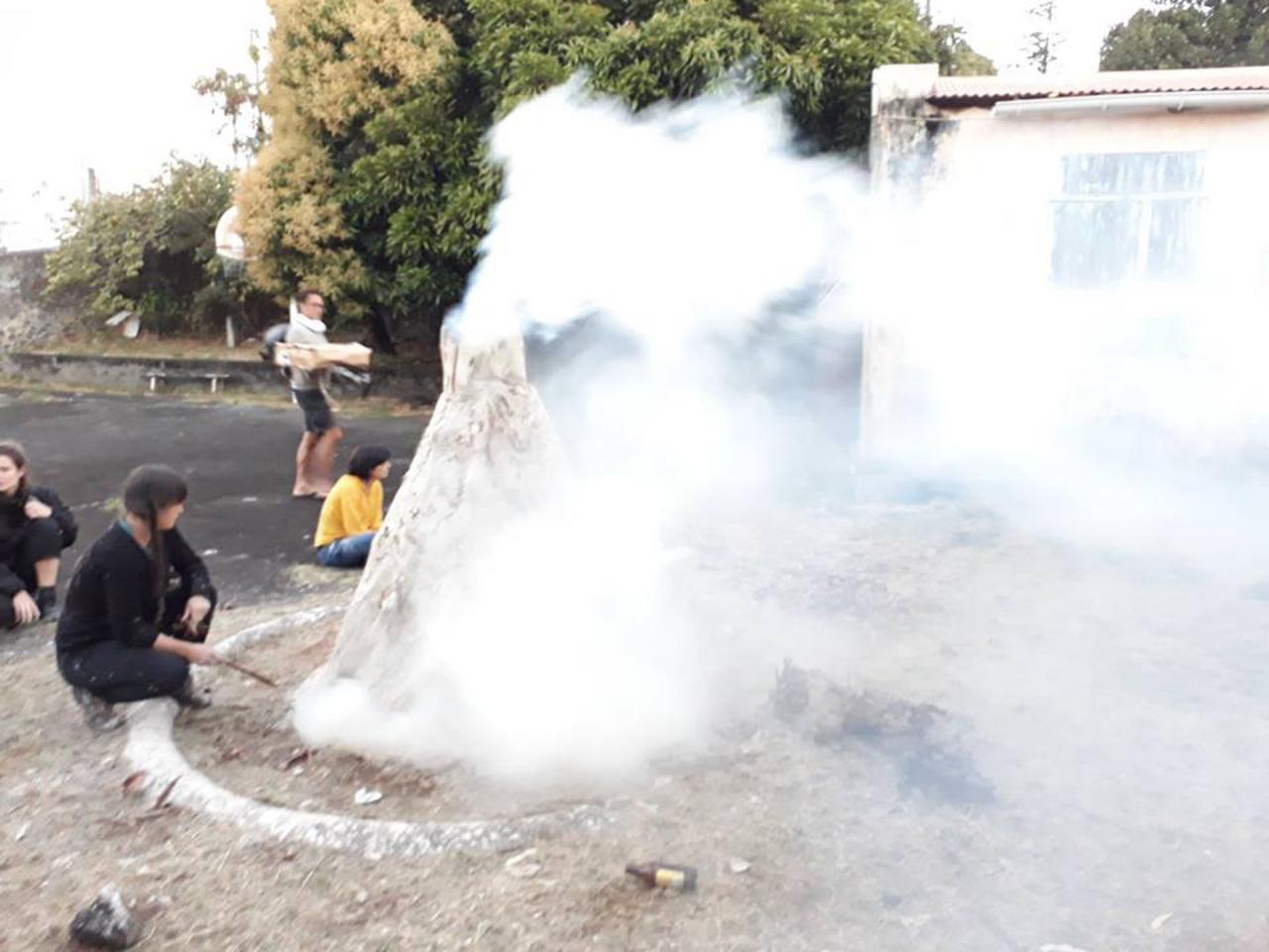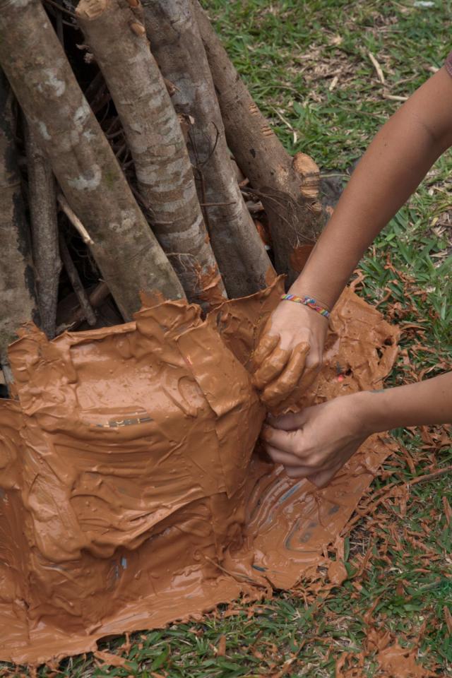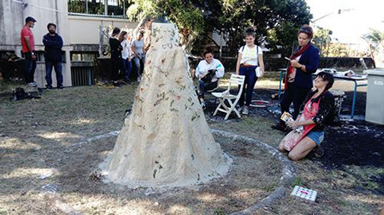 Performance, construction d’un four en papier journal et argile, festival Tourné Viré, Saint-Benoît, La Réunion.