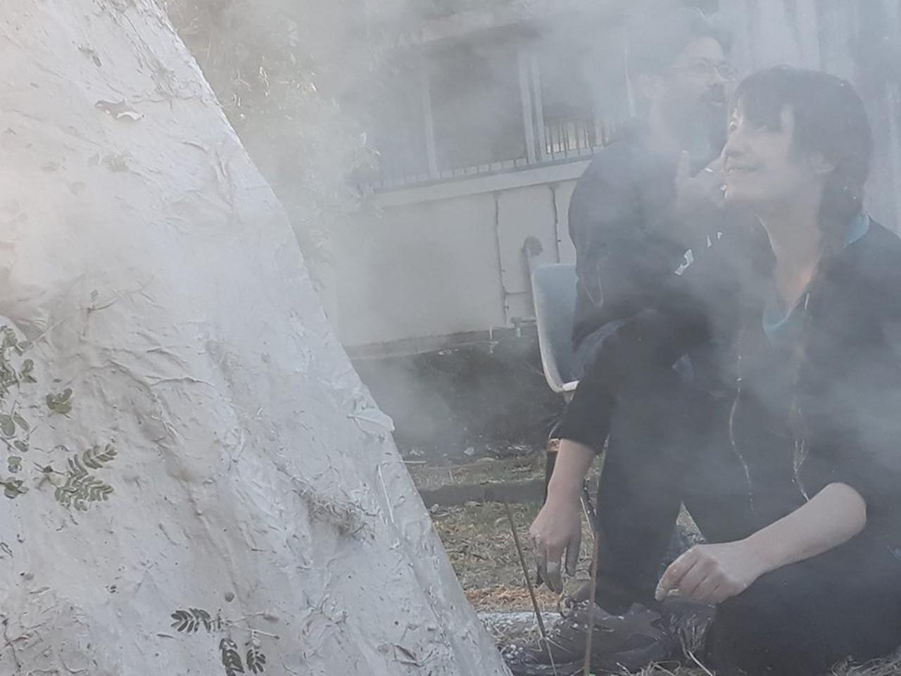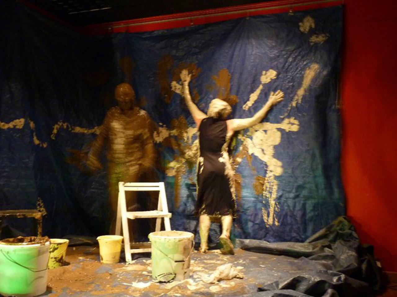 Performance, construction d’un four avec des bandes de papier journal trempées dans l’argile.