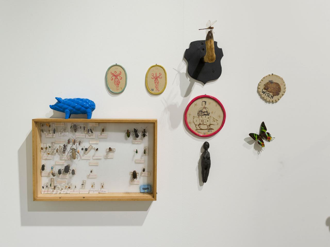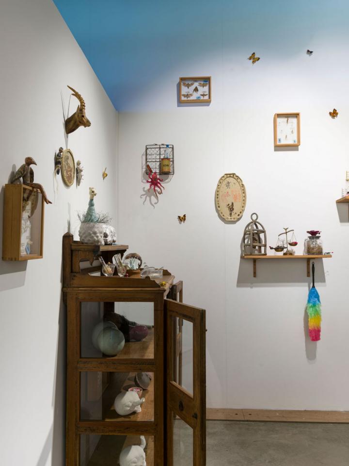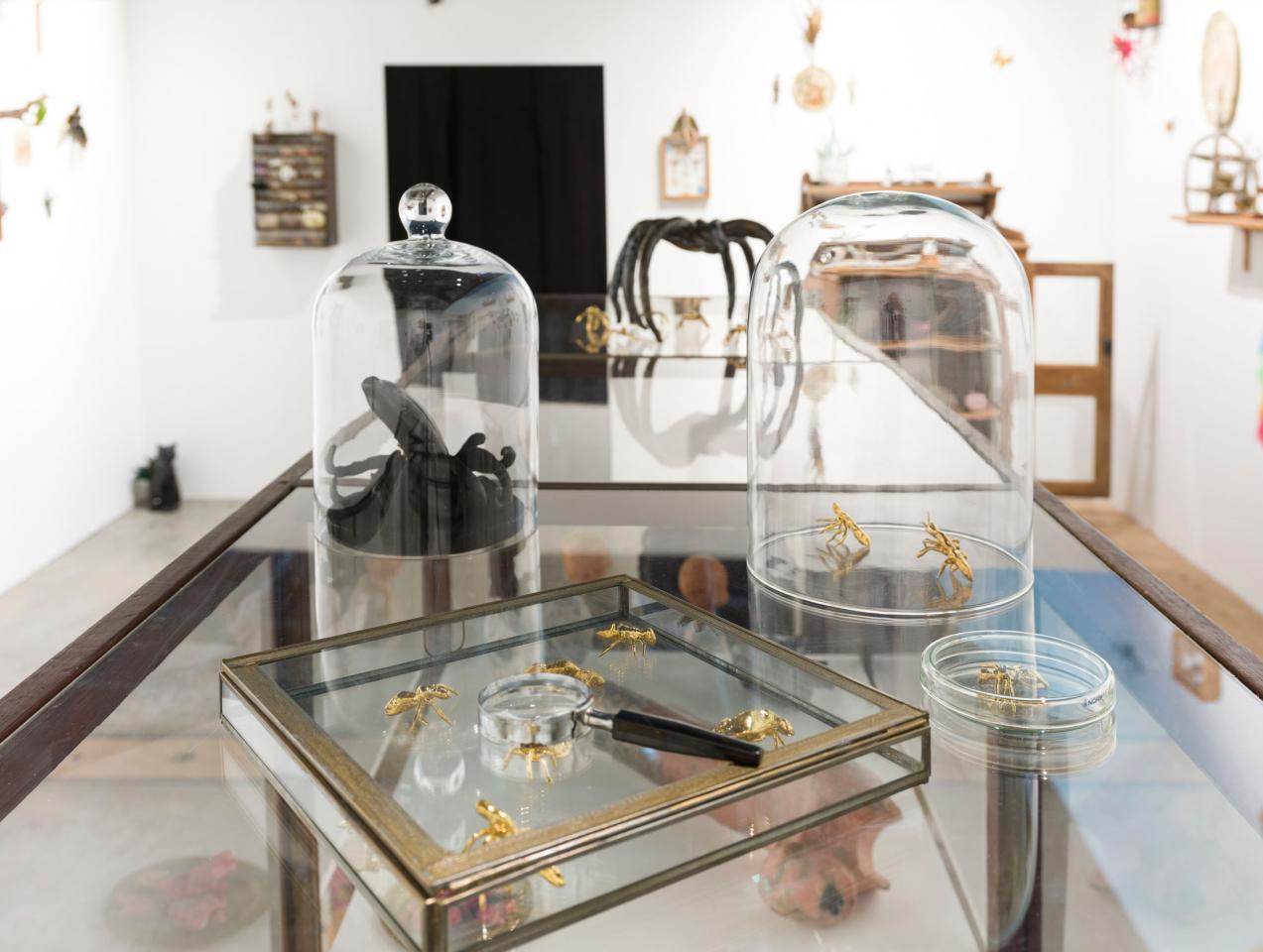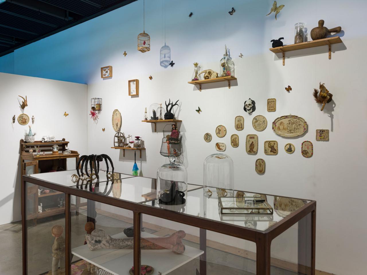 Ici, la sculpture naît d’un modelage ou d’un moulage technique. La forme peut aussi surgir d’un souffle dans la pâte de verre ou d’une mise en volume de tissus et de ouate. Le volume devient le catalyseur de mes flashs mentaux et de mes syncrétismes noctambules. L’une des salles centrales est composée de meubles et vitrines en bois remplis de nombreux objets : outils d’observation de la nature, animaux empaillés ou dans des bocaux, livres… qui dialoguent avec les sculptures d’argile ou de verre. C’est l’atelier, le laboratoire, lieu d’expérience et de création, je l’envisage comme un espace dense et éclectique, drôle et surréaliste où naturalia rencontre artificialis, où le populaire devient sacré, la science chimérique, où la magie et la poésie relient les papillons aux étoiles.