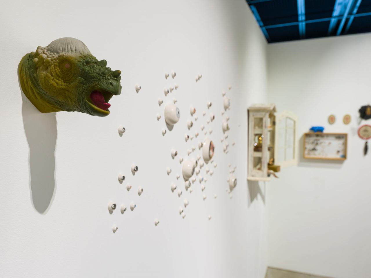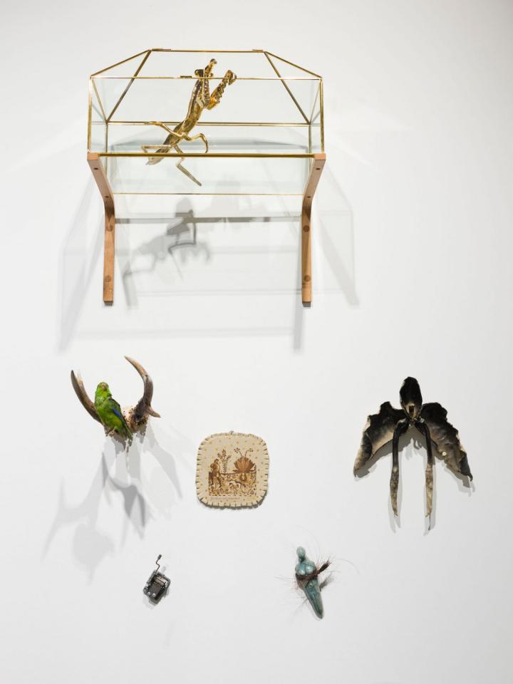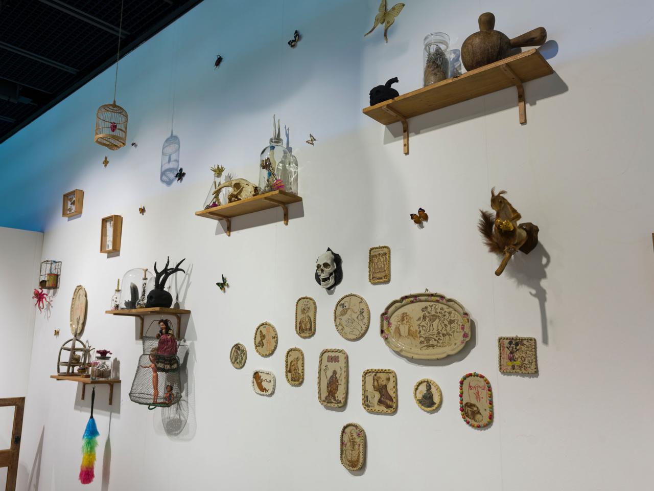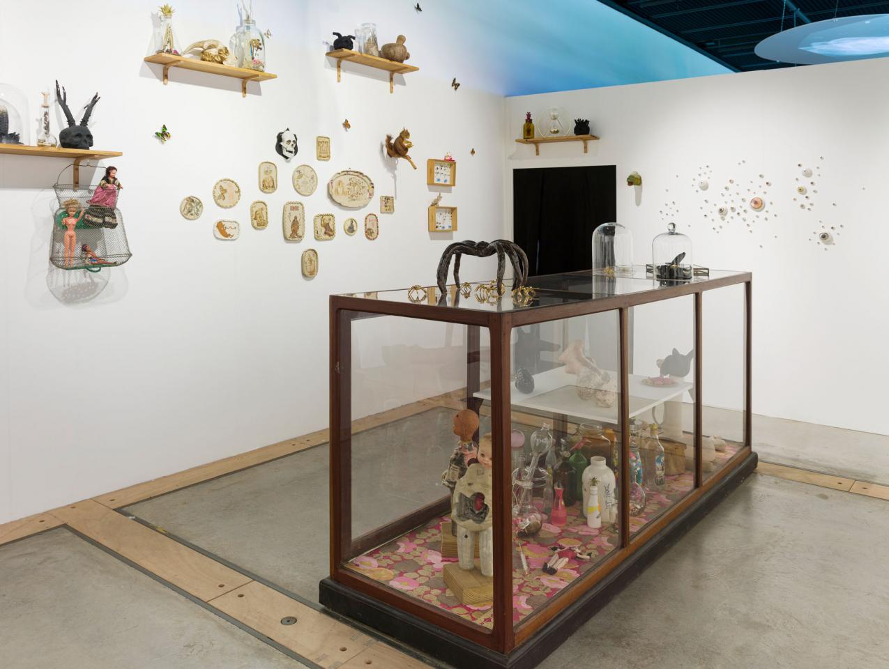 Ici, la sculpture naît d’un modelage ou d’un moulage technique. La forme peut aussi surgir d’un souffle dans la pâte de verre ou d’une mise en volume de tissus et de ouate. Le volume devient le catalyseur de mes flashs mentaux et de mes syncrétismes noctambules. L’une des salles centrales est composée de meubles et vitrines en bois remplis de nombreux objets : outils d’observation de la nature, animaux empaillés ou dans des bocaux, livres… qui dialoguent avec les sculptures d’argile ou de verre. C’est l’atelier, le laboratoire, lieu d’expérience et de création, je l’envisage comme un espace dense et éclectique, drôle et surréaliste où naturalia rencontre artificialis, où le populaire devient sacré, la science chimérique, où la magie et la poésie relient les papillons aux étoiles.