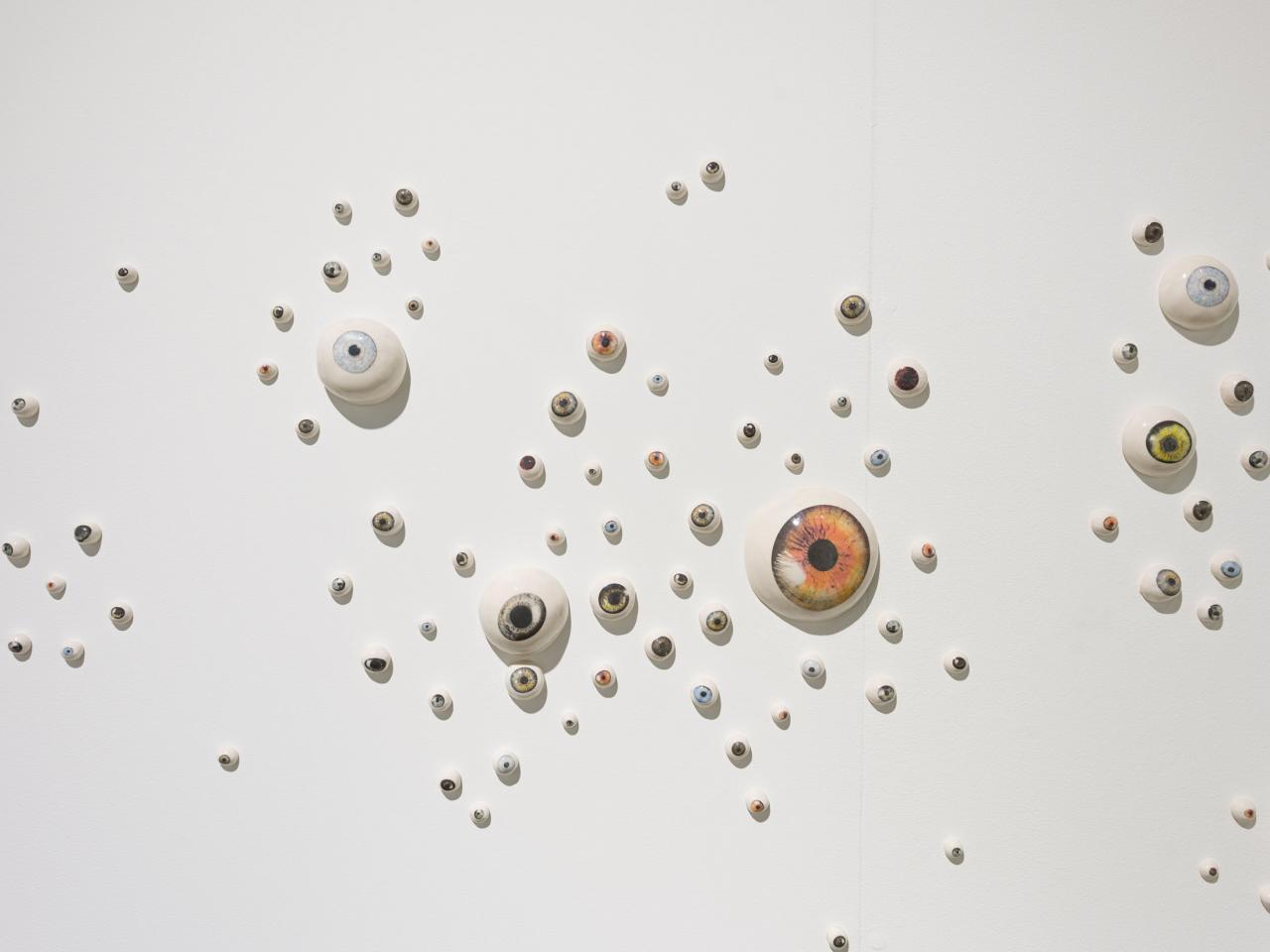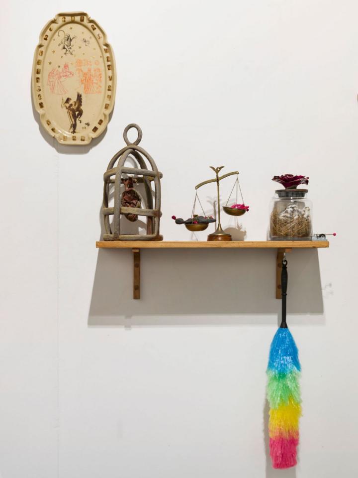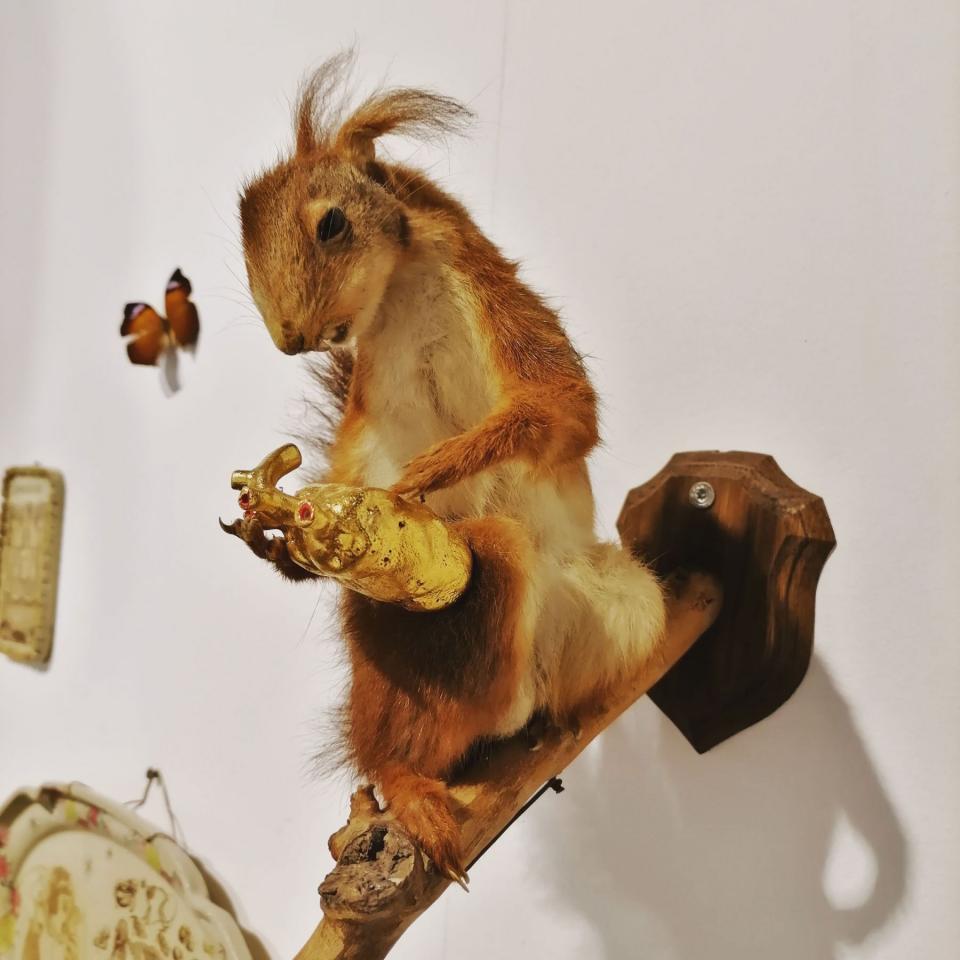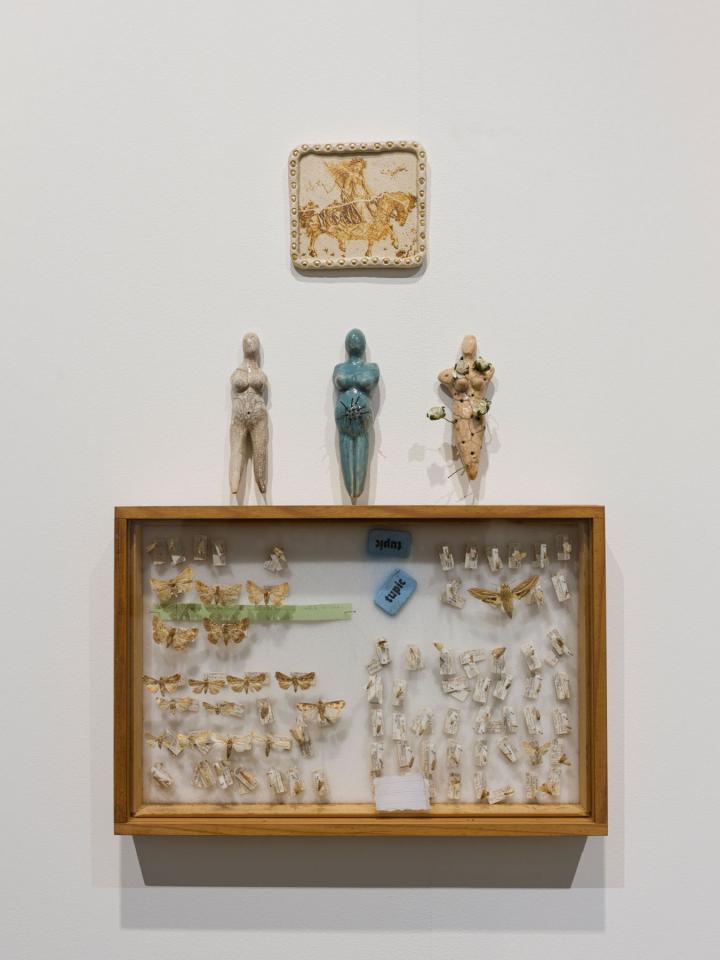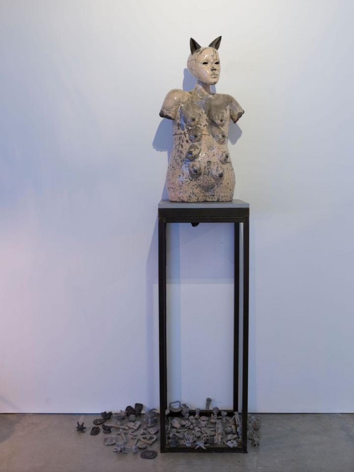 Ici, la sculpture naît d’un modelage ou d’un moulage technique. La forme peut aussi surgir d’un souffle dans la pâte de verre ou d’une mise en volume de tissus et de ouate. Le volume devient le catalyseur de mes flashs mentaux et de mes syncrétismes noctambules. L’une des salles centrales est composée de meubles et vitrines en bois remplis de nombreux objets : outils d’observation de la nature, animaux empaillés ou dans des bocaux, livres… qui dialoguent avec les sculptures d’argile ou de verre. C’est l’atelier, le laboratoire, lieu d’expérience et de création, je l’envisage comme un espace dense et éclectique, drôle et surréaliste où naturalia rencontre artificialis, où le populaire devient sacré, la science chimérique, où la magie et la poésie relient les papillons aux étoiles.