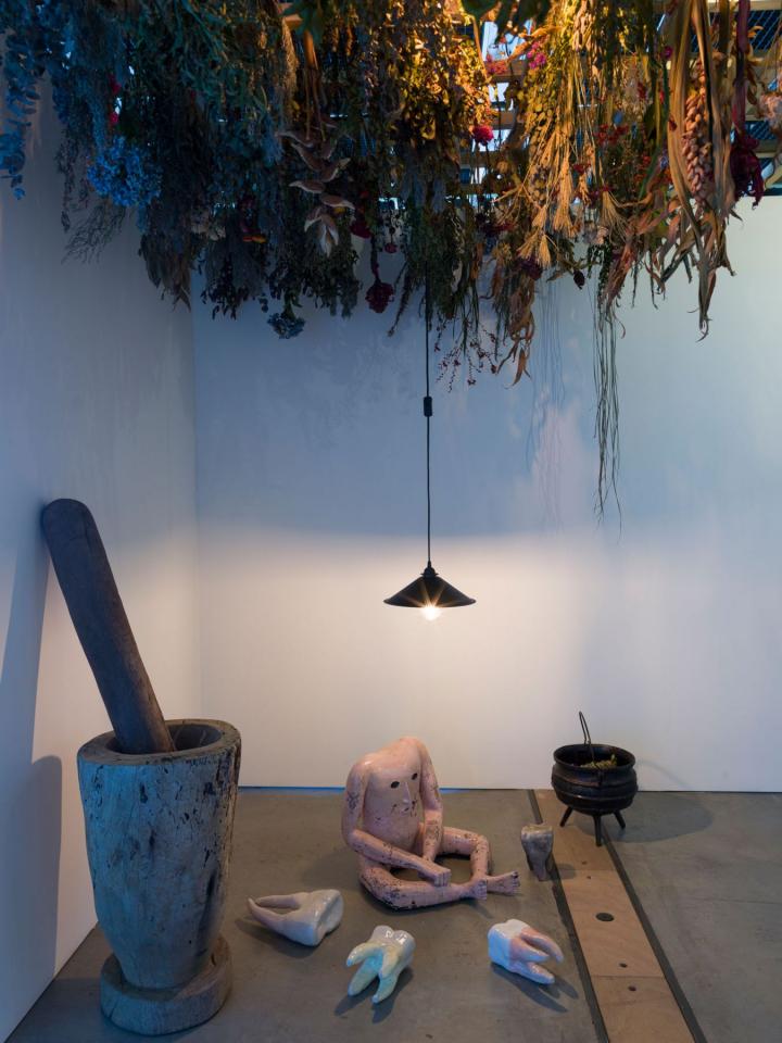 Dans cet atelier de magicienne se côtoient des globes célestes et une dent de géant, des graines d’organes, un cœur de baleine, un crâne de cyclope, des fioles aux élixirs magiques, des sécrétions minérales, des anomalies boschiennes, des fruits délicieux, des ex-voto, des insectes d’or et de carbone et bien d’autres curieuses merveilles.