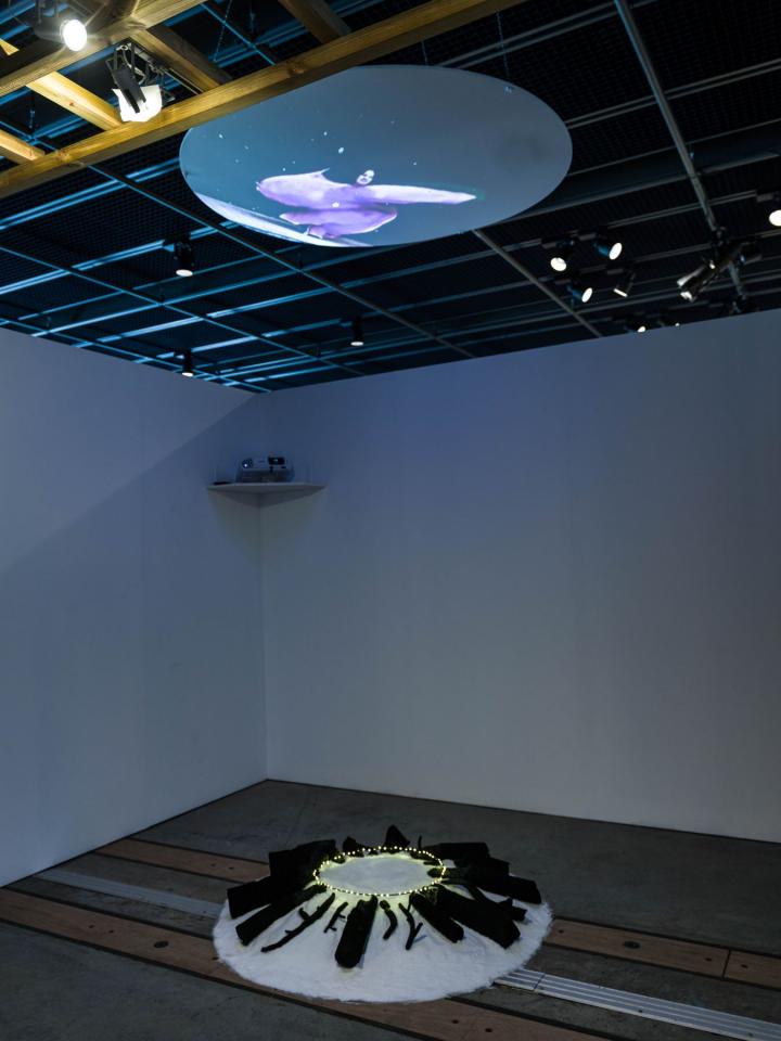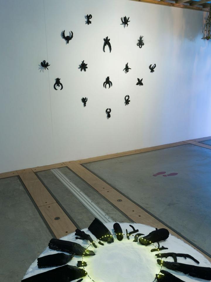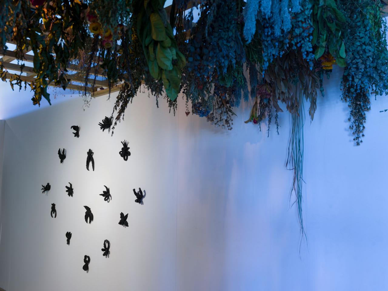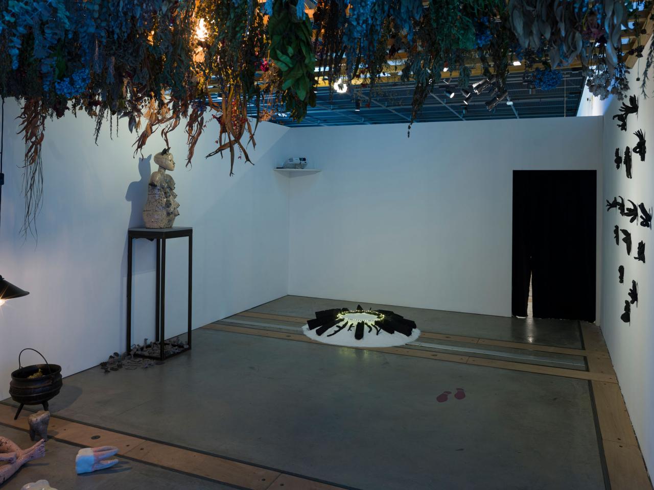« J’investis le Pavillon1 du FRAC RÉUNION avec une installation constituée de sculptures en céramique, textile, verre, de formes et de motifs, de son et de vidéo, une sorte de cabinet de curiosités, la chambre des merveilles d’une sorcière moderne. Une sorcière qui maîtrise la connaissance des simples, de l’alchimie des terres et des couleurs, et qui, telle une Ariane lanceuse d’alerte ou une Pénélope hackeuse, déroule le fil de son réseau sur la toile du web.