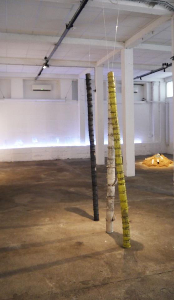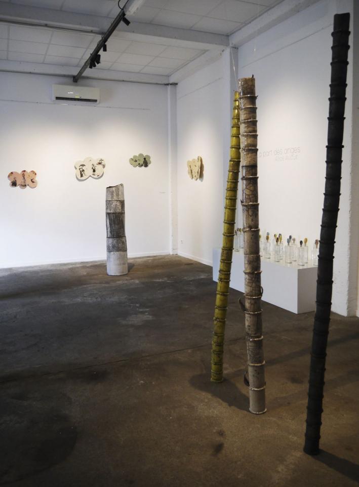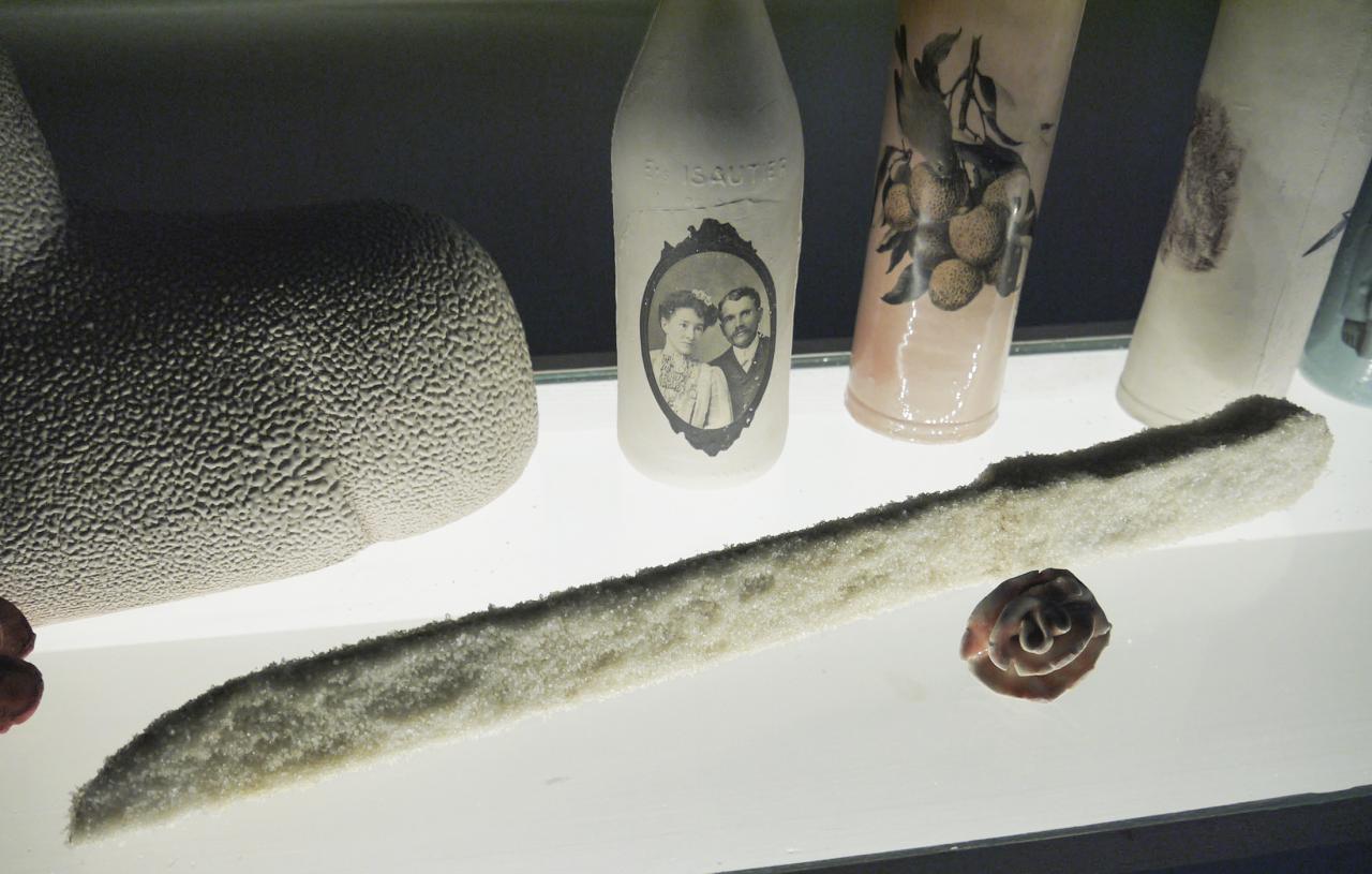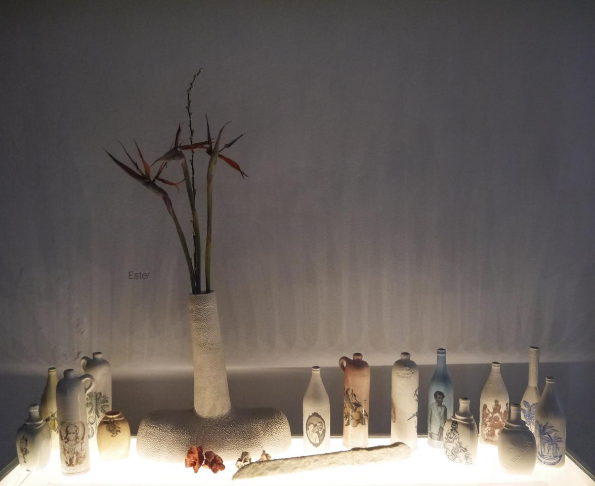 L’installation proposée à la Saga du Rhum mêle sculpture céramique, vidéo, son, montage photographique, matières premières et objets glanés.