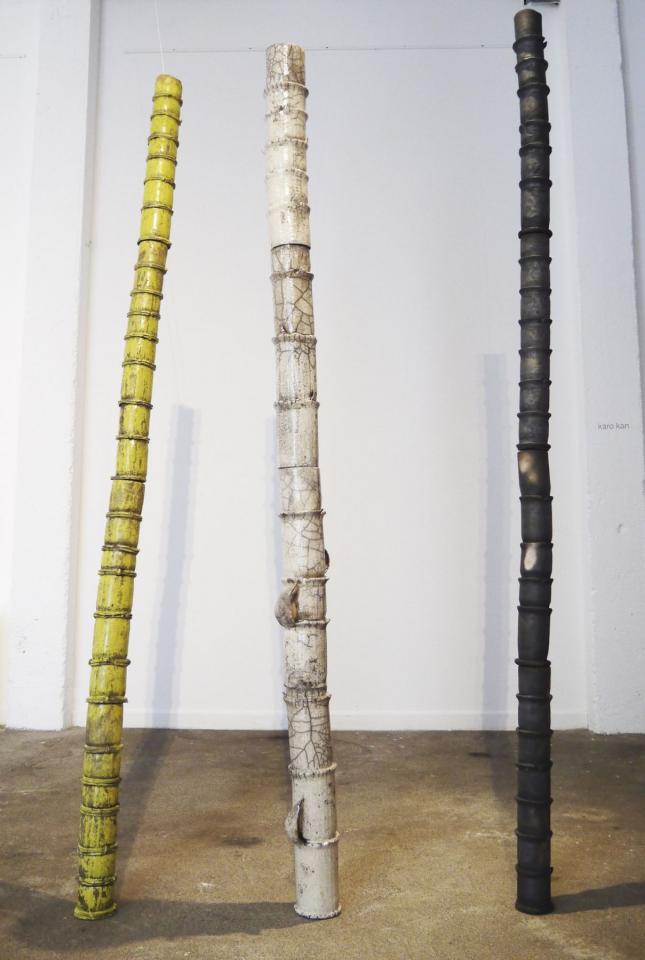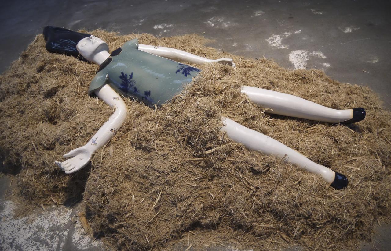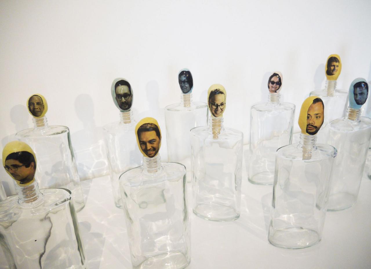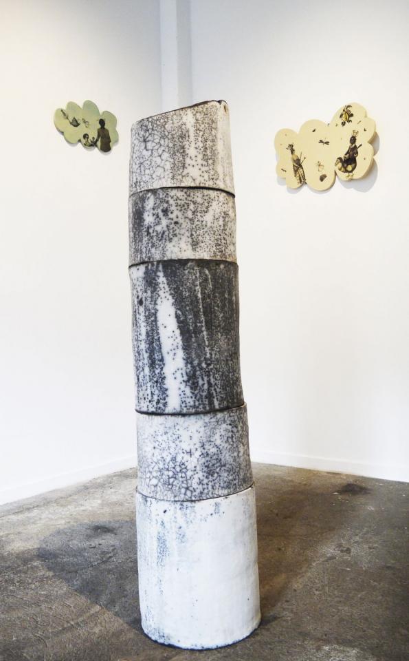 L’installation proposée à la Saga du Rhum mêle sculpture céramique, vidéo, son, montage photographique, matières premières et objets glanés.