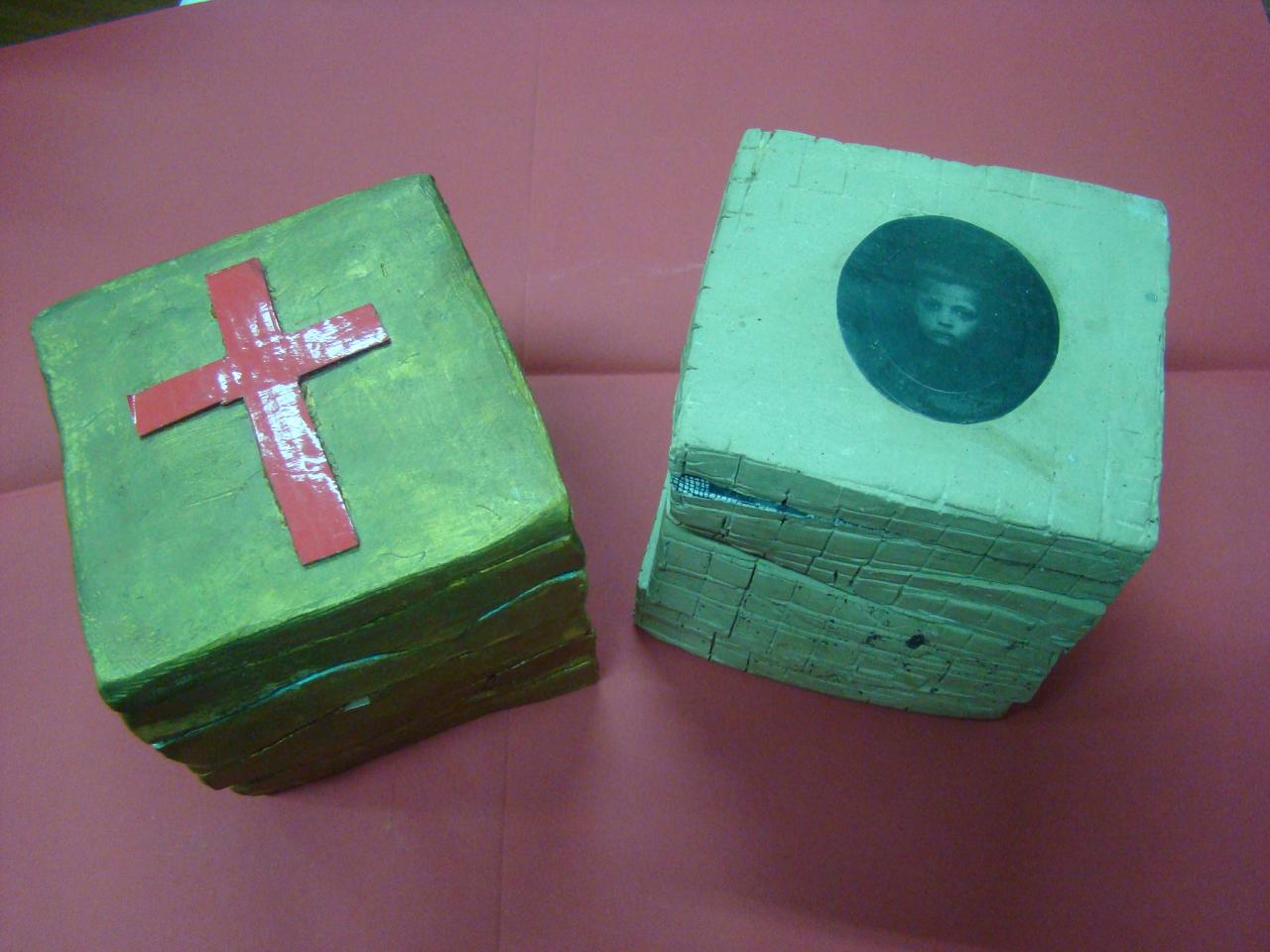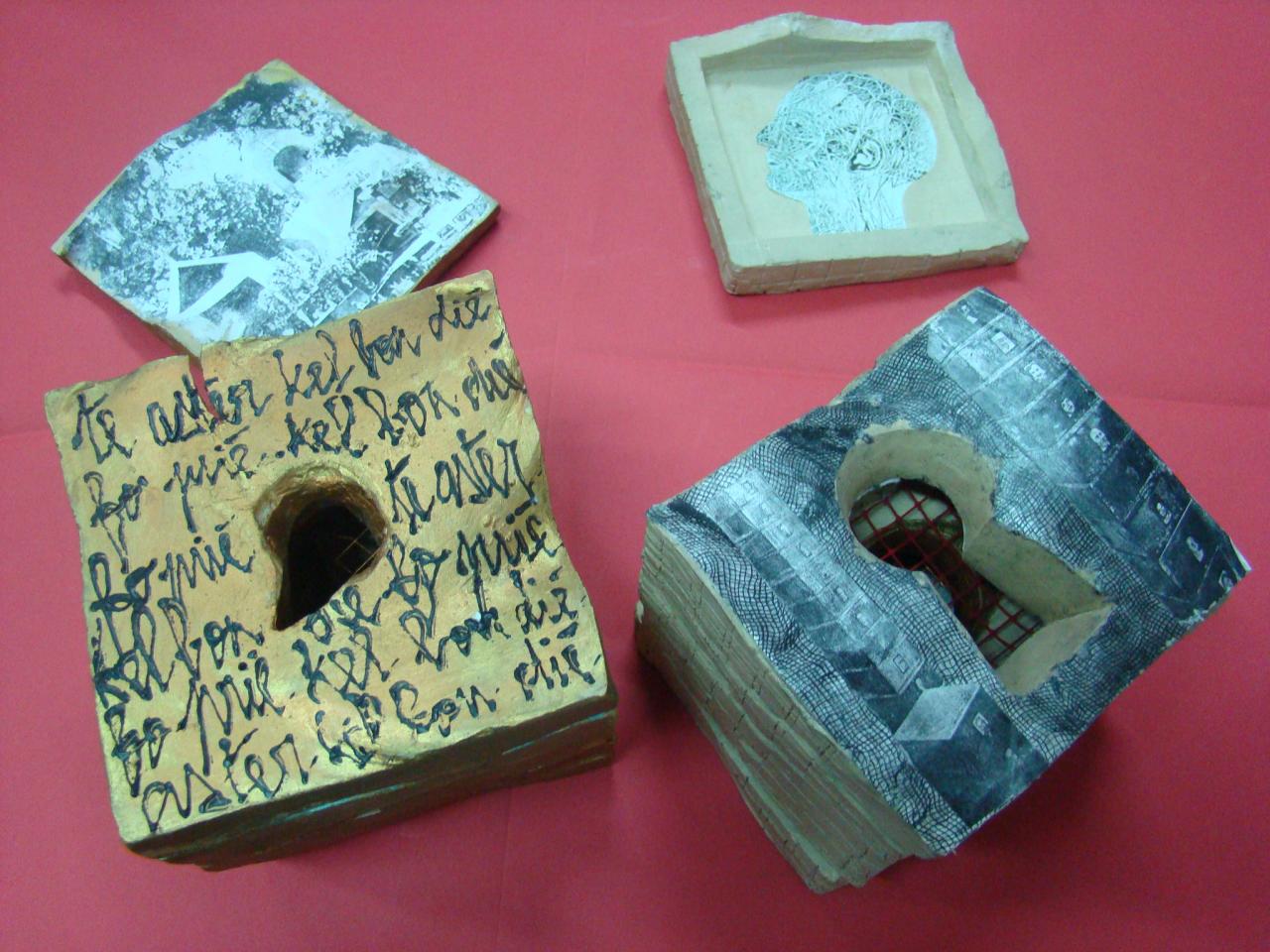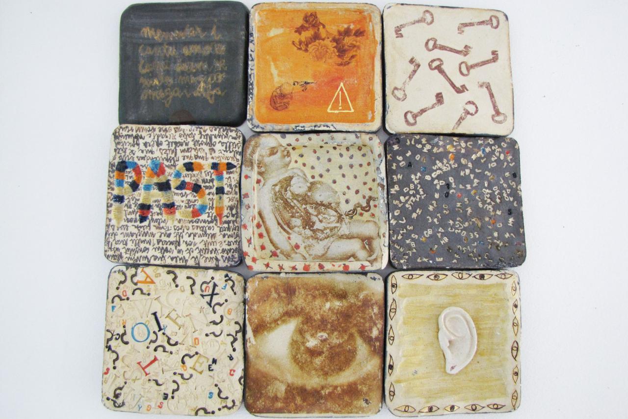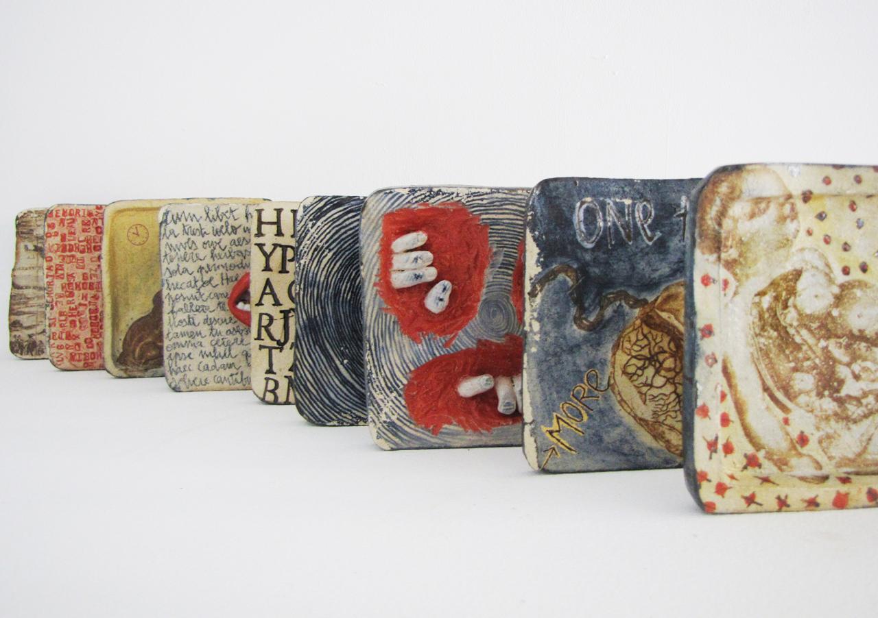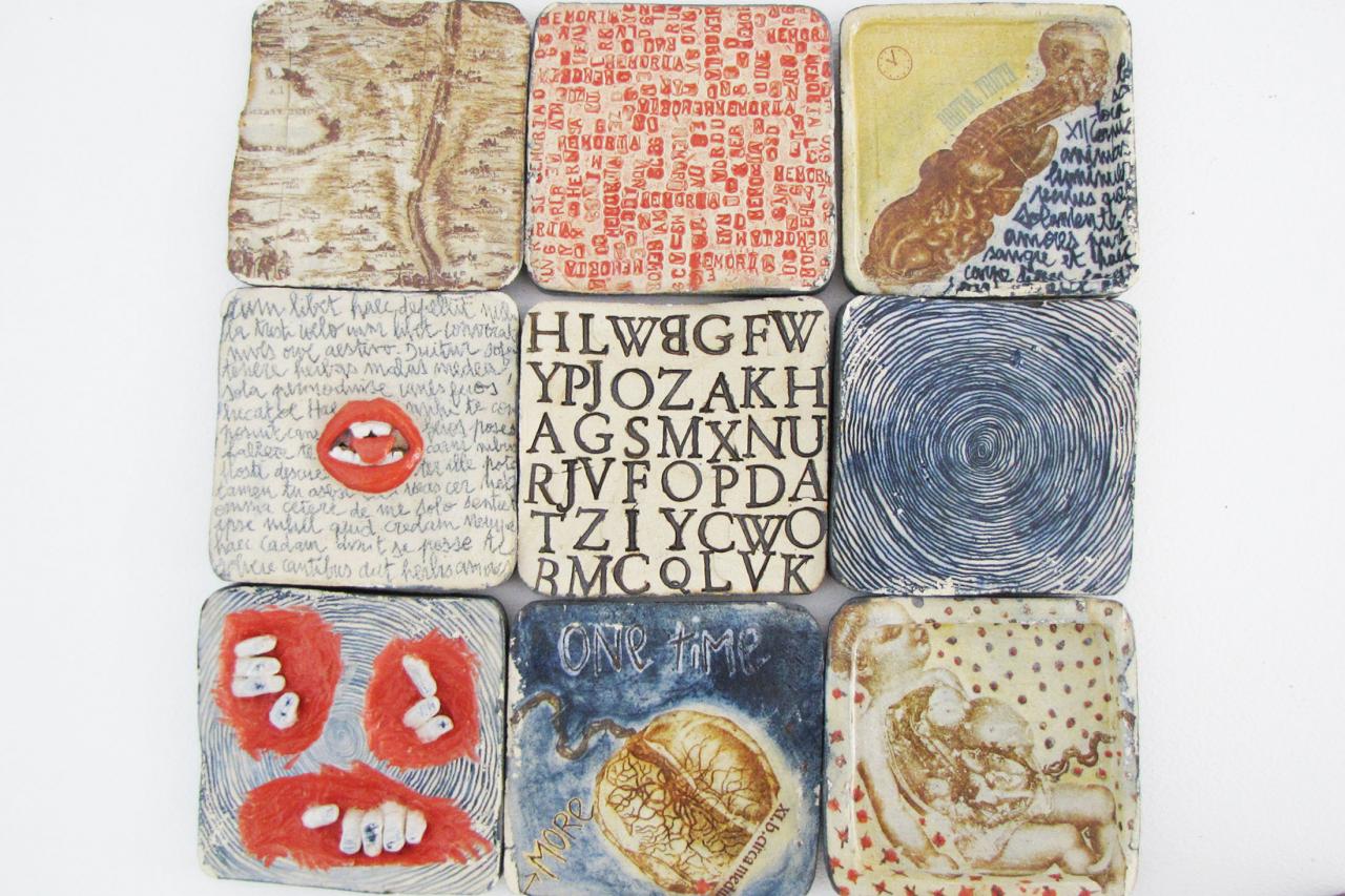 Grès de Saint-Amand, émail, engobe, monotype, chromos, transfert sépia, hauteur d’une pièce 21 cm.