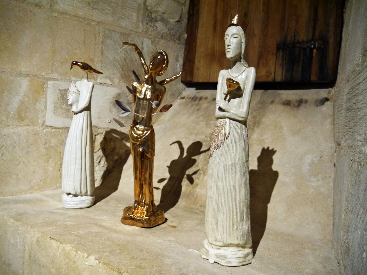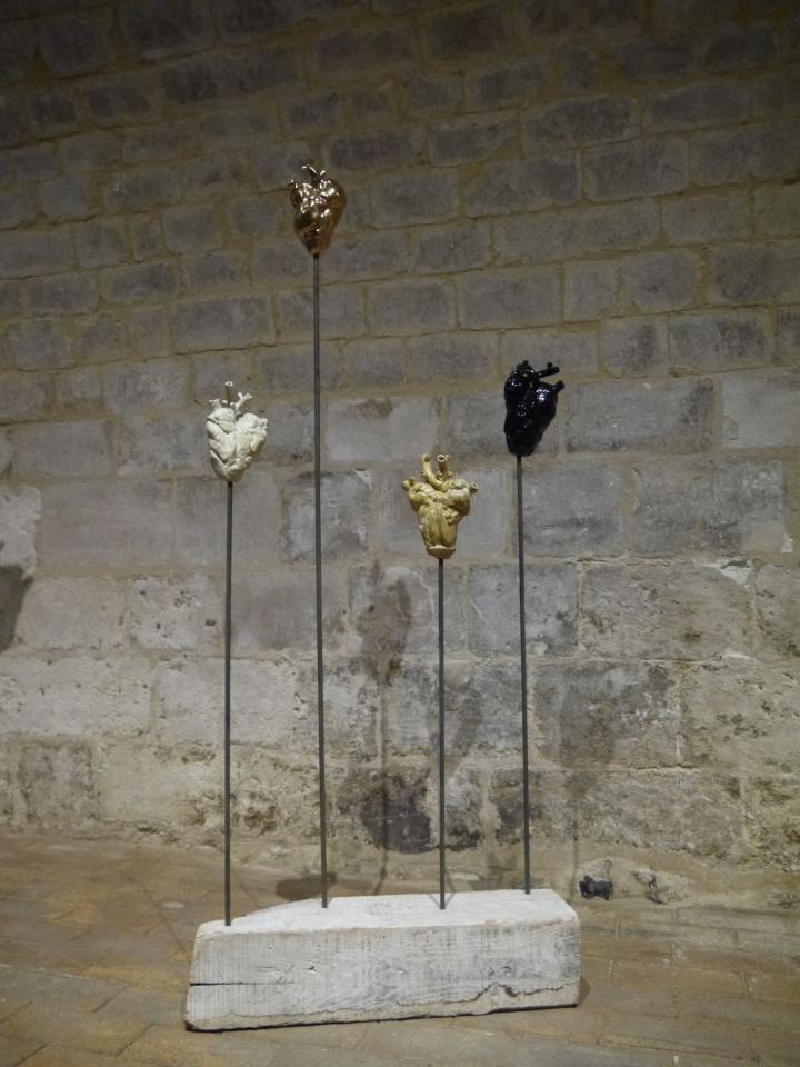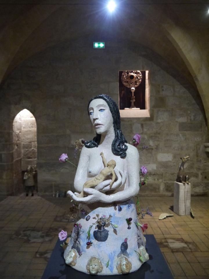 Des hosties grand format avec la reproduction par transfert de portraits anciens de personnes réelles qui furent internées en hôpital psychiatrique. Un moment d’émotion intense. Une autre, géante, laissant passer la lumière (une belle idée symbolique). Des cœurs palpitants modelés en grès, un thème qu’elle aime travailler, et tout un ensemble de sculptures en grès chamotté, inspirées de la statuaire de pierre gothique (et aussi de bois) mais en réalité très contemporaines par leur traitement simplifié laissant pourtant toute sa place à l’expression de la douleur mais aussi de l’innocence. À côté de saints locaux où l’on reconnaît Sébastien, Barbe et Lucien de Beauvais tenant sa tête, sa pièce maîtresse, une pietà, est une véritable Mater Dolorosa.