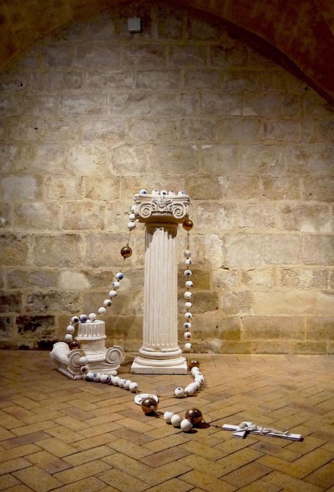 Puisant dans les images existantes, en inventant d’autres, les appliquant ou les mêlant à des formes céramiques comme support, elle a réveillé la mémoire de cette histoire oubliée par le moyen de la sculpture et de toute une série d’objets. Ainsi un impressionnant chapelet géant de porcelaine, verre et touche d’or, dont les perles sont autant d’yeux qui interrogent.