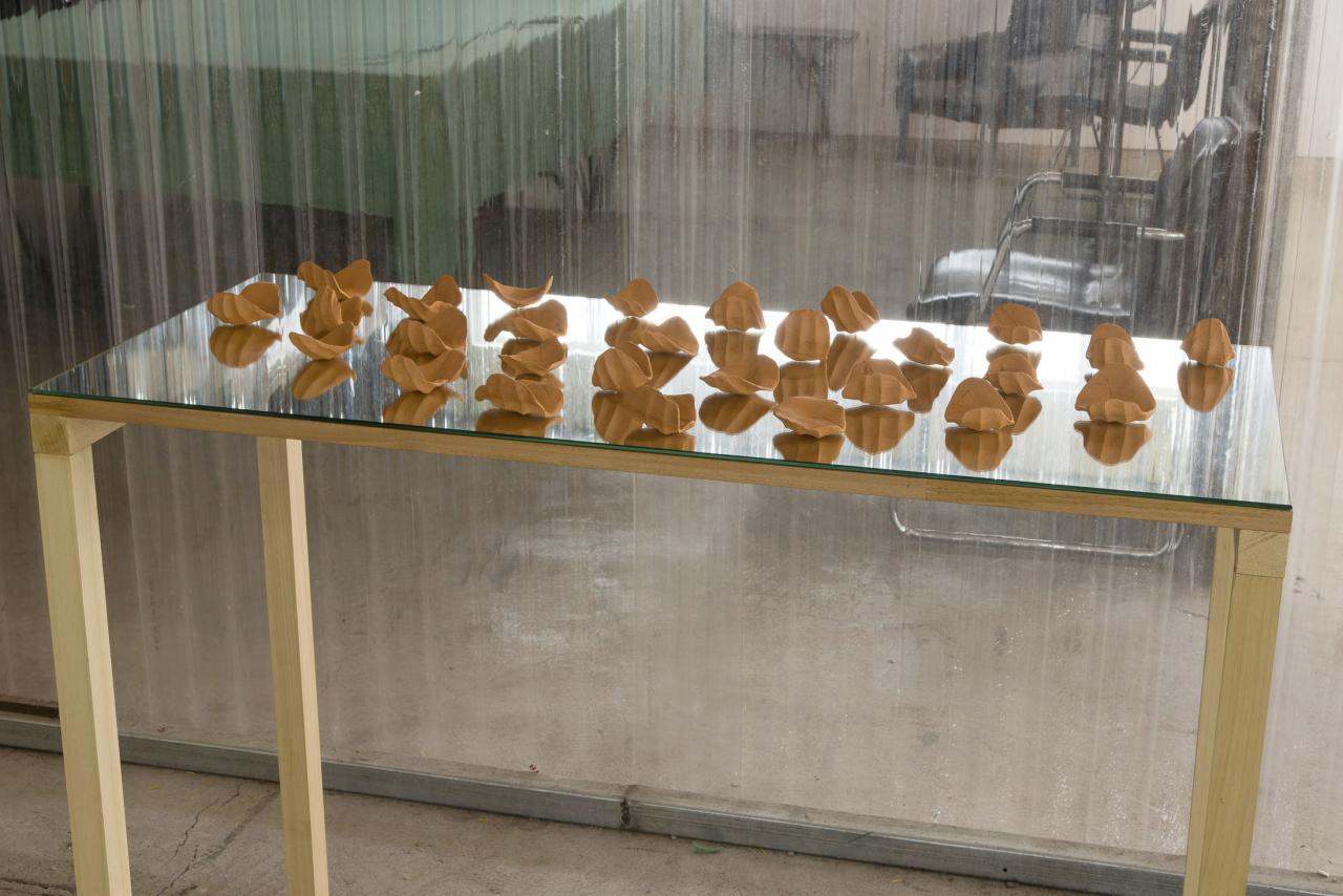Installation, 21 céramiques sur miroir, dimensions variables.