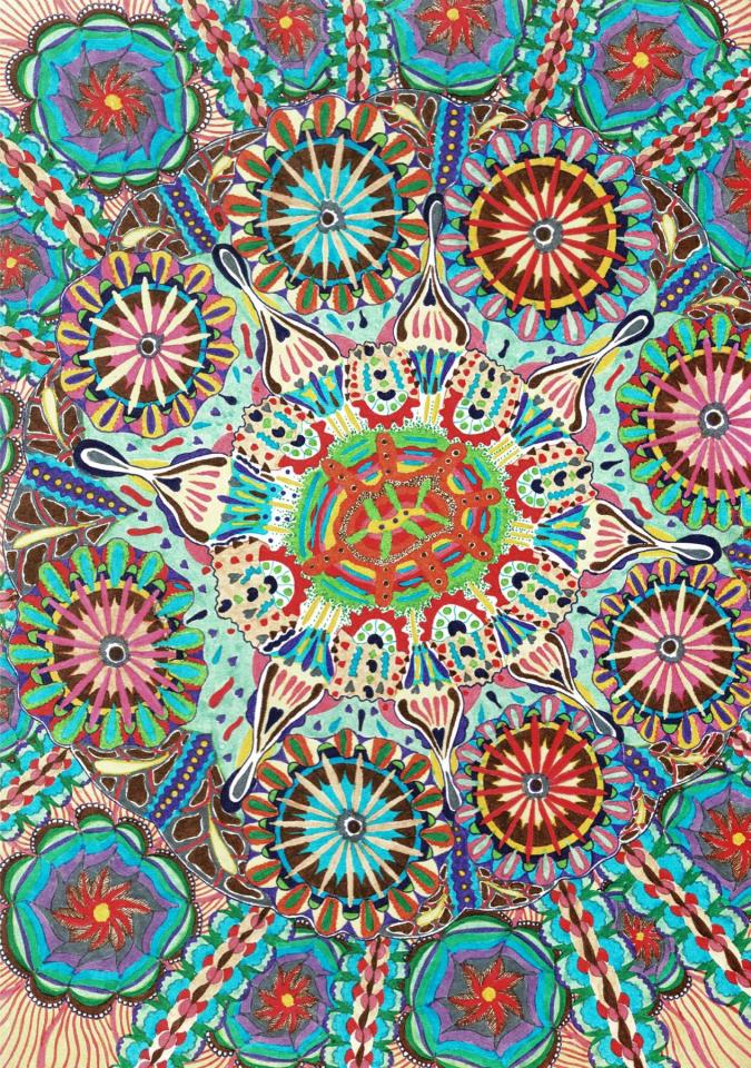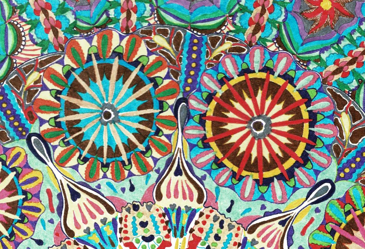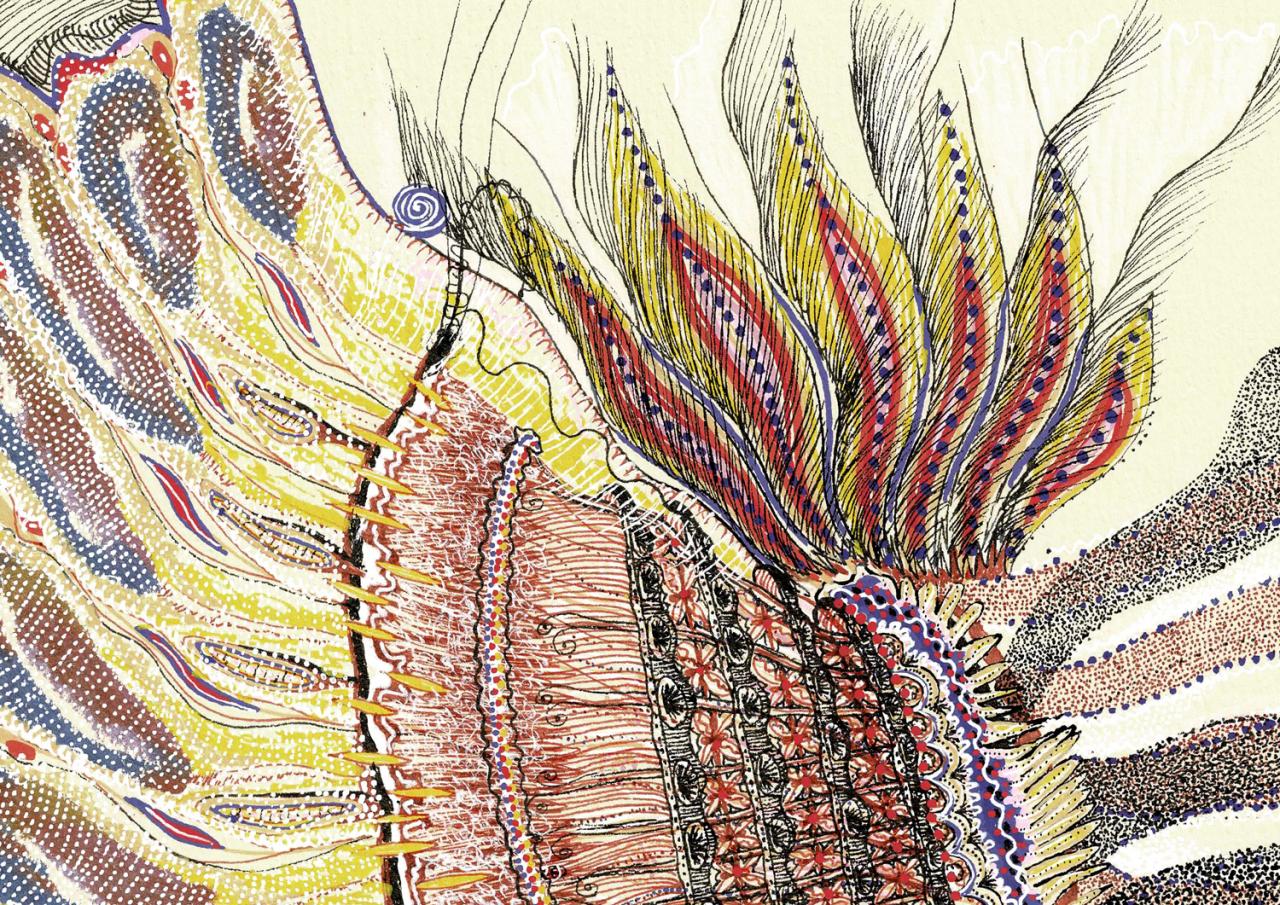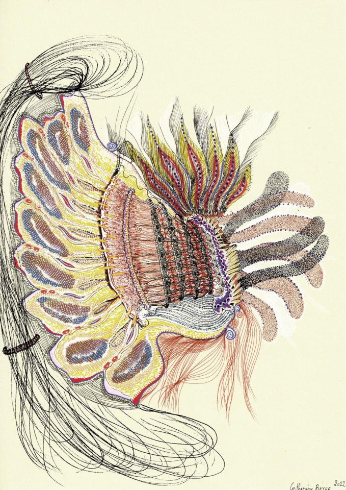 Stylo et crayons de couleurs sur papier Canson de couleur, 21 x 29,7 cm.
