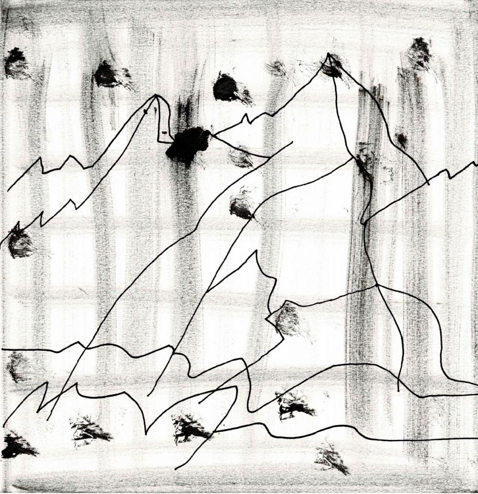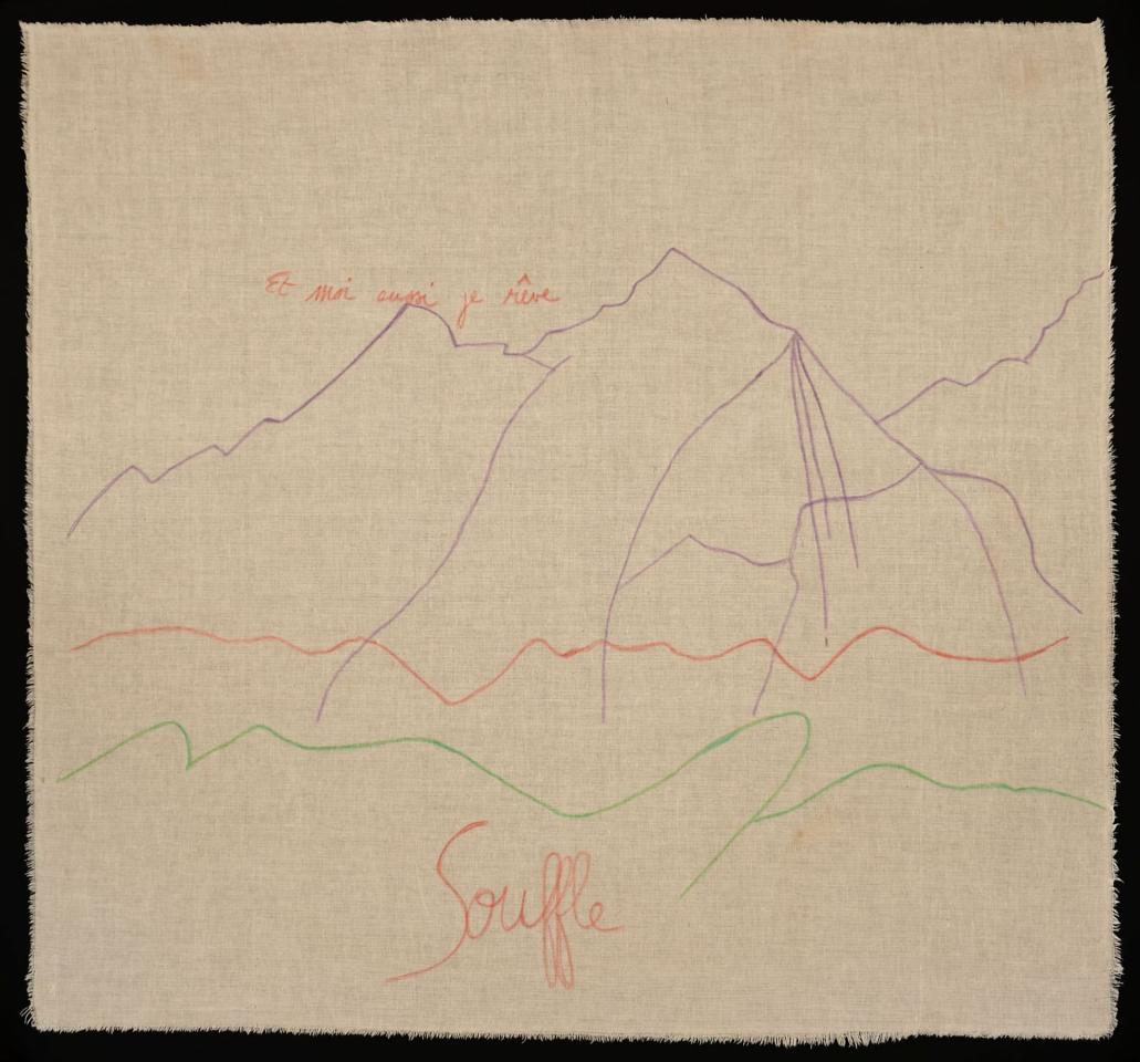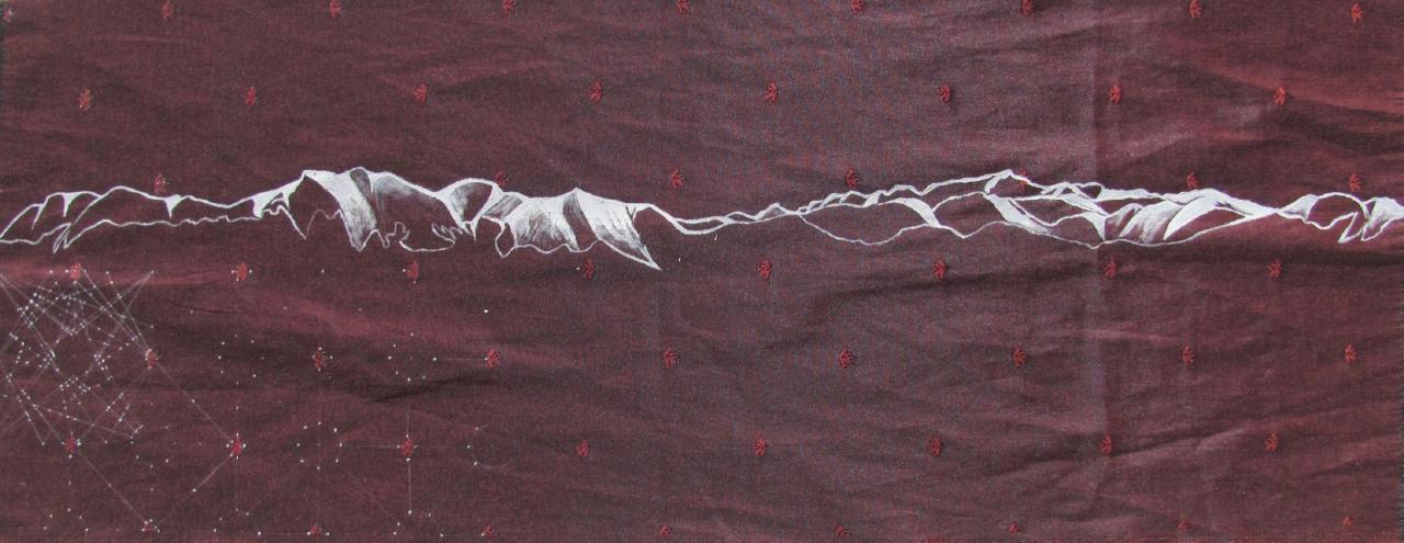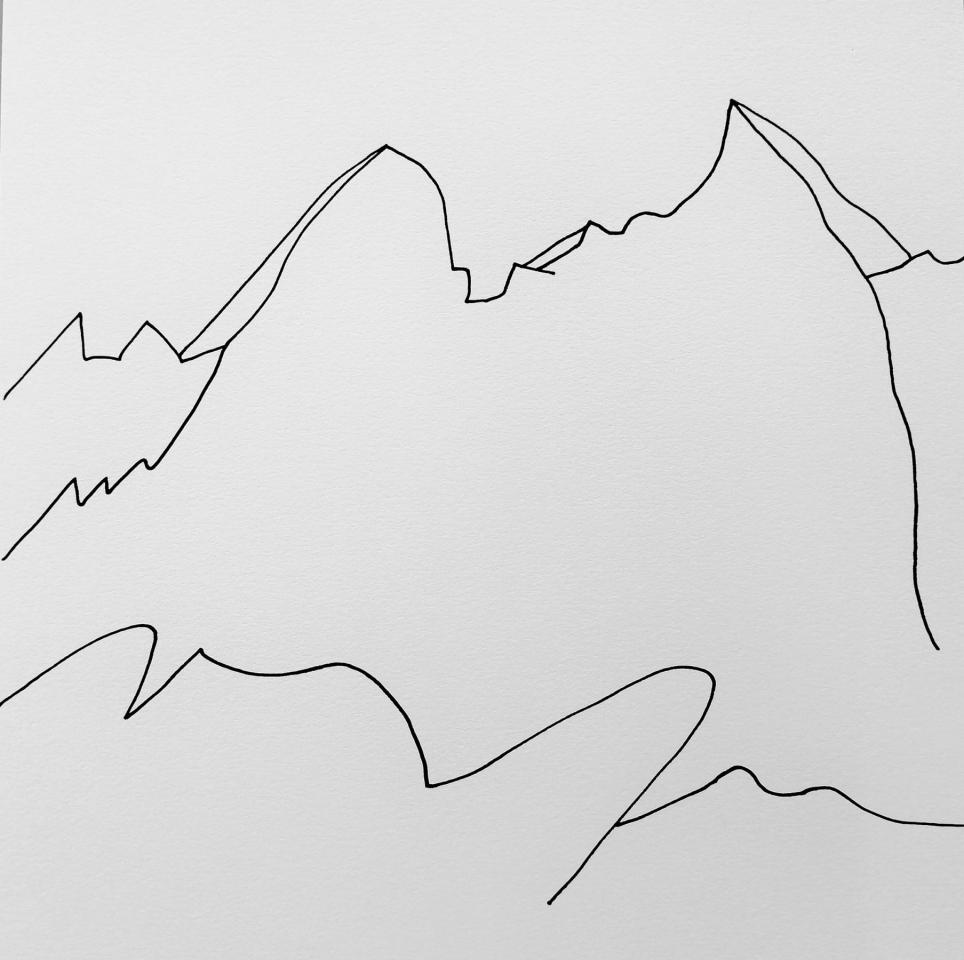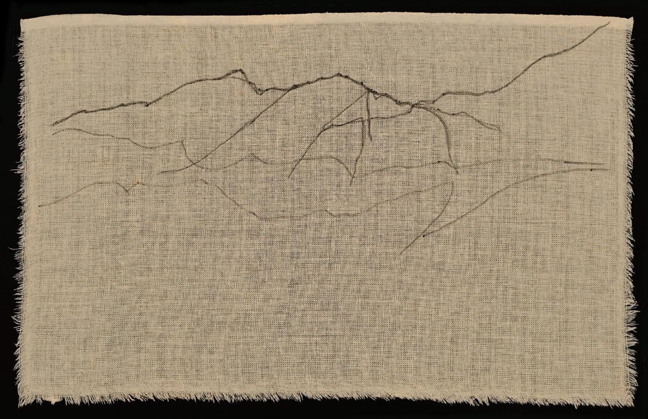 Ce travail est fait lors de marches le long du littoral, regard tourné vers les crêtes pour les dessiner et les reporter ensuite sur des toiles anciennes de coton de petits formats ou du papier Canson.