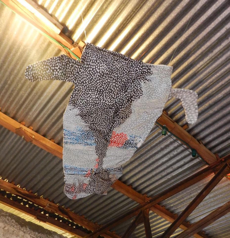 Au plafond : Des anges volent, sculptures textiles, vêtements ayant été portés, entiers, pliés (appartenant à l’artiste et à ses proches) cousus entre eux, armés par du fil de fer galvanisé, en partie peintes.