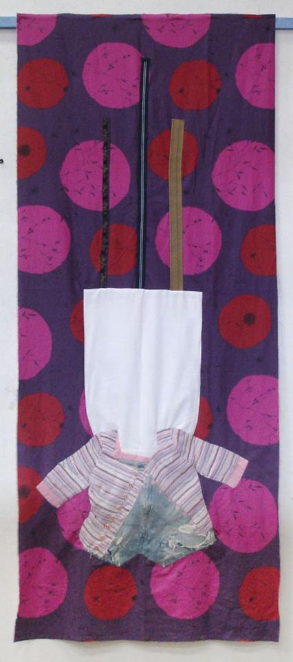 Aux murs : Appliqués de vêtements ayant été portés, pliés, sur tissus.
