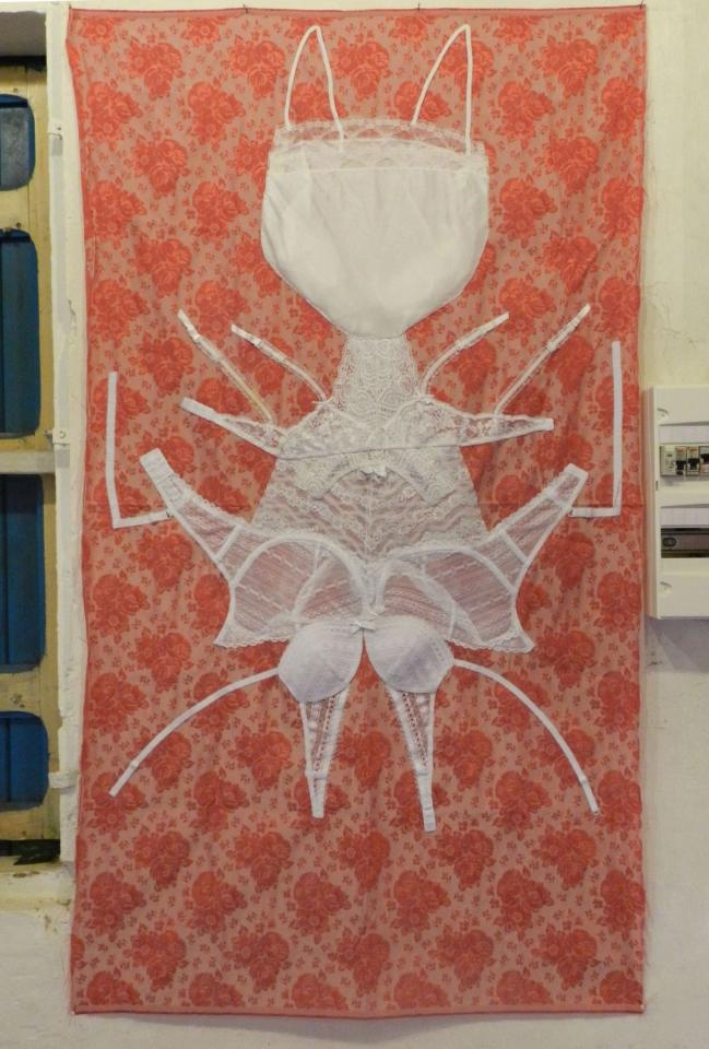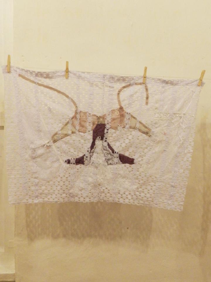 Appliqués de lingeries féminines ayant été portées sur voilages, sur tissus et appliqués de vêtements ayant été portés, pliés sur eux-mêmes, avec broderies et appliqués de dentelles découpées, dimensions variables.