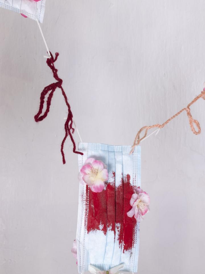 Nœuds, coutures, peinture acrylique, masques chirurgicaux, tresses de laine, fleurs en tissu et plastique, dimensions variables, maximum 300 x 150 cm.