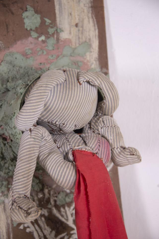 Ensemble de sculptures sans titre individuels, planche en bois, pot de peinture, peinture à l’huile, sable, poupée en tissu rembourré.