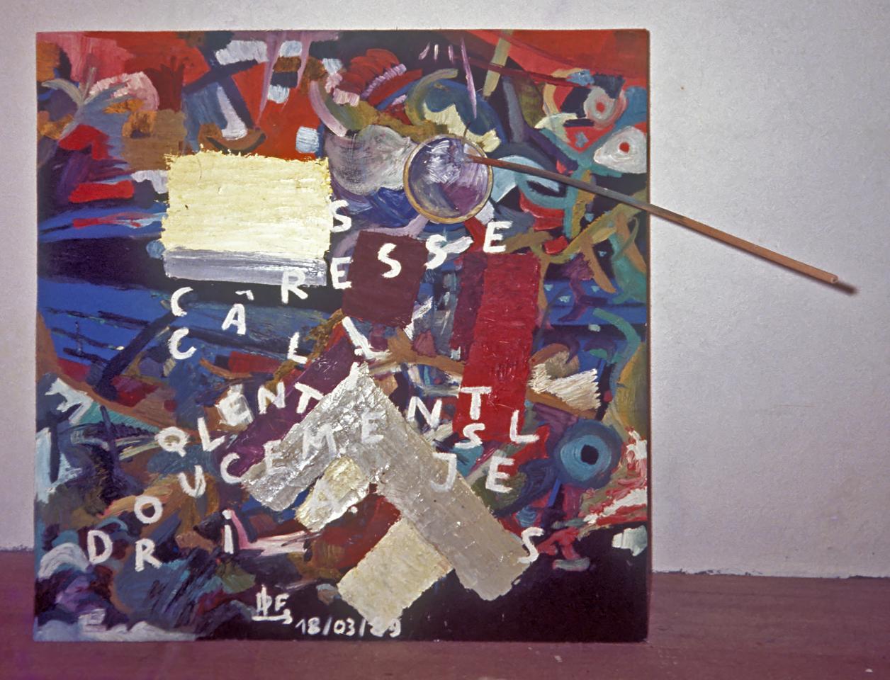 Technique mixte, huile sur bois, tige, tube en carton, couvercle en plastique, 83,5 x 83,5 cm.