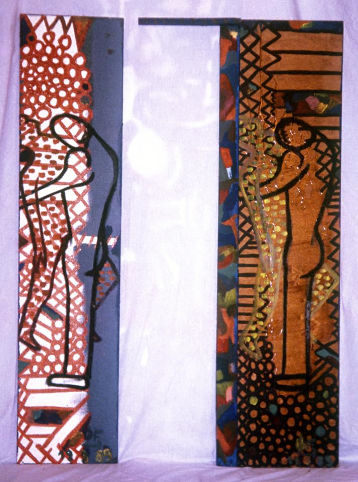 Diptyque, huile sur bois, tige de bois clouée peinte, 60 x 20 cm chacune.