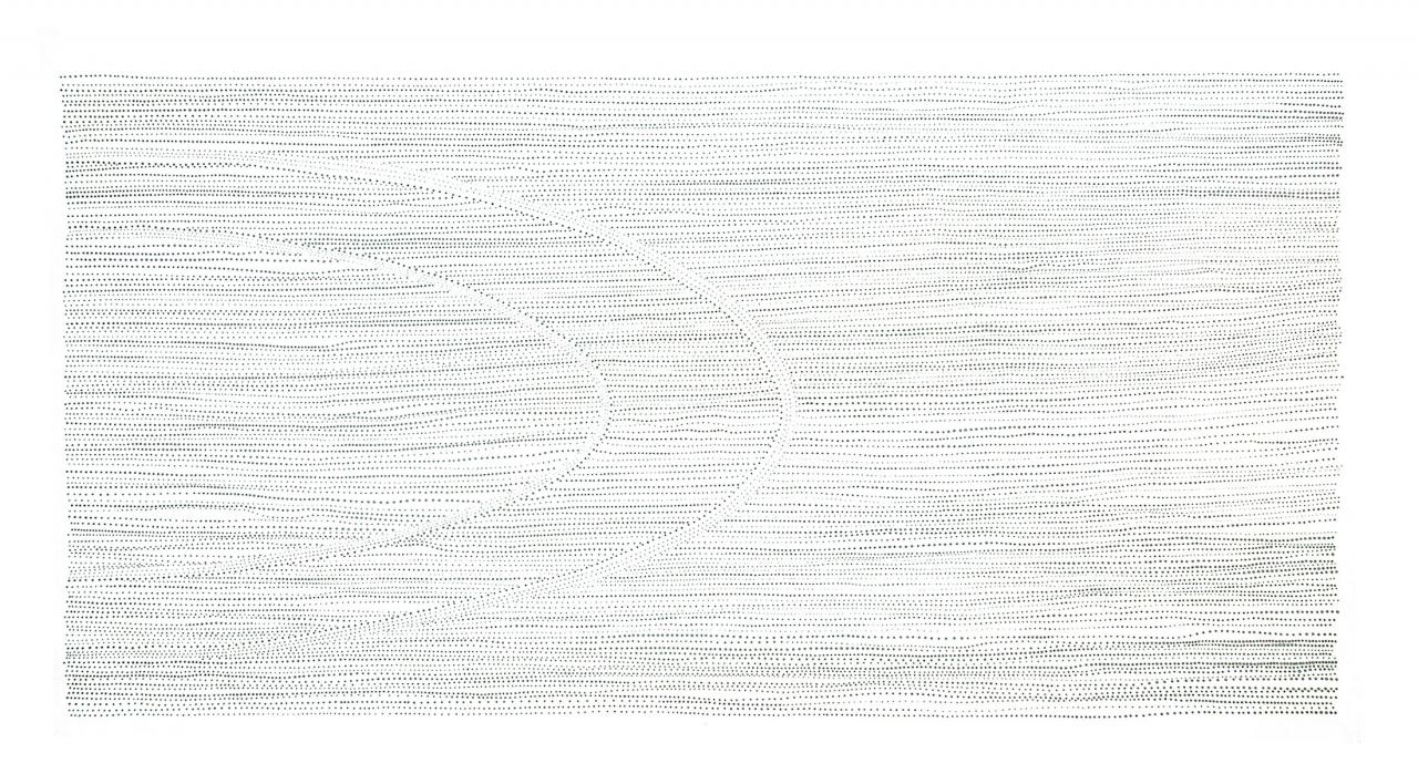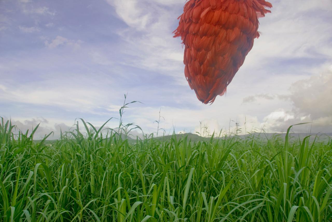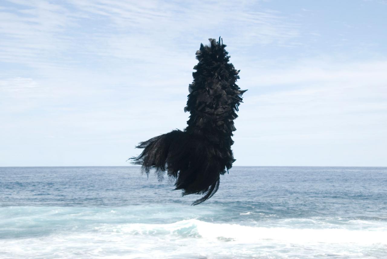 Plumes de coq sur bois et polystyrène, largeur 172 cm.