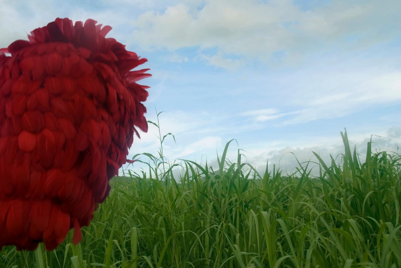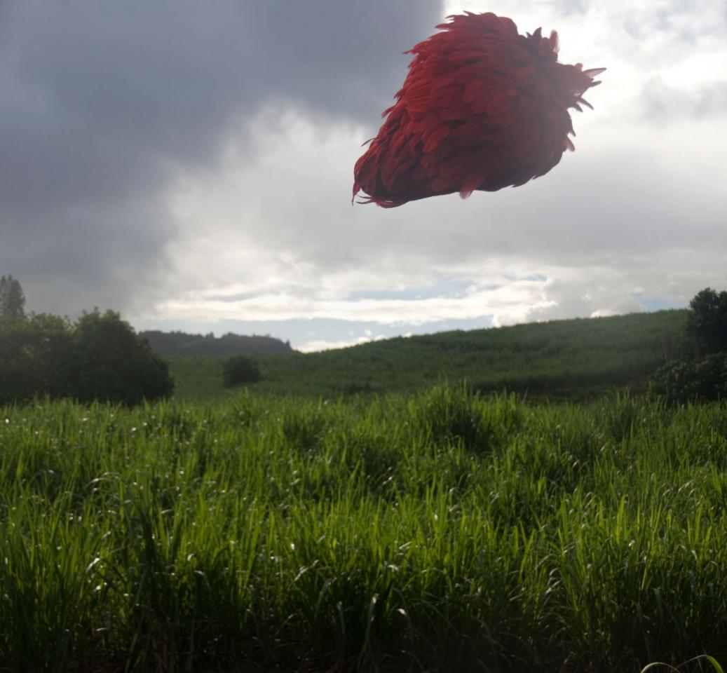 Ouvrage en plumes de coq, hauteur 60 cm.