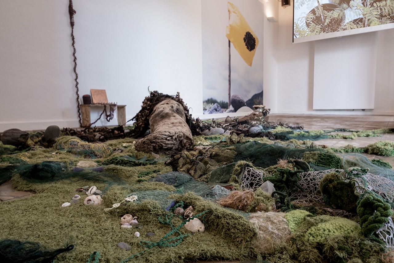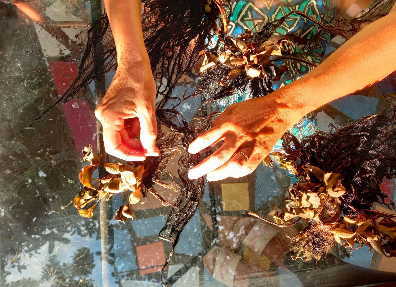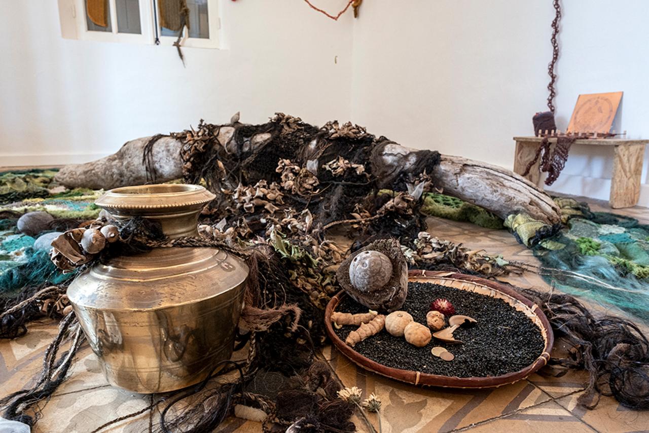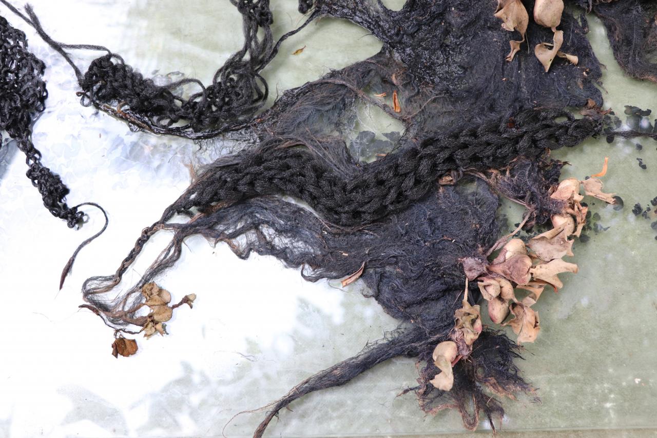 Installation, racines et tiges séchées de pensées d’eau, mèches de cheveux naturels et synthetiques, laines, éponges usagées, sachets de thé usagés, bois flotté, sable et galets de bord de mer, terre, cruche en cuivre, plaque gravée en cuivre, mandareuse, bocal en verre, coquilles d’escargots, nattes.