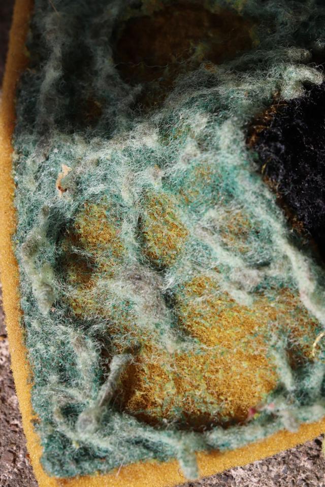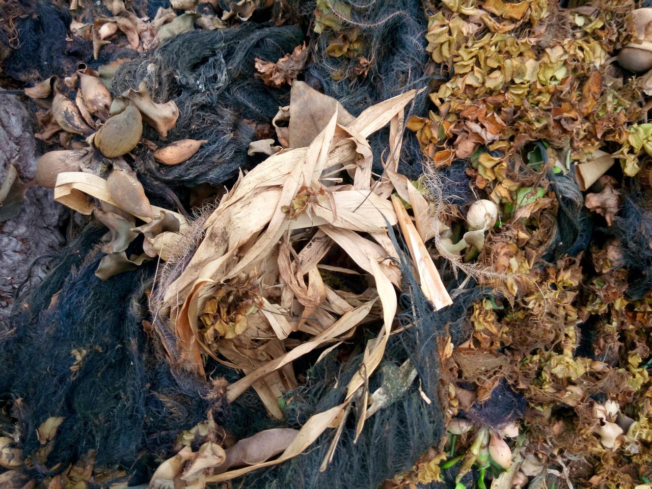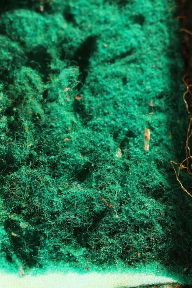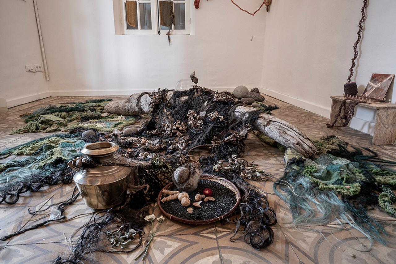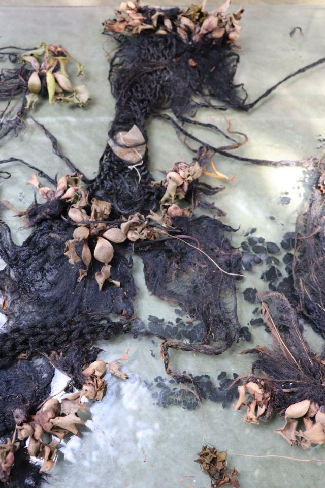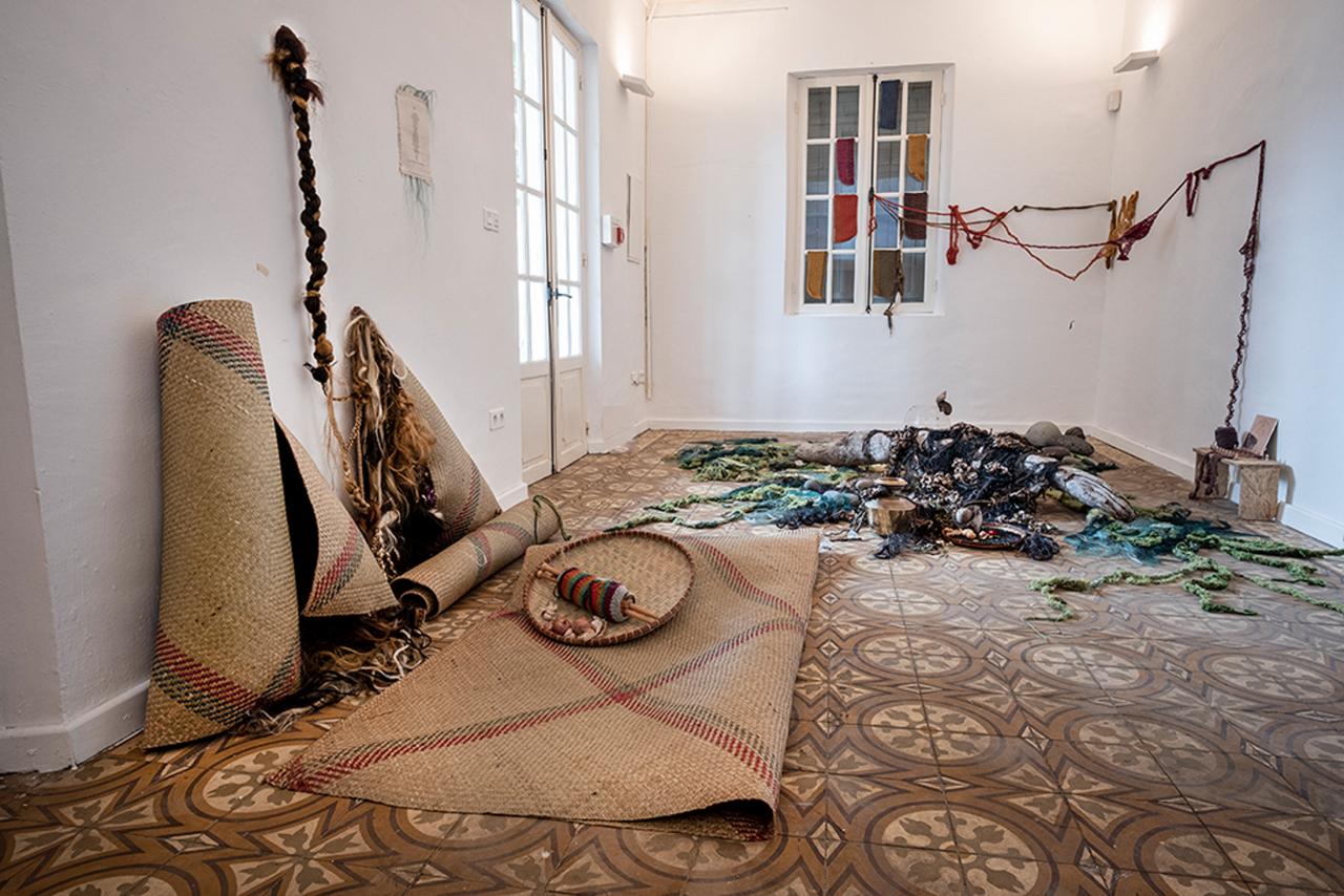 Installation, racines et tiges séchées de pensées d’eau, mèches de cheveux naturels et synthetiques, laines, éponges usagées, sachets de thé usagés, bois flotté, sable et galets de bord de mer, terre, cruche en cuivre, plaque gravée en cuivre, mandareuse, bocal en verre, coquilles d’escargots, nattes.