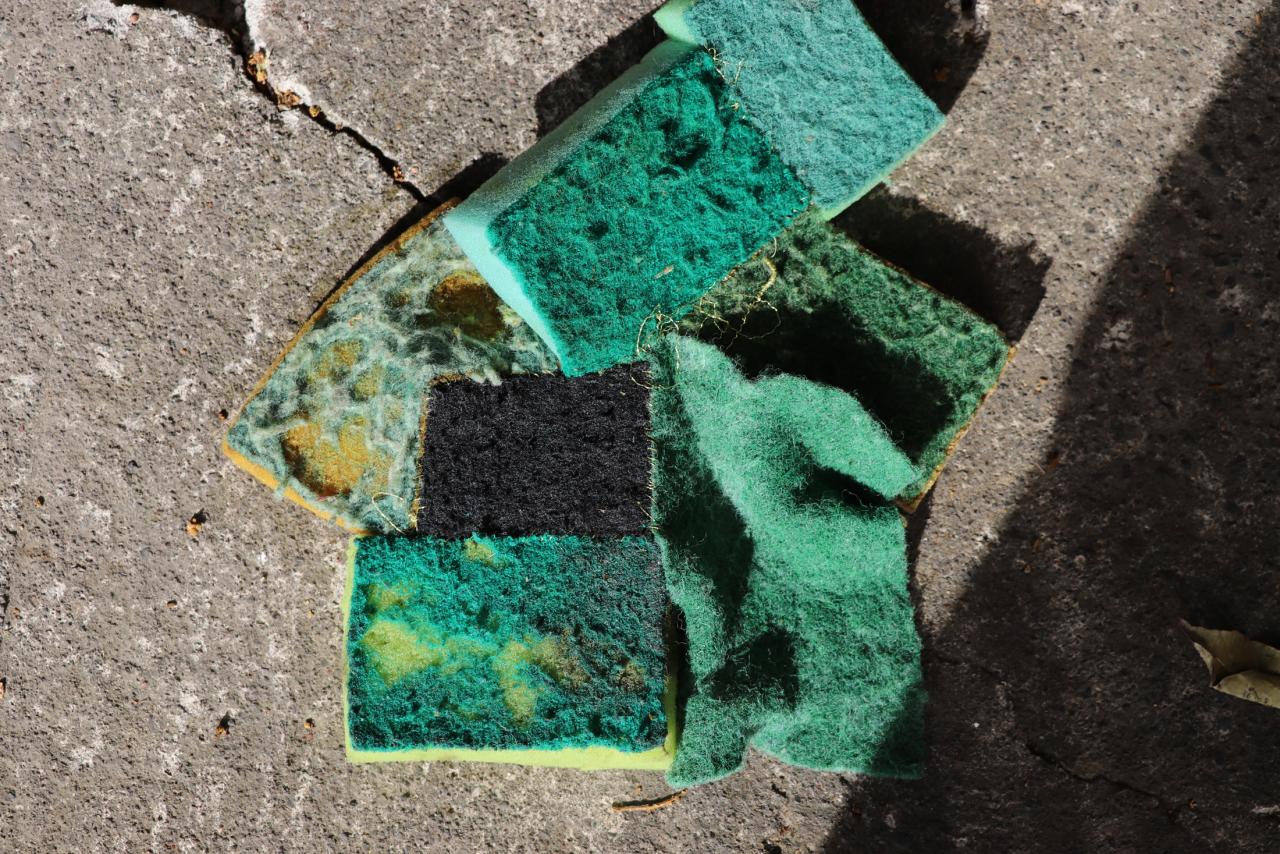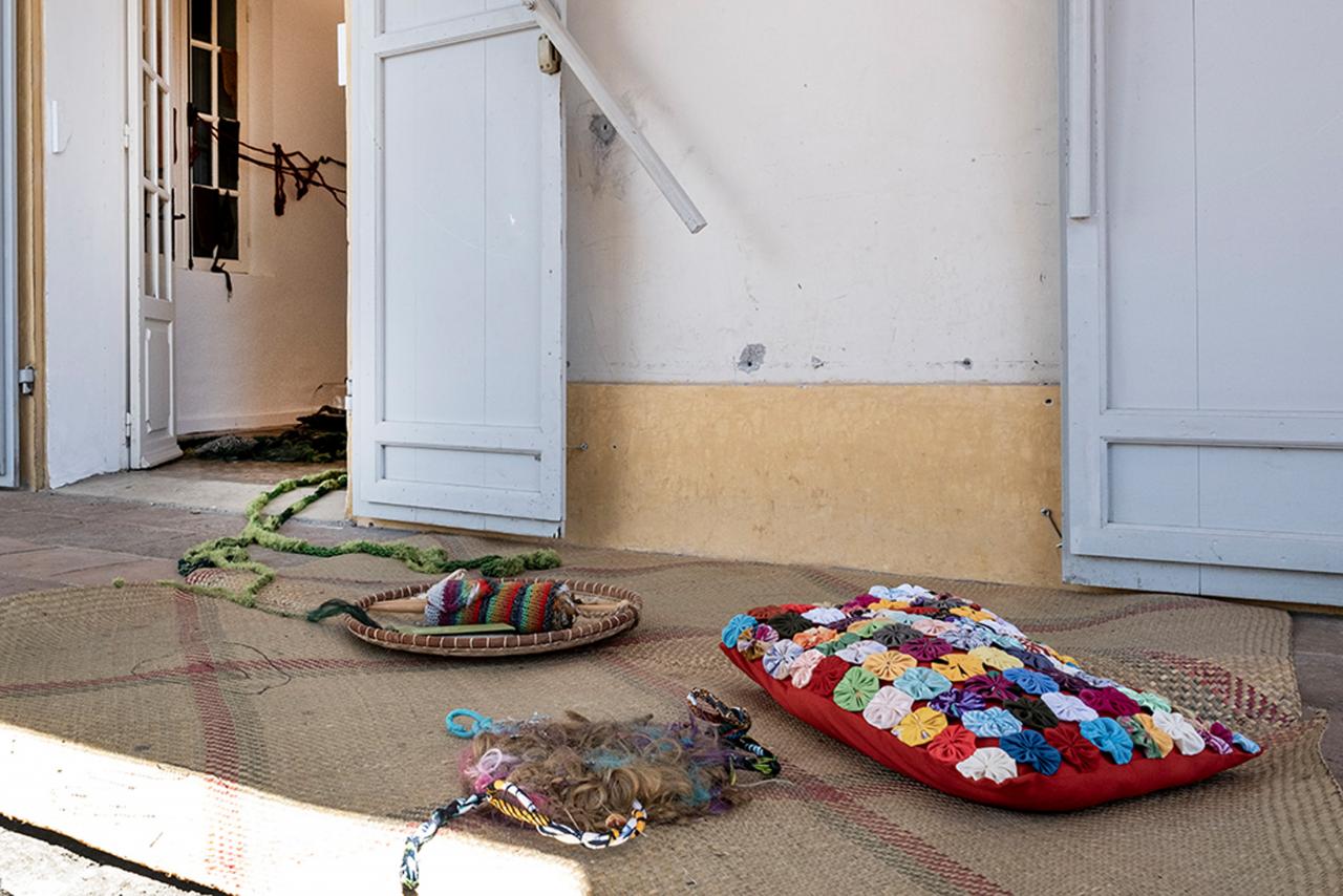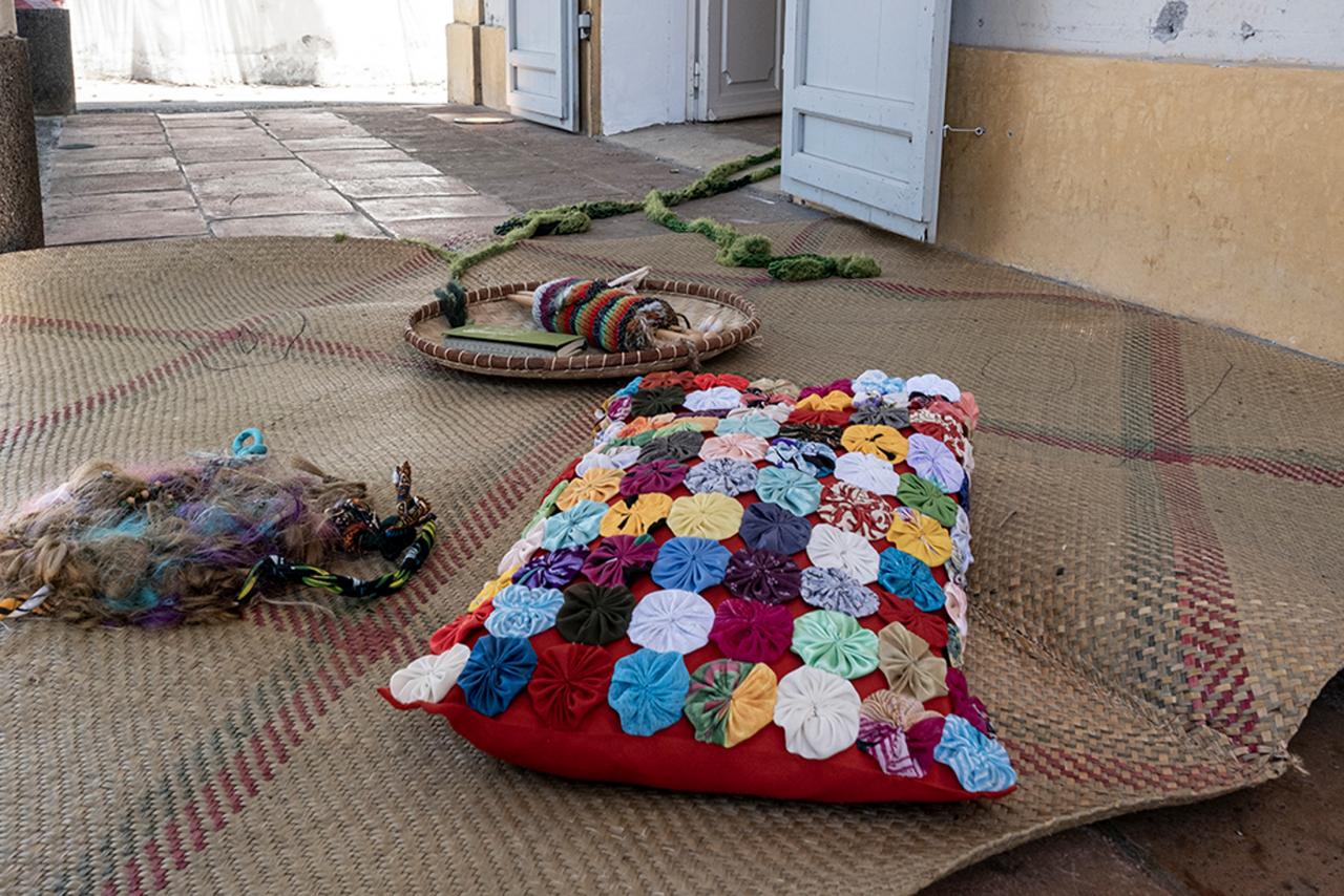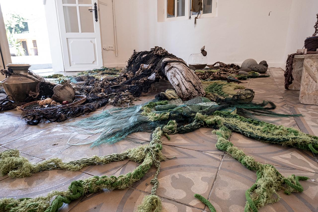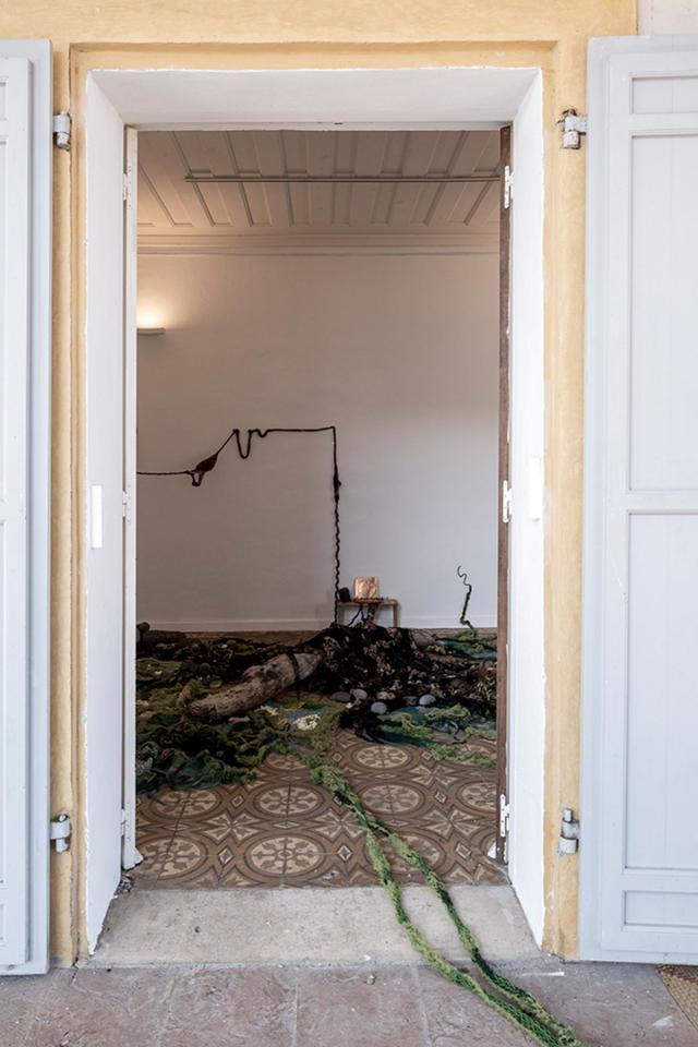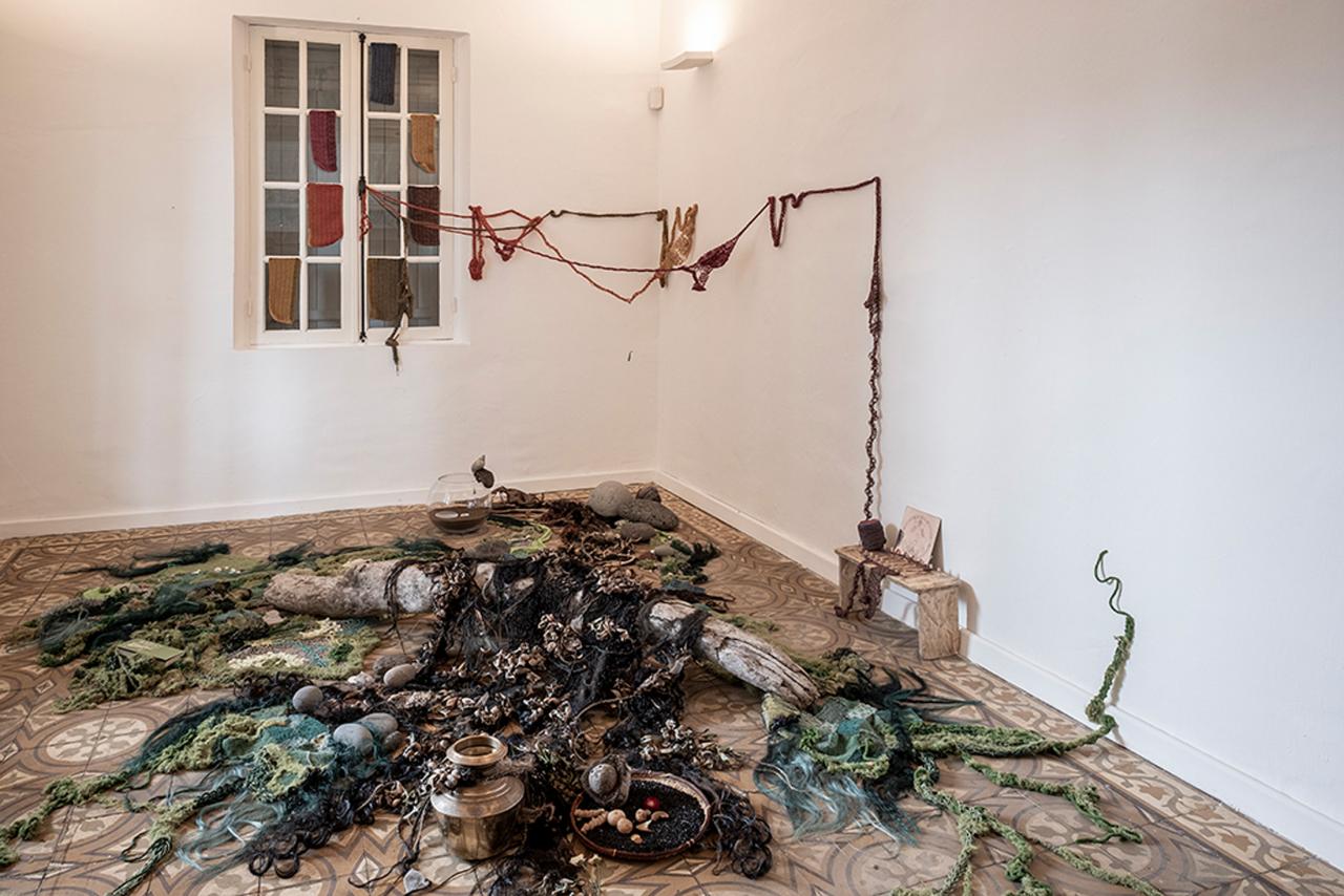 « (…) Le ron fanm de Kazkabar — communauté de féminités plurielles1 —, joue un rôle central. Les gestes manuels s’y répètent et se transmettent (ramasser, sécher, pétrir, retourner, tresser) jusqu’à donner vie aux œuvres. Etandû, Etandî, Etandô, Etandard (2021) en est un exemple. L’installation interconnectée par des fragments de tricot se compose d’une agrégation de matériaux naturels et artificiels témoignant d’une attention constante au « déjà-là ». Les racines, tiges et oignons de pensées d’eau — plantes envahissant l’étang de Saint-Paul —, s’entremêlent aux rebuts domestiques du quotidien recueillis. Le nettoyage des objets glanés crée un glissement perceptif : les racines et tiges prennent l’apparence de chevelures texturées, la face rugueuse des éponges rappelle de la mousse végétale et les mèches de cheveux synthétiques, de l’humus ou des branchages humides. Les matières rejetées ou envahissantes mutent et se régénèrent sous l’impulsion des gestes de soin. (…) »