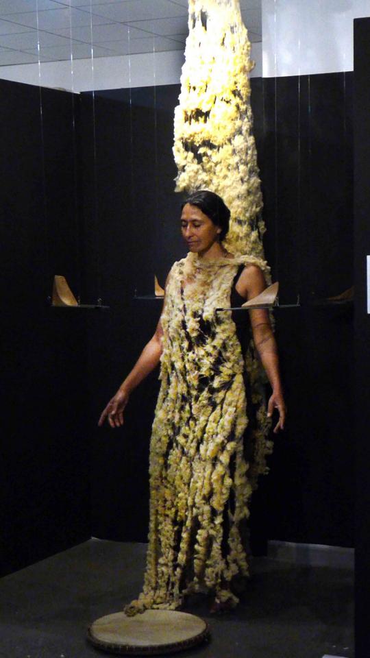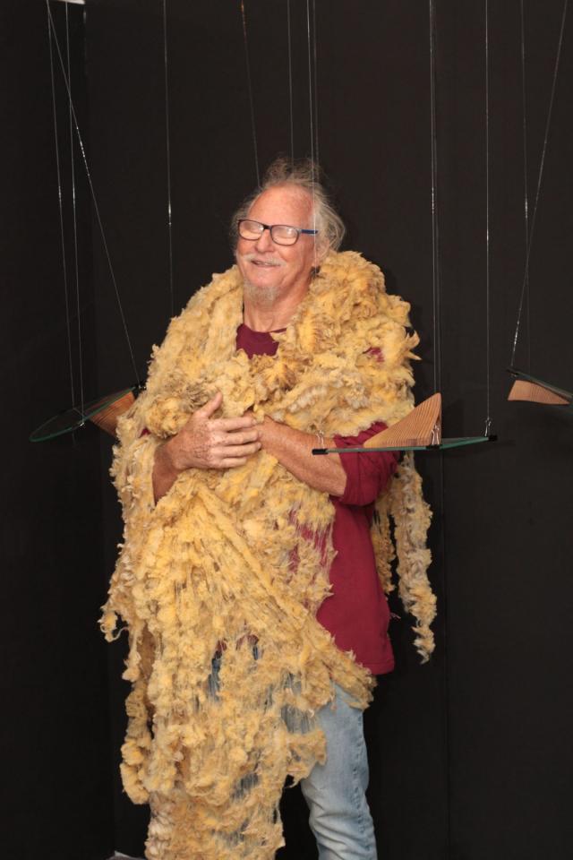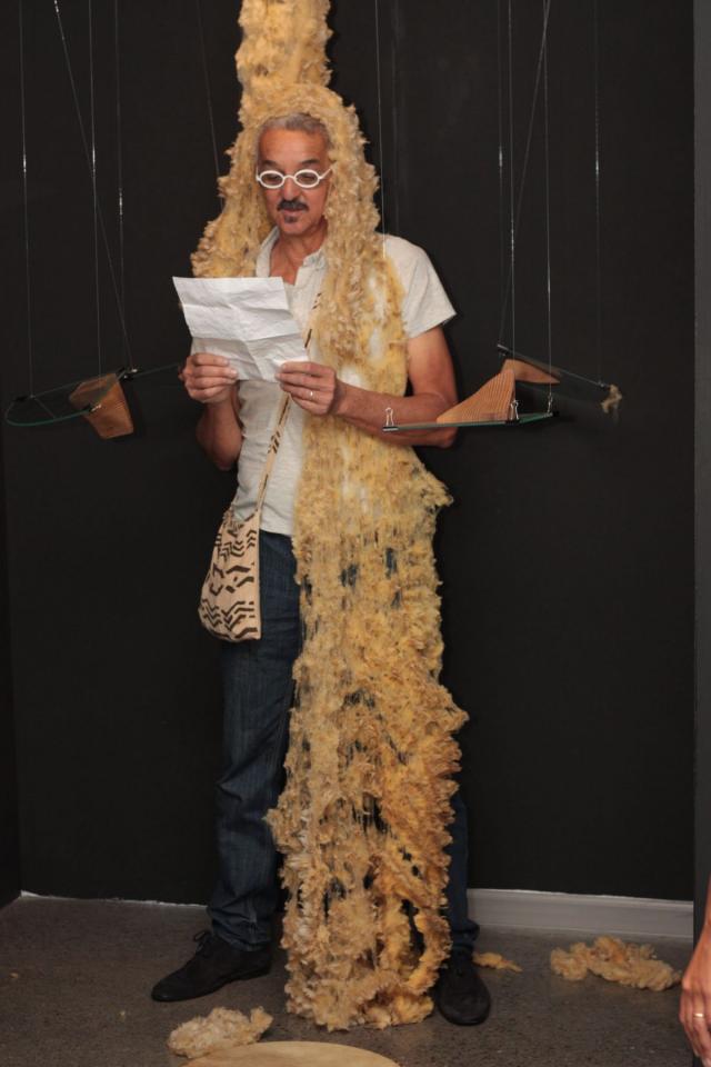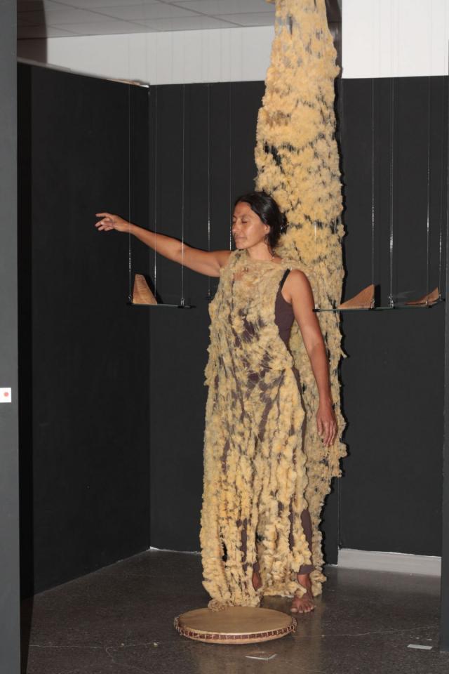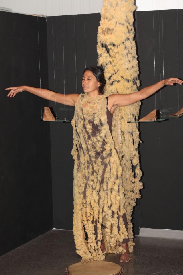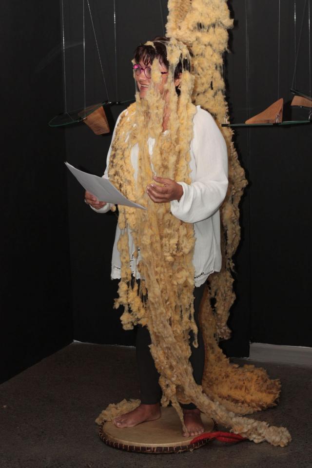 Performance participative, tambour malbar, fil de pêche, angles en verre, laine de mouton brute, angles de bois sculptés et polis, plaque de cuivre gravée.