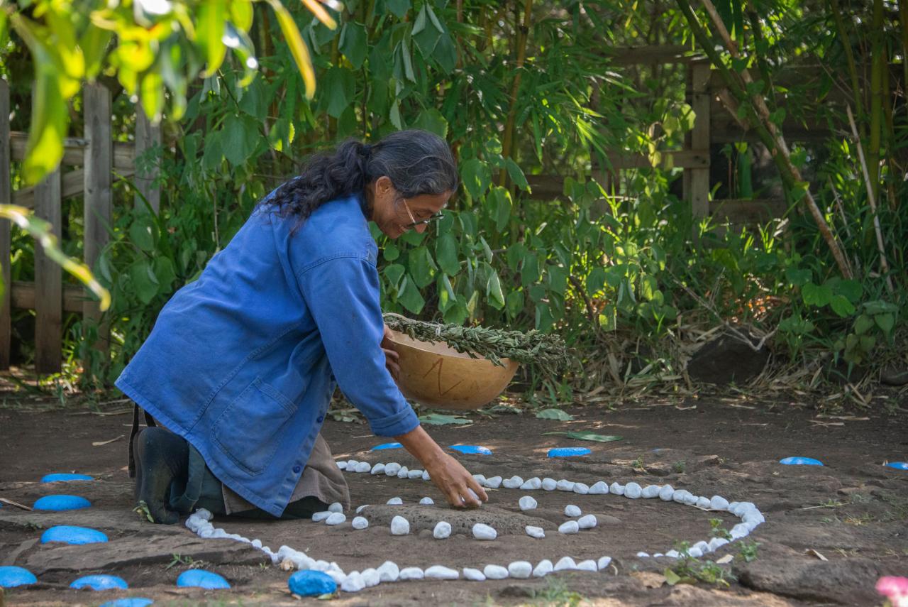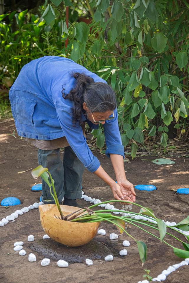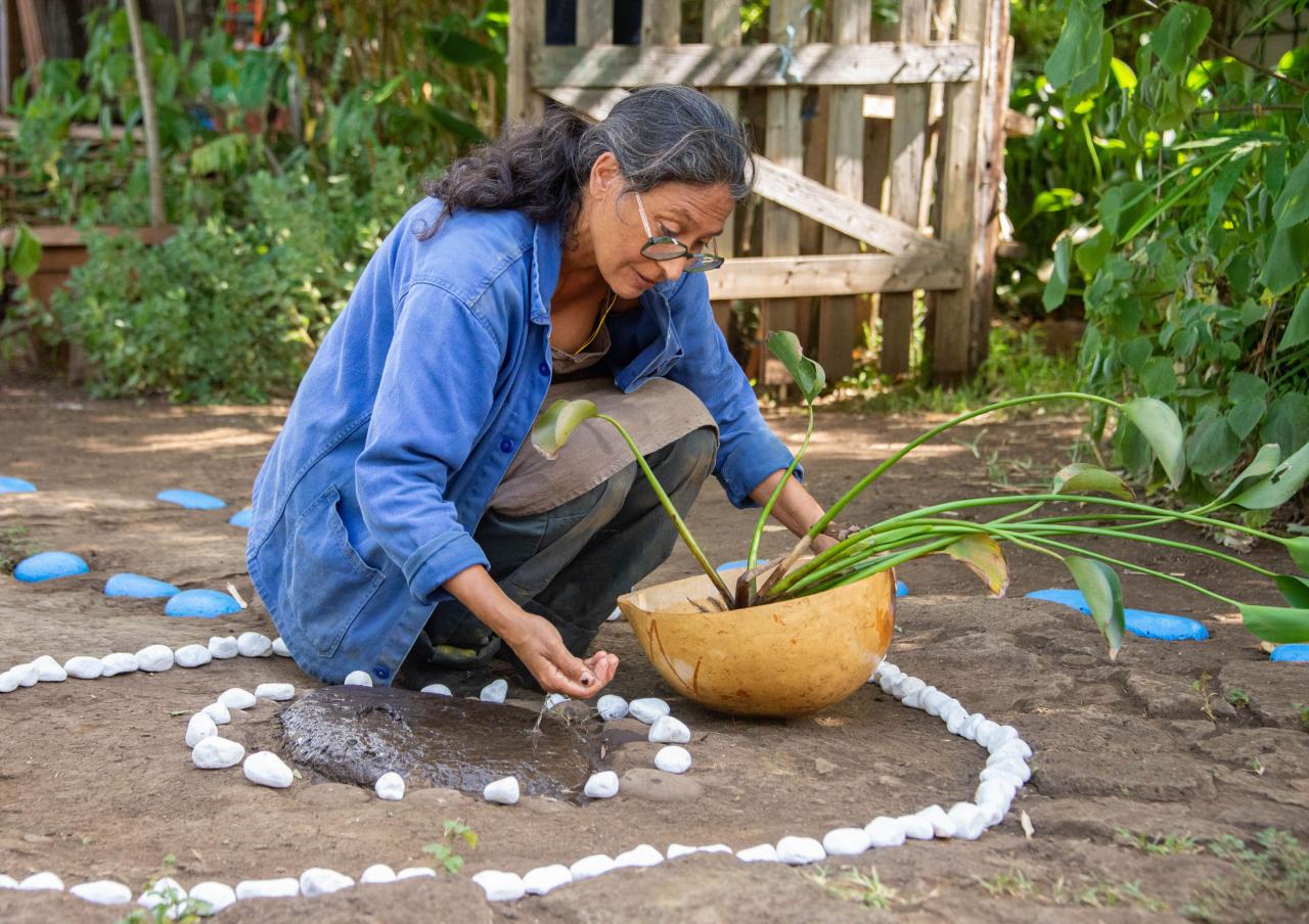 Geste 3 : Je vais prendre de l’eau au bassin, je ramasse en même temps un plant de pensées d’eau, je baigne et je berce les germes d’yeux
