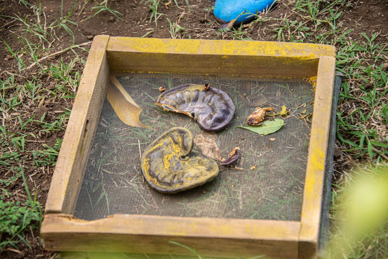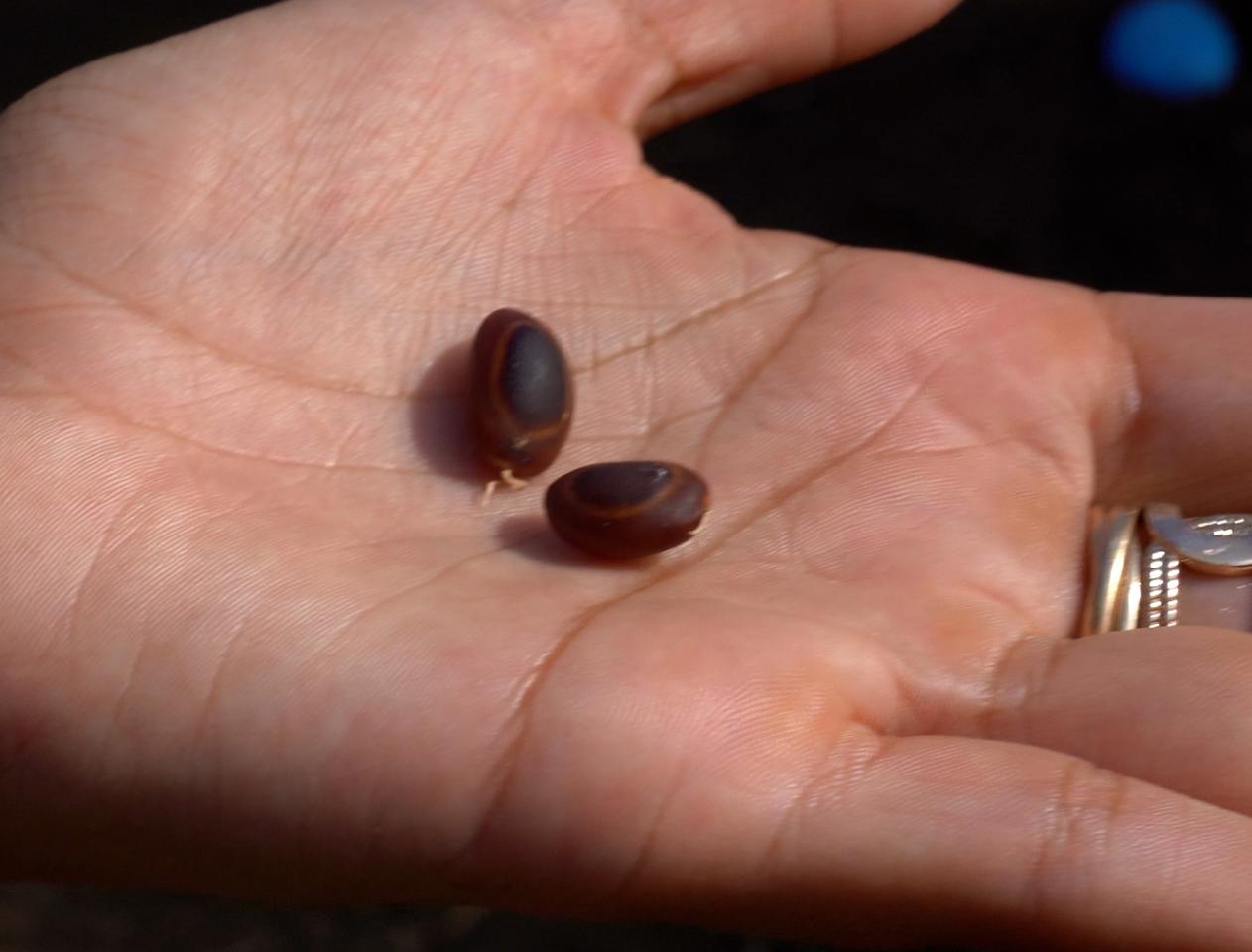 Dans la gousse cueillie sur l’arbre Zorey kaf (Enterolobium cyclocarpum), on trouve des graines qui ressemblent à des yeux.