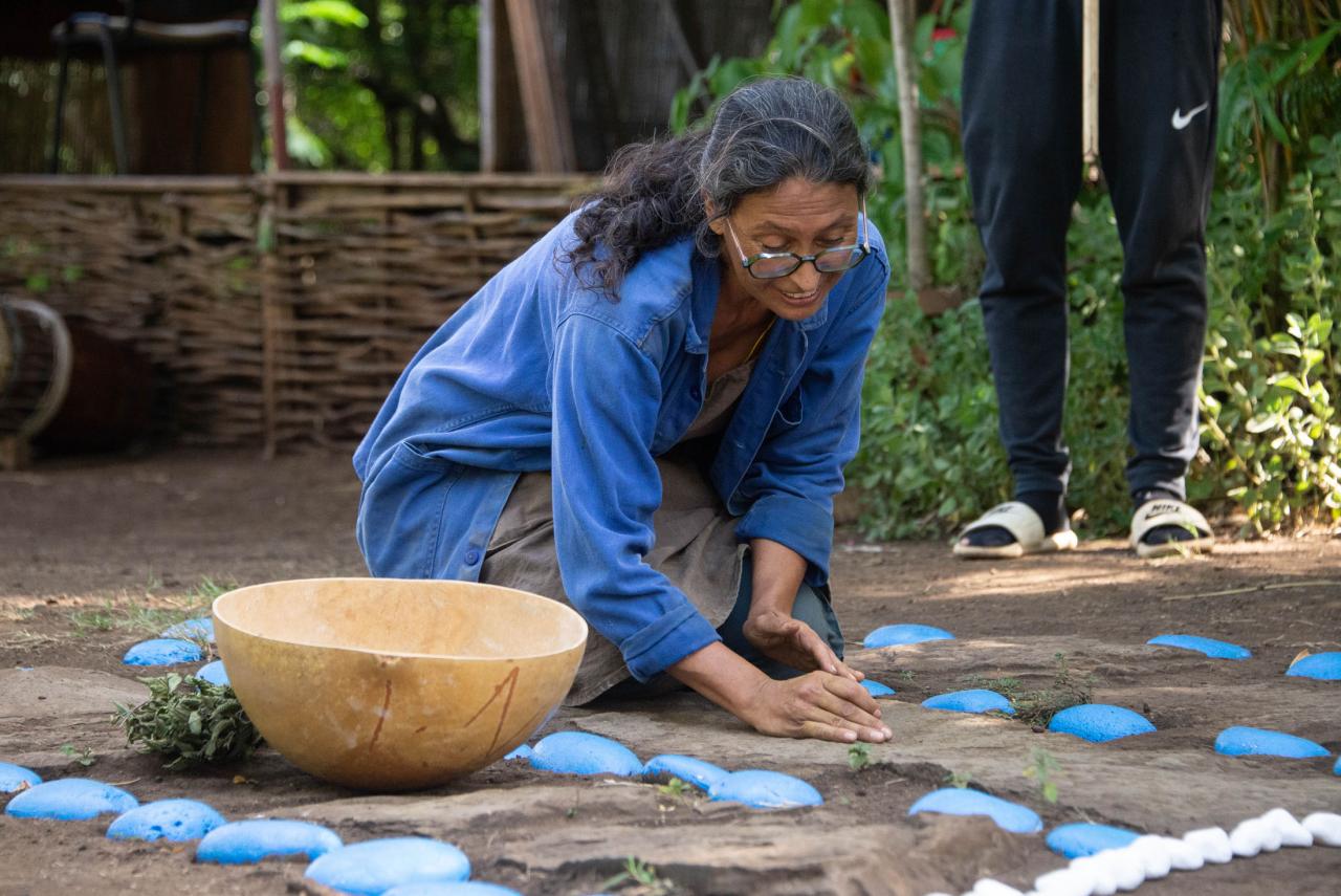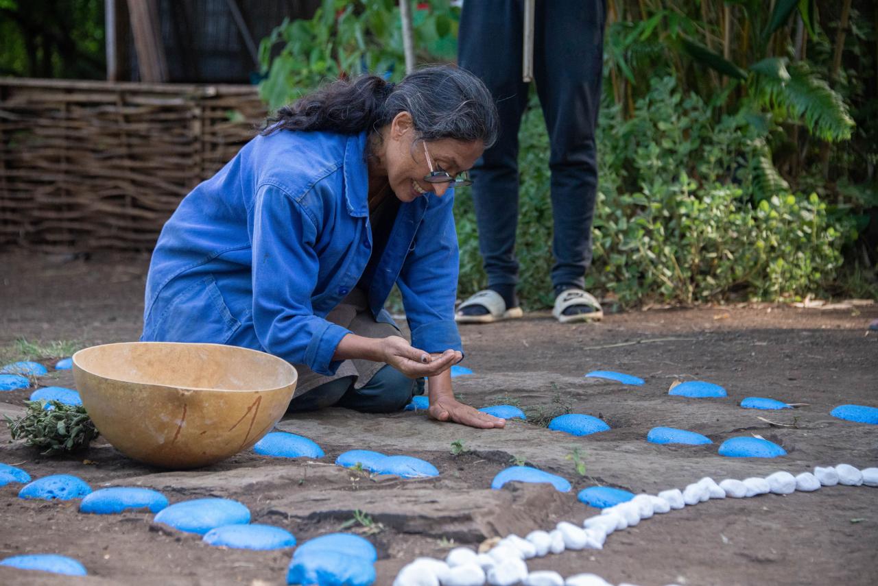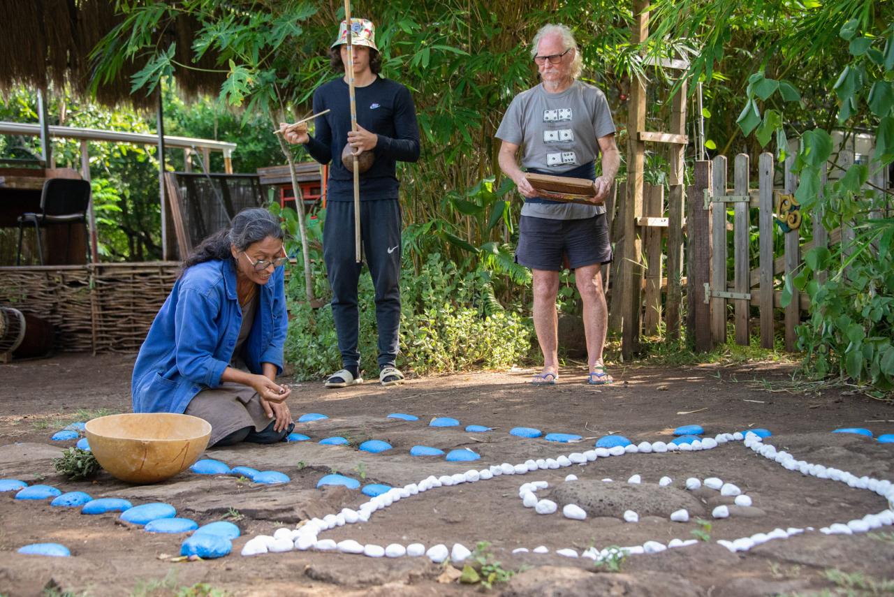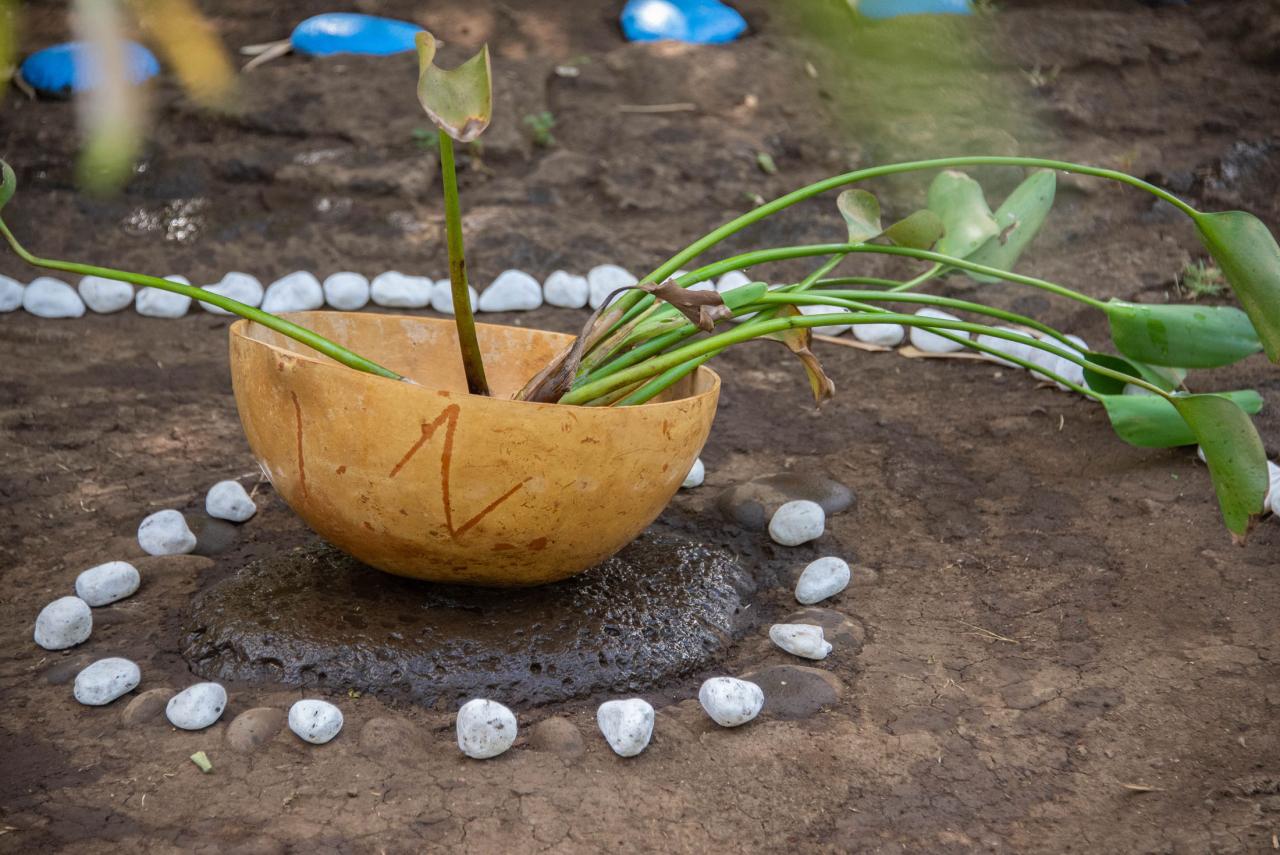 Matériel : un balai de tiges de coco, une brosse, des galets bleus, des petits cailloux blancs, une paille pour faire déborder l’œil, un rouleur(tambour )