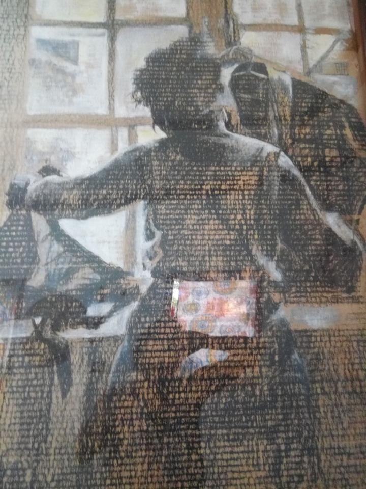 Désin dési kartron, bout sarbon, pintir blan, 115 x 61 cm.