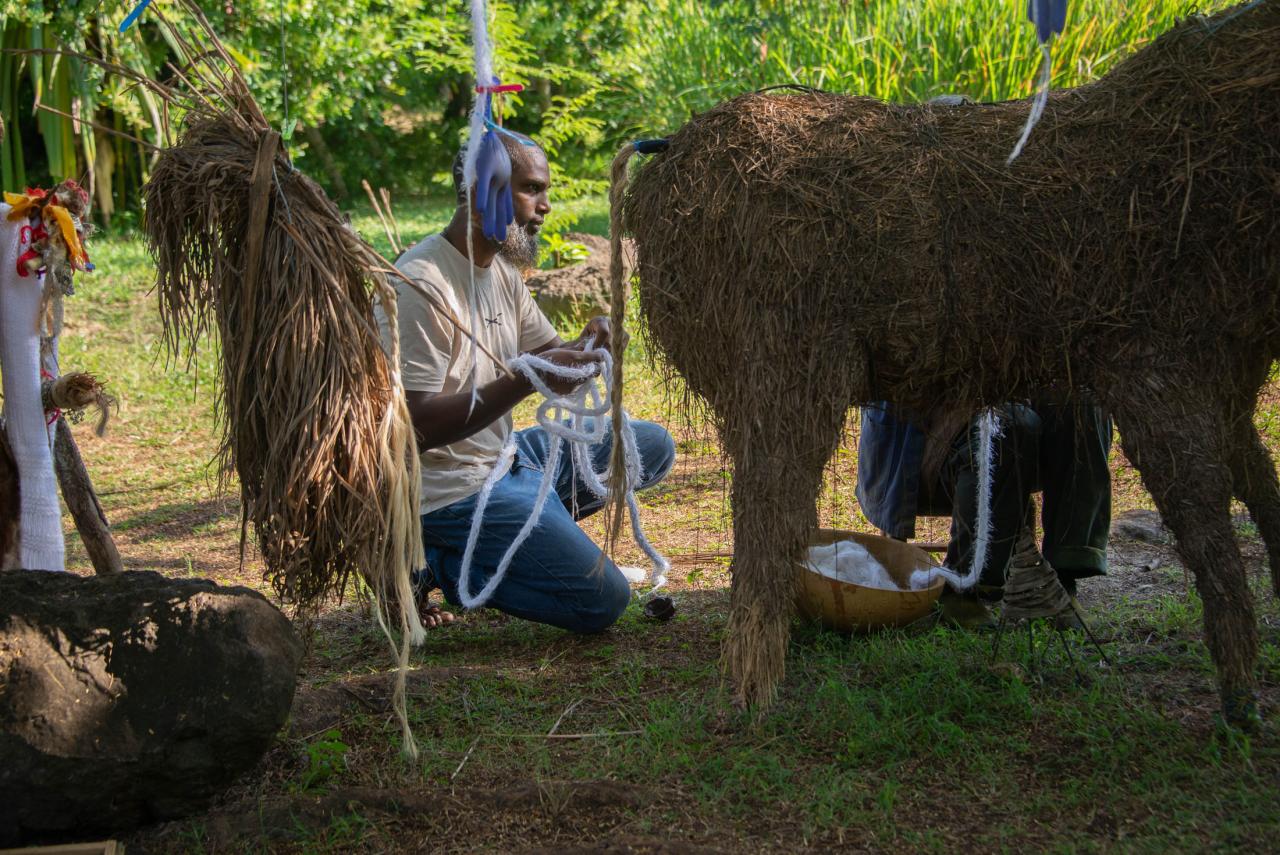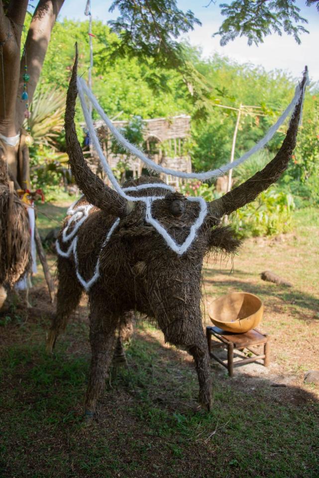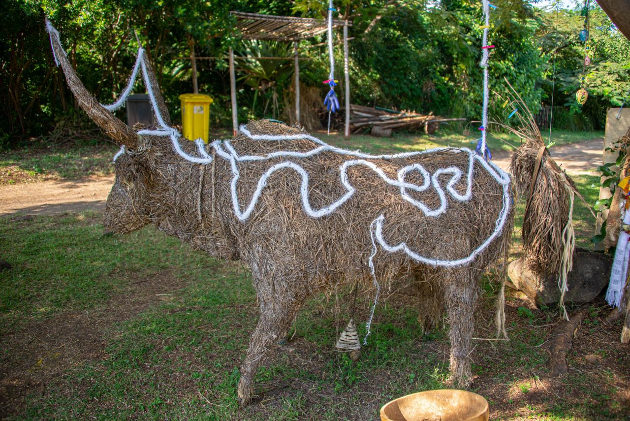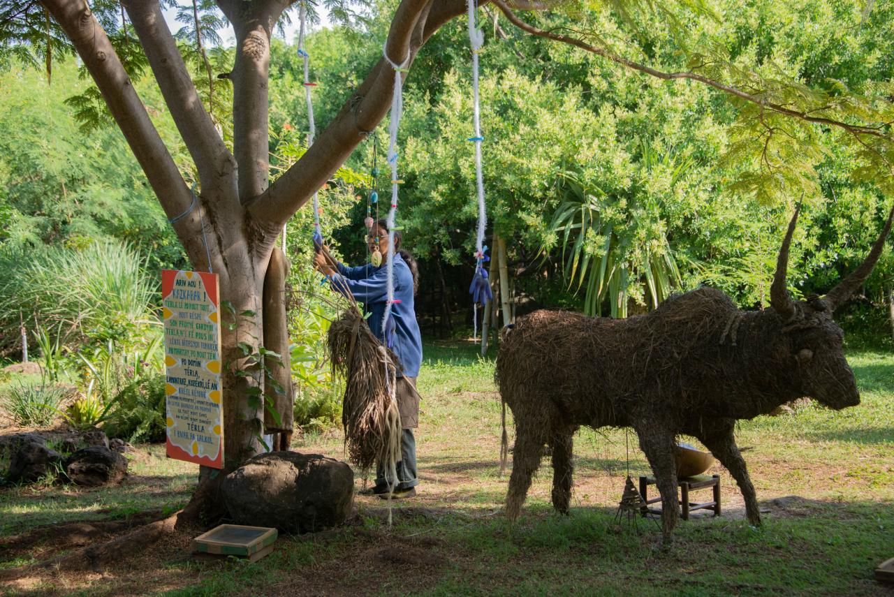 « (…) Si la ravine évoque un phénomène d’érosion naturel créant une faille visible dans le paysage, elle est aussi source de mémoire. Intrinsèquement liée à l’histoire de l’esclavage et au marronnage puisque les « fugitif·ves » se cachaient dans ces espaces escarpés difficiles d’accès, Féliks souligne que des pratiques marronnes contemporaines y perdurent. Dans l’Hommage au gardien bœuf (2021), l’installation honore son voisin décédé Gabriel, un poète-chanteur gardien de bœufs Moka5 . Composée de bois et de paille, elle incorpore des éléments symboliques du gardien (chapeau vacoa, diabolo, pinces à linge, corne de bœuf…). Souvent stigmatisés et assimilés à des pratiques de vagabondages, les gardiens de bœufs sont pourtant les garants d’un savoir transmis par l’oralité comme l’ont été les marron·nes plus ancien·nes. À Vassivière, l’artiste a rassemblé les visiteur·euses lors d’un rituel de purification créé à partir d’urine de bœuf collectée auprès d’éleveur·euses locaux·les6 . Des gestes protecteurs pour faire actes et traces de blessures encore vives. (…) »