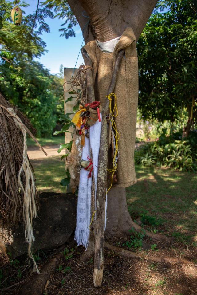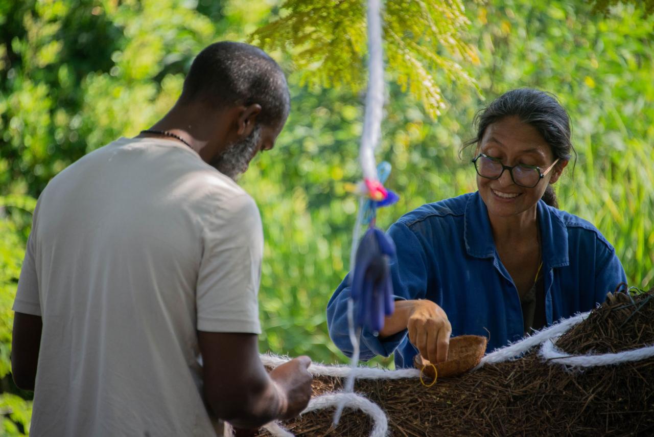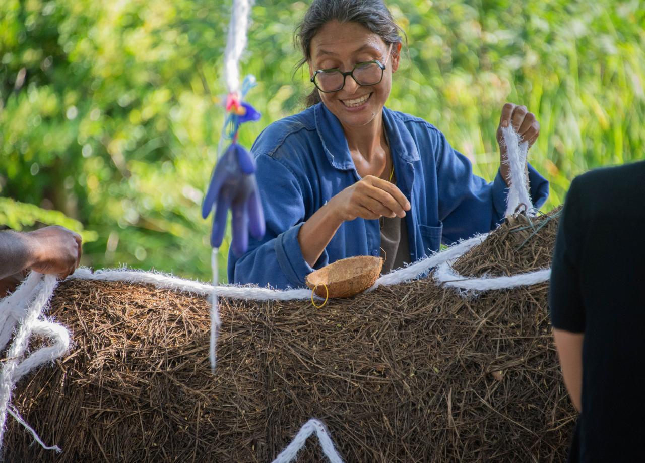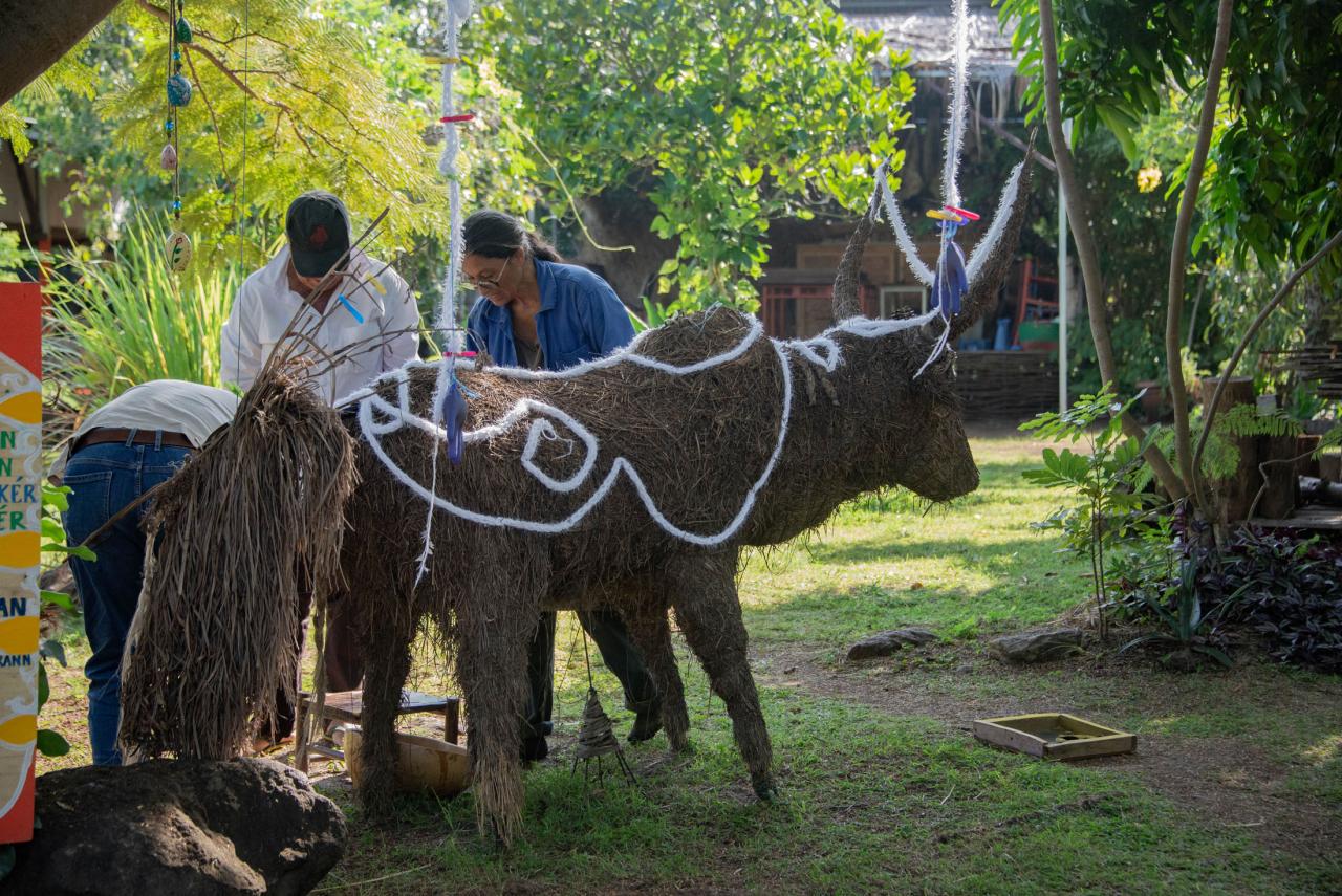 « (…) Si la ravine évoque un phénomène d’érosion naturel créant une faille visible dans le paysage, elle est aussi source de mémoire. Intrinsèquement liée à l’histoire de l’esclavage et au marronnage puisque les « fugitif·ves » se cachaient dans ces espaces escarpés difficiles d’accès, Féliks souligne que des pratiques marronnes contemporaines y perdurent. Dans l’Hommage au gardien bœuf (2021), l’installation honore son voisin décédé Gabriel, un poète-chanteur gardien de bœufs Moka5 . Composée de bois et de paille, elle incorpore des éléments symboliques du gardien (chapeau vacoa, diabolo, pinces à linge, corne de bœuf…). Souvent stigmatisés et assimilés à des pratiques de vagabondages, les gardiens de bœufs sont pourtant les garants d’un savoir transmis par l’oralité comme l’ont été les marron·nes plus ancien·nes. À Vassivière, l’artiste a rassemblé les visiteur·euses lors d’un rituel de purification créé à partir d’urine de bœuf collectée auprès d’éleveur·euses locaux·les6 . Des gestes protecteurs pour faire actes et traces de blessures encore vives. (…) »
