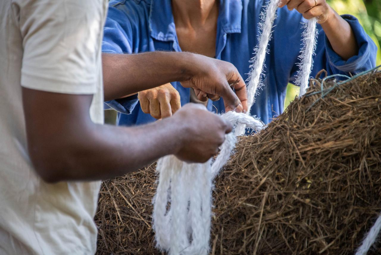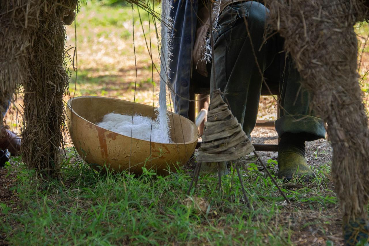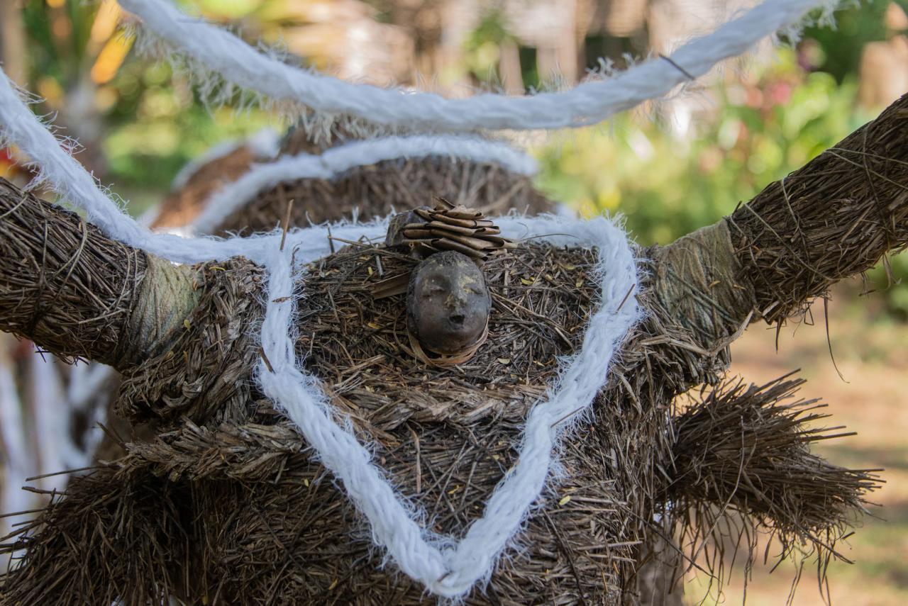 Geste 2 : Soigner le gardien-bœuf : achever de tresser la queue de paille, décorer le bœuf d’un marlé de laine blanche
