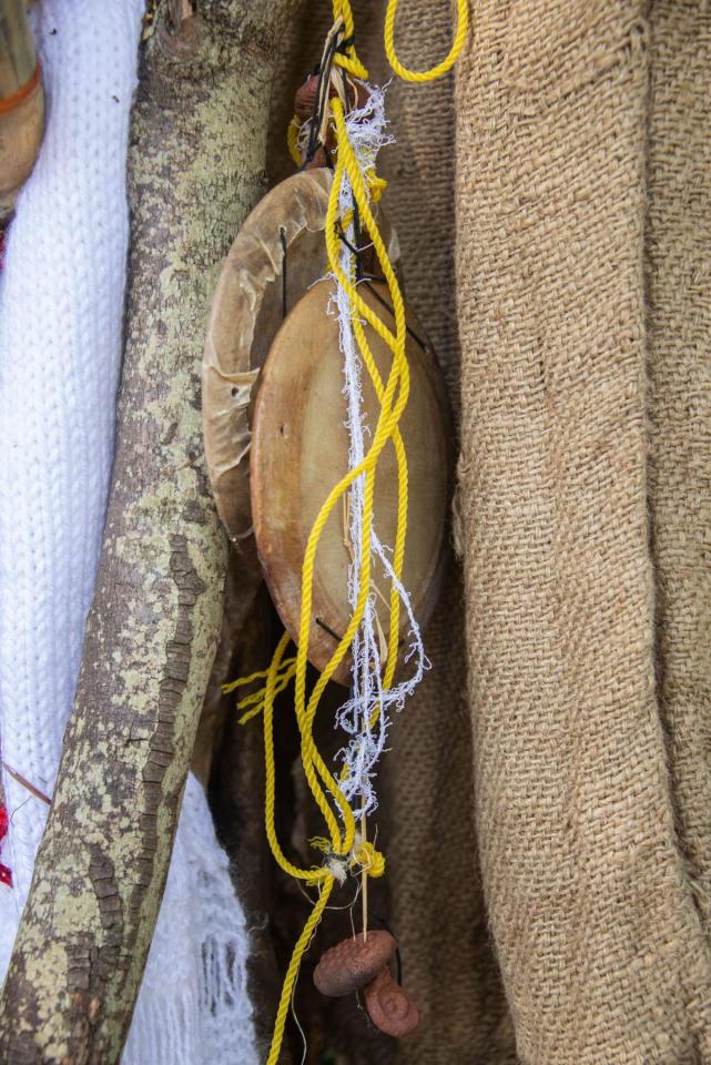 4. oulké: petit tambour à double peaux très fines (encore appelé bobine) que l’on retrouve dans les representations de Shiva mais dans bien d’autres civilisations. On s’en sert à La Réunion pour appeler l’esprit ou l’ancêtre sur une personne et nouer le dialogue. Chez les dogons le dieu de l’eau (Nomo) a ses oreilles disposées une vers la terre, l’autre vers le ciel, et enseigne à l’homme la technique du tressage du tambour en même temps qu’il transmet les connaissances des liens entre la terre et le ciel.