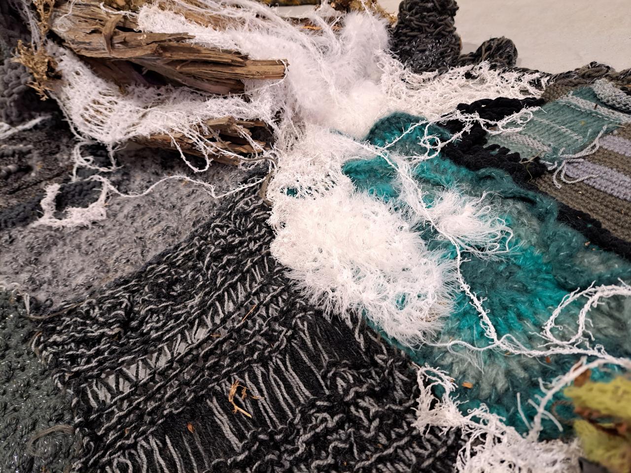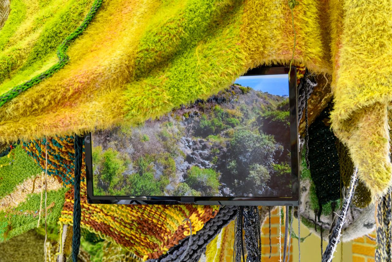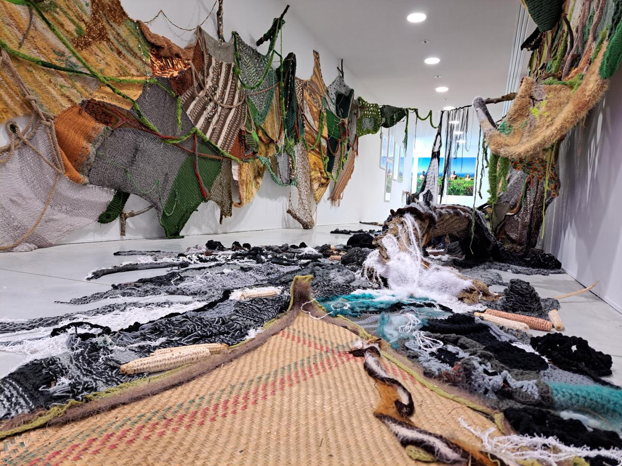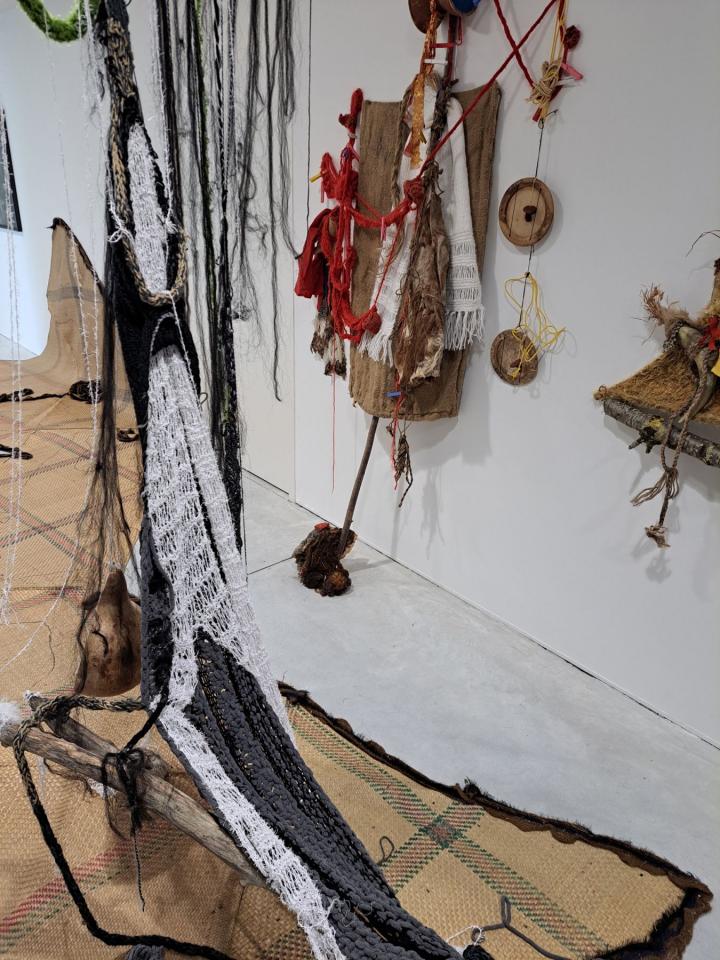 Installation, nattes, laines, roches, bois, cornes, peau, papier recyclé, vidéo sur écran.
