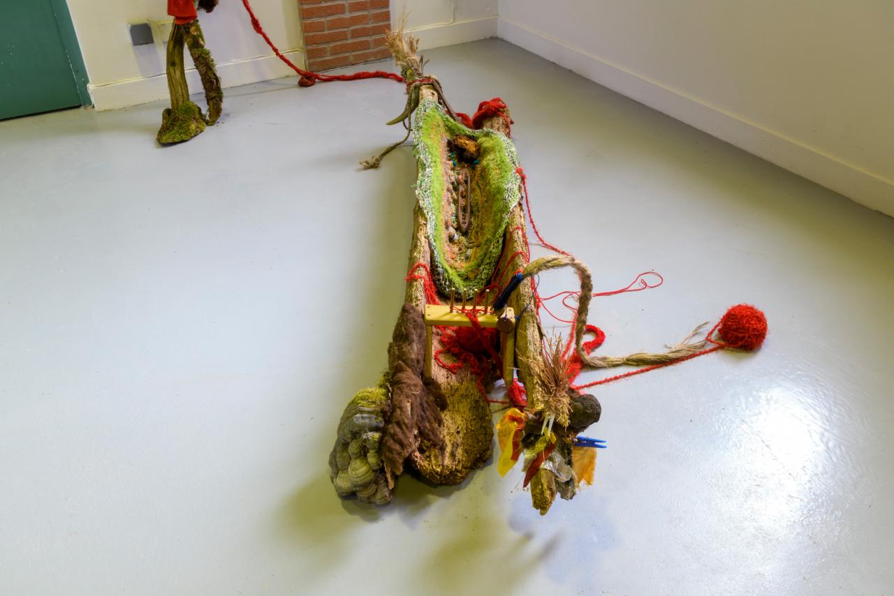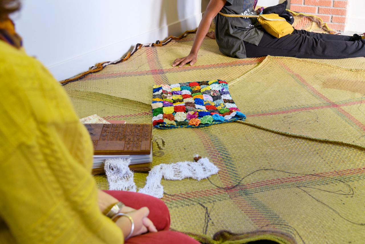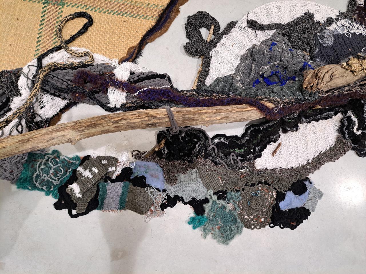 Installation, nattes, laines, roches, bois, cornes, peau, papier recyclé, vidéo sur écran.