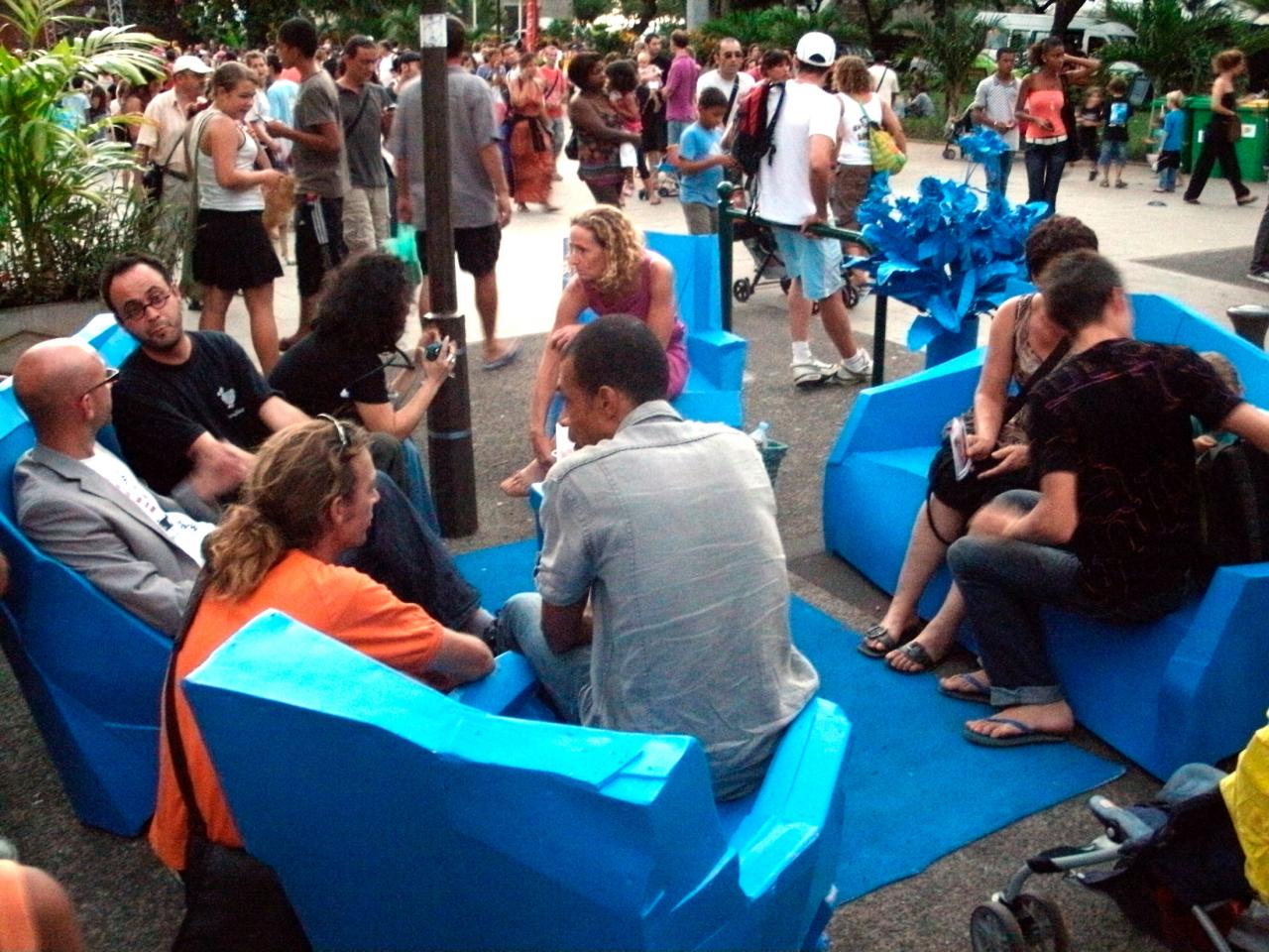 À ce moment-là, Guillaume faisait référence aux salons du XVIIIe siècle, des lieux mondains où les gens discutaient art, sciences et littérature, qui étaient d’ailleurs souvent tenus par des femmes, comme le salon de Madame de Staël, ou de Madame de Sévigné. Avec notre installation, on marquait physiquement le lieu en disant : le salon est là, et on se réapproprie l’espace public. Cet espace est à tout le monde et la parole doit y circuler.