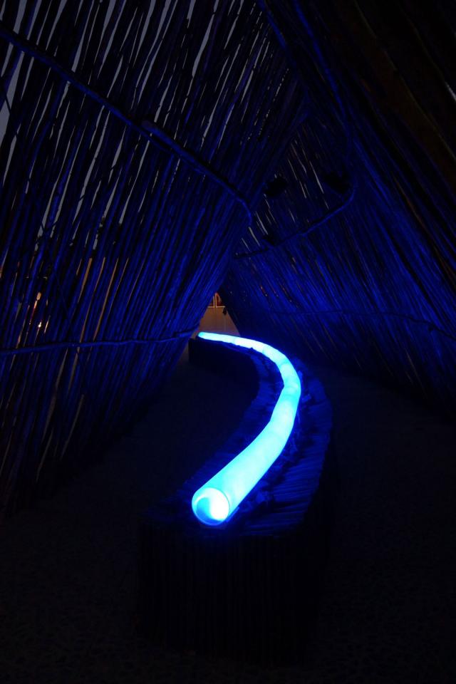 JBT : Oui, c’est différent. Lorsque j’ai reçu, en 2011, l’invitation du Musée Dapper de Paris, le musée d’art africain ancien, pour intervenir à Gorée, sur l’île sénégalaise, d’où on envoyait les esclaves en Amérique, j’ai accepté et entamé un processus de connaissance. J’ai essayé de comprendre l’esprit du lieu au travers de ceux qui y vivaient, écrivaient ou créaient leur musique. J’ai utilisé de longs troncs de jeunes eucalyptus. Nous sommes allés les chercher à Saloum, dans le Sénégal continental, et nous les avons apportés sur la plage de Gorée. La forêt est peuplée de vie pour les Africains. Alors, peu à peu, nous avons noué les troncs et nous avons laissé à l’intérieur de la pièce un couloir légèrement incurvé de 12 mètres, dans lequel il est possible de vivre. Le bleu apparaît encore ici. Une grande veine, construite avec d’autres matériaux, est placée sur la terre, et avance à l’intérieur du lieu. À travers un mécanisme électrique, j’arrive à faire en sorte que la lumière bleue se dilate et se contracte, comme un corps qui respire. Il est apparu tout de suite que la demeure était occupée par le corps. Je précise que pour moi, il n’y a pas de différence entre le corps et l’esprit. Savez-vous que le bleu est la dernière couleur qui correspond à l’âme de l’homme ? Sous la présence des matériaux végétaux, la mémoire ancestrale était là, comme les ancêtres dont parlait Senghor. (…) »