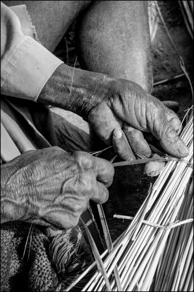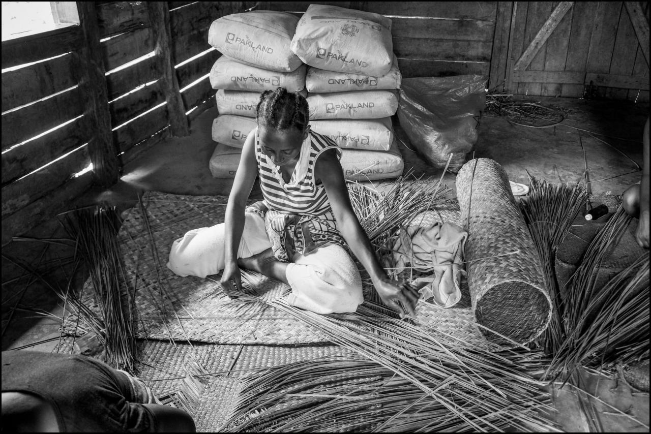 Des femmes, des hommes tissent des végétaux, écrivent le texte de leur existence.