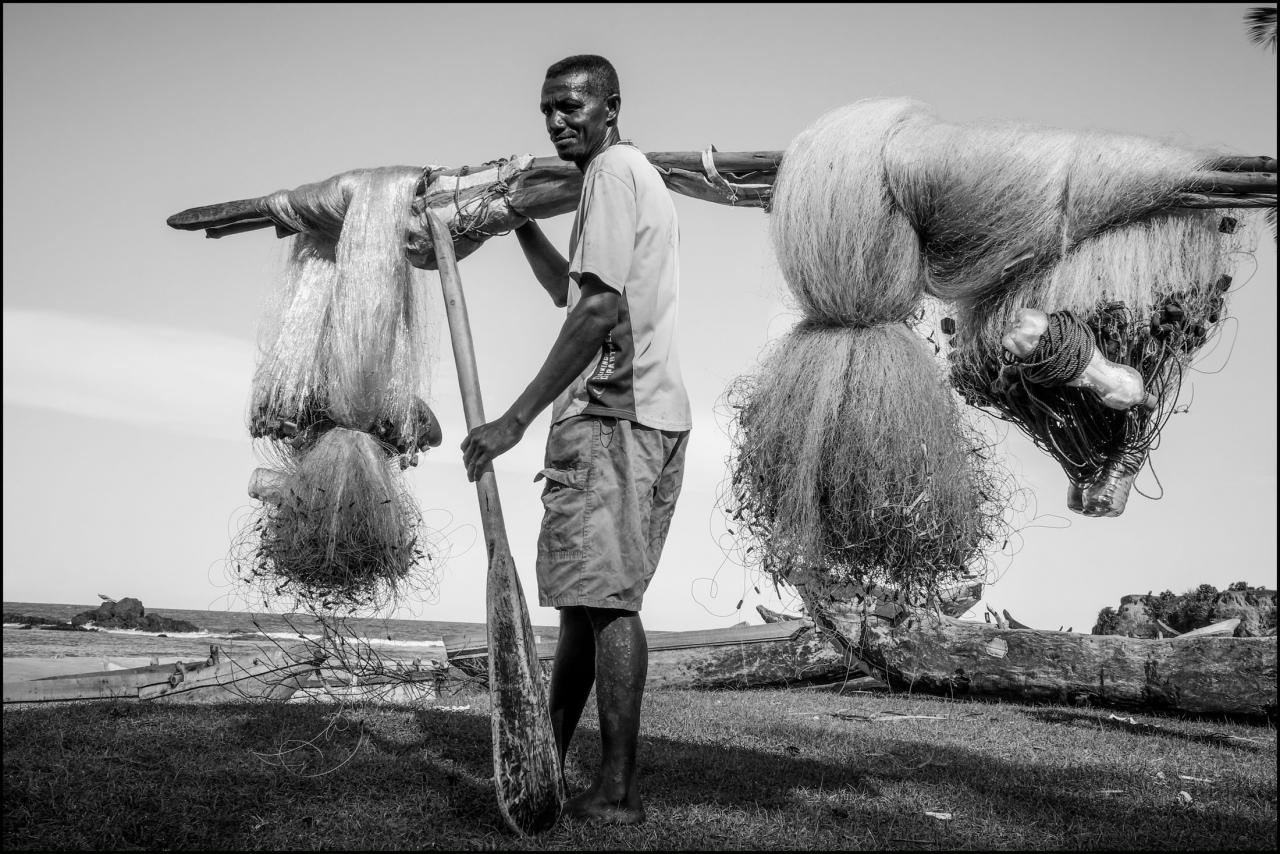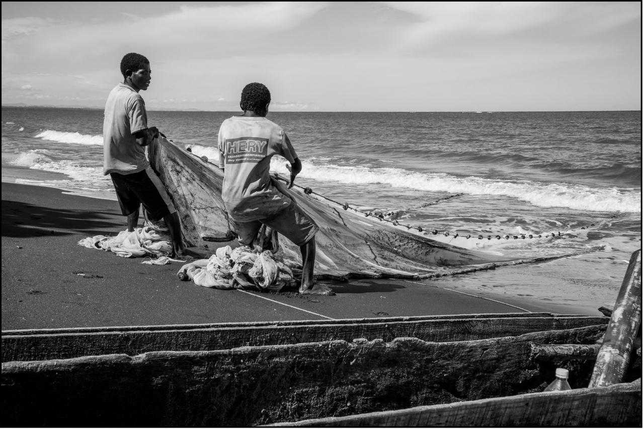 Des pêcheurs tirent ensemble leur filet dans la baie de Saint-Paul, sur la plage de Rufisque ou de Nosy Akoho.
