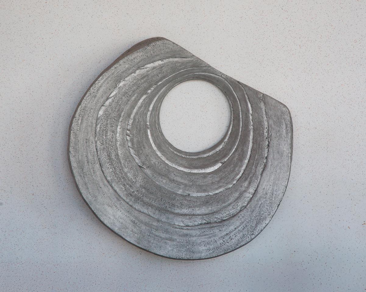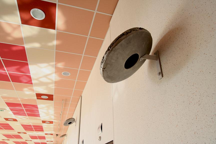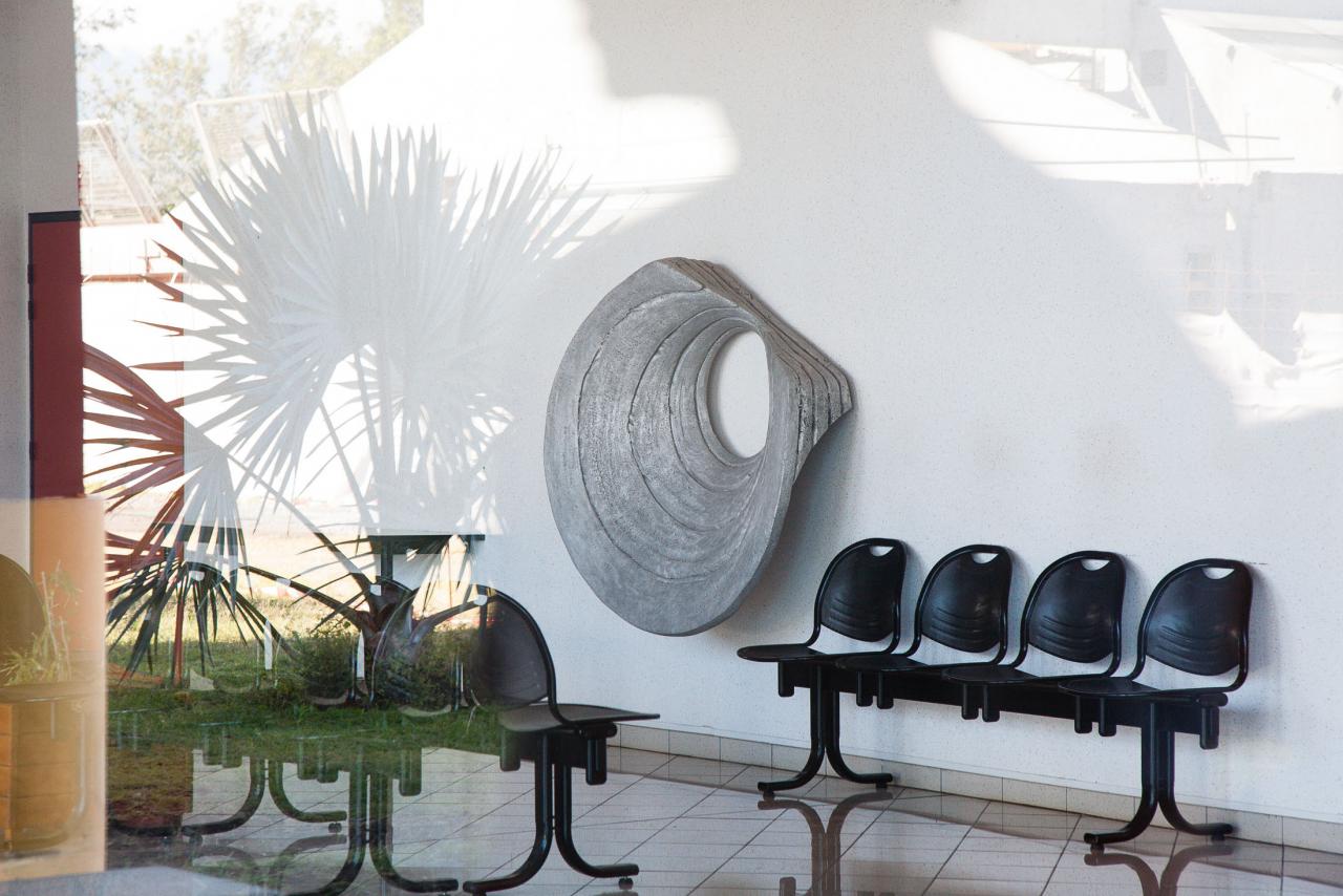 « L’installation Autour est constituée d’une sculpture principale installée au mur et de 4 sculptures rondes accrochées en hauteur. Autour symbolise l’idée du regroupement, de l’être ensemble. Amphi veut dire en grec autour, double, de part et d’autre. Les sculptures, en fonte d’aluminium et sable mêlés, sont autant d’antennes de la matrice principale, comme un appel à se regrouper autour du savoir. On peut y voir un rapport à l’amphithéâtre antique, lieu des premiers enseignements scolastiques. Dans le granulé brut de la matière, Jean-Claude Jolet infuse toute l’intensité élémentaire, volcanique, que dégage l’île de La Réunion. Le trésor serait-il au centre ? »