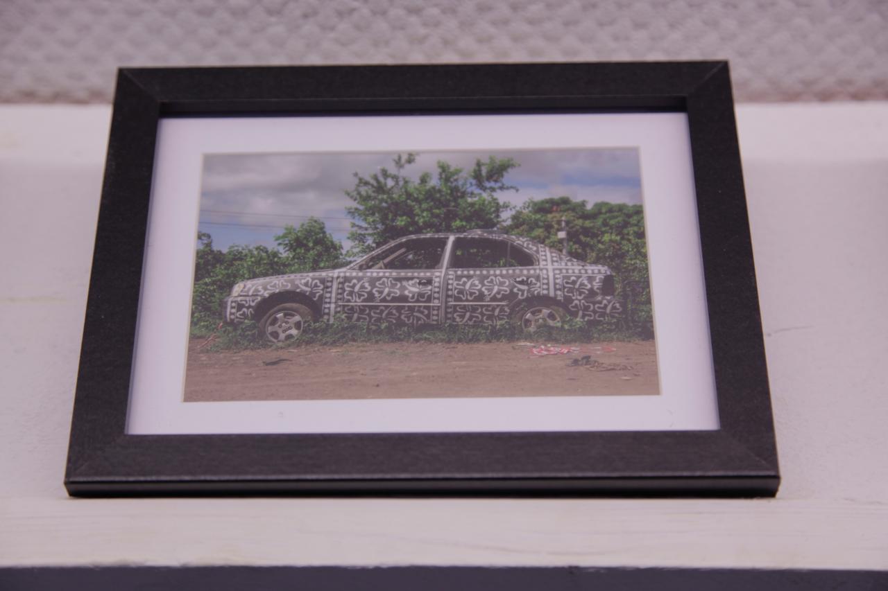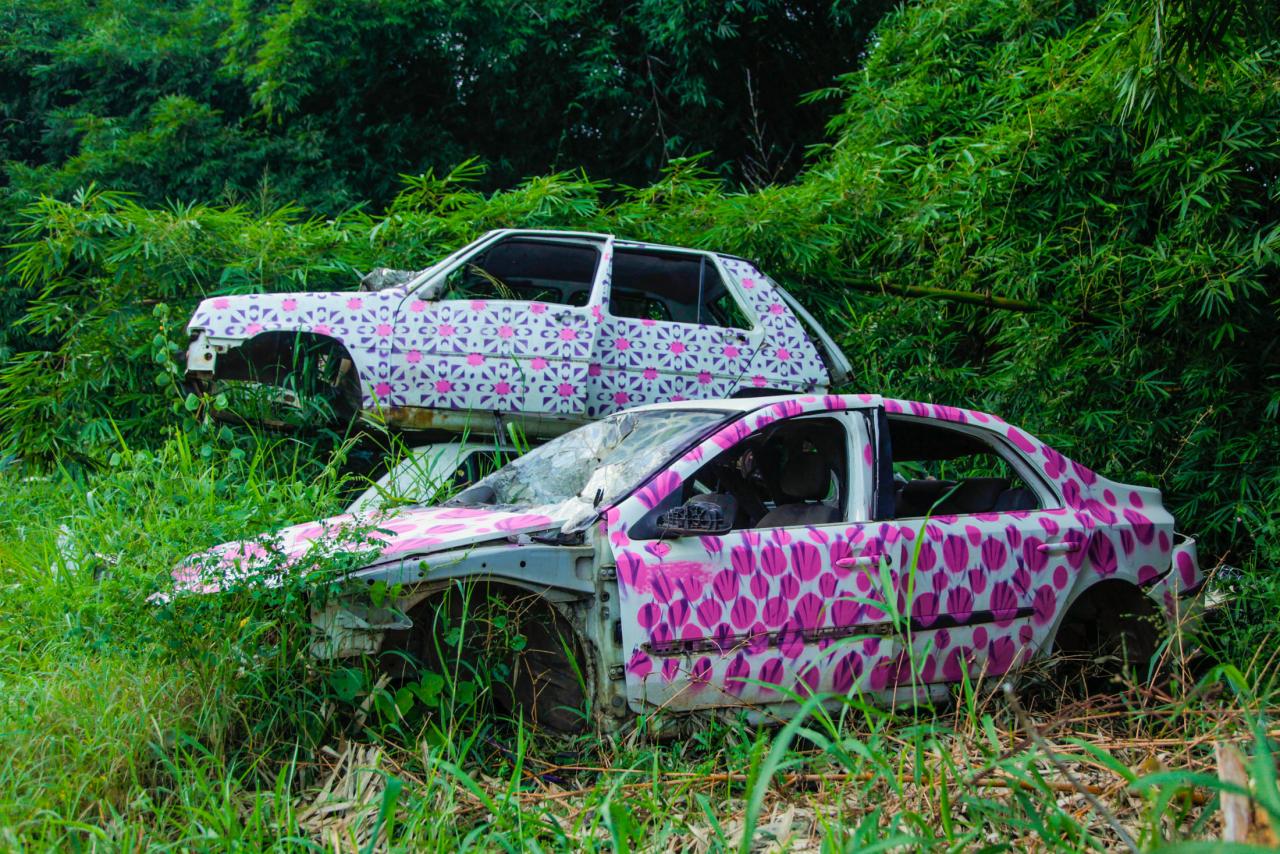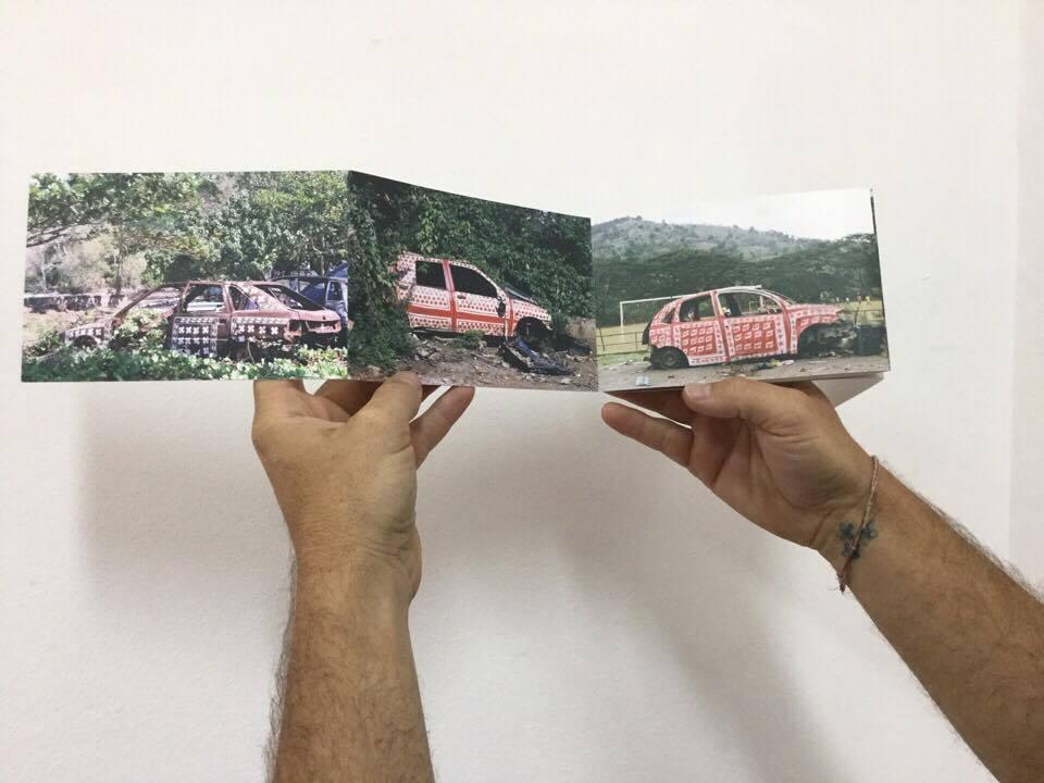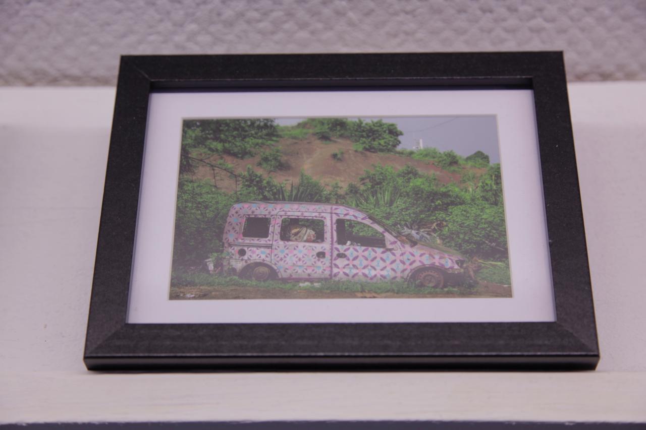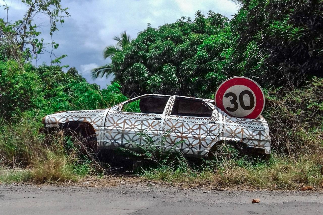 « Photographies témoins d’interventions in situ sur des carcasses automobiles abandonnées en bord de route à Mayotte. Idée de recouvrement, d’habillage et de mise en évidence d’une épave, d’un moyen de mobilité, signe de liberté, mise au rebut de la société mahoraise. Motifs inspirés de tissus traditionnels type Chiromani et Lambawane. »