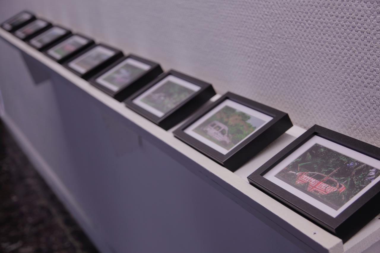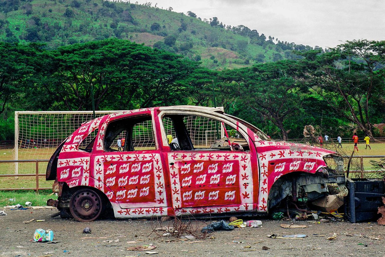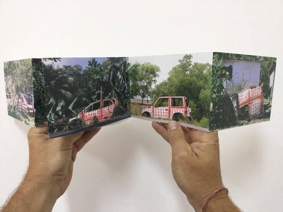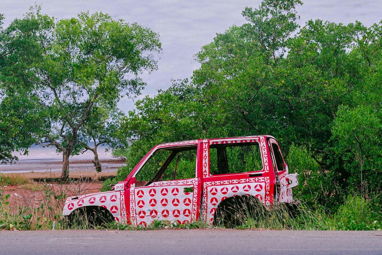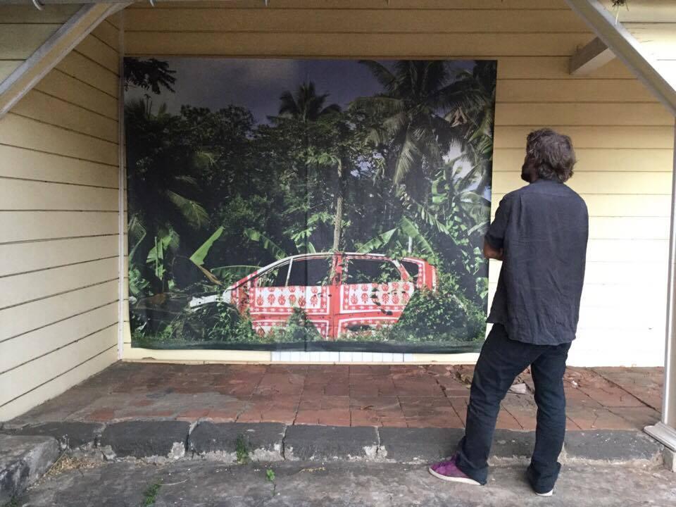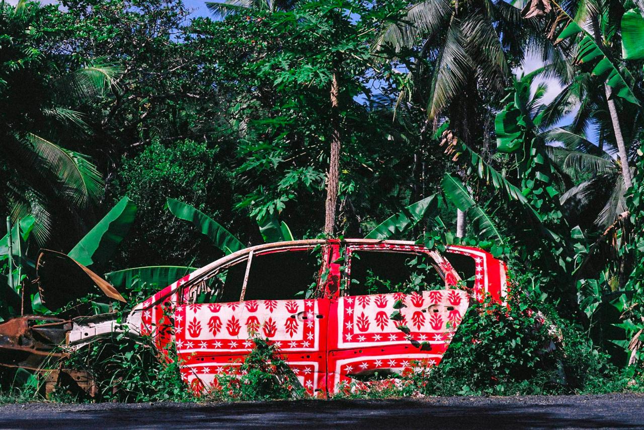 « Photographies témoins d’interventions in situ sur des carcasses automobiles abandonnées en bord de route à Mayotte. Idée de recouvrement, d’habillage et de mise en évidence d’une épave, d’un moyen de mobilité, signe de liberté, mise au rebut de la société mahoraise. Motifs inspirés de tissus traditionnels type Chiromani et Lambawane. »