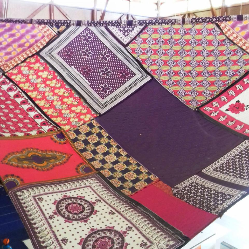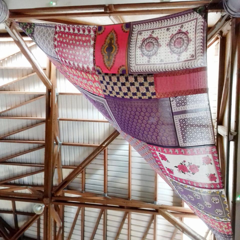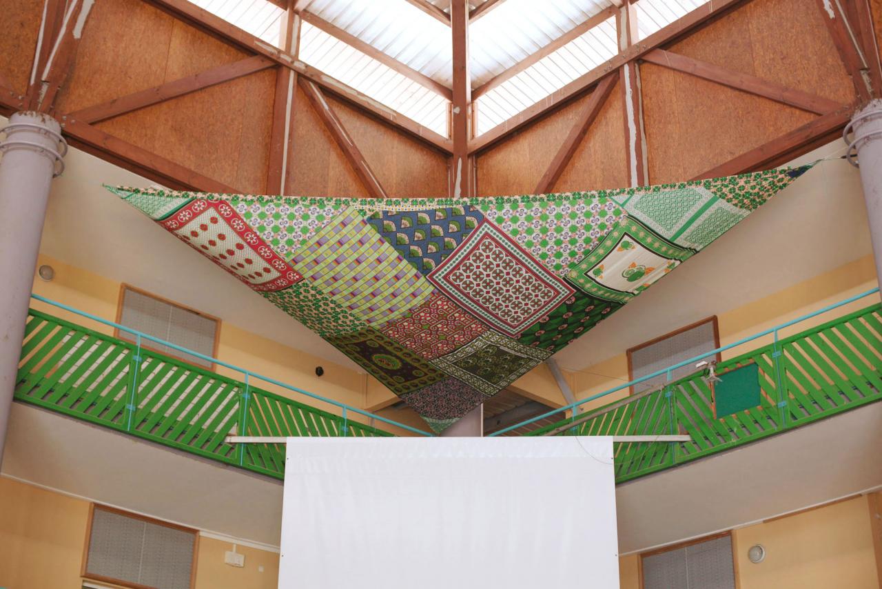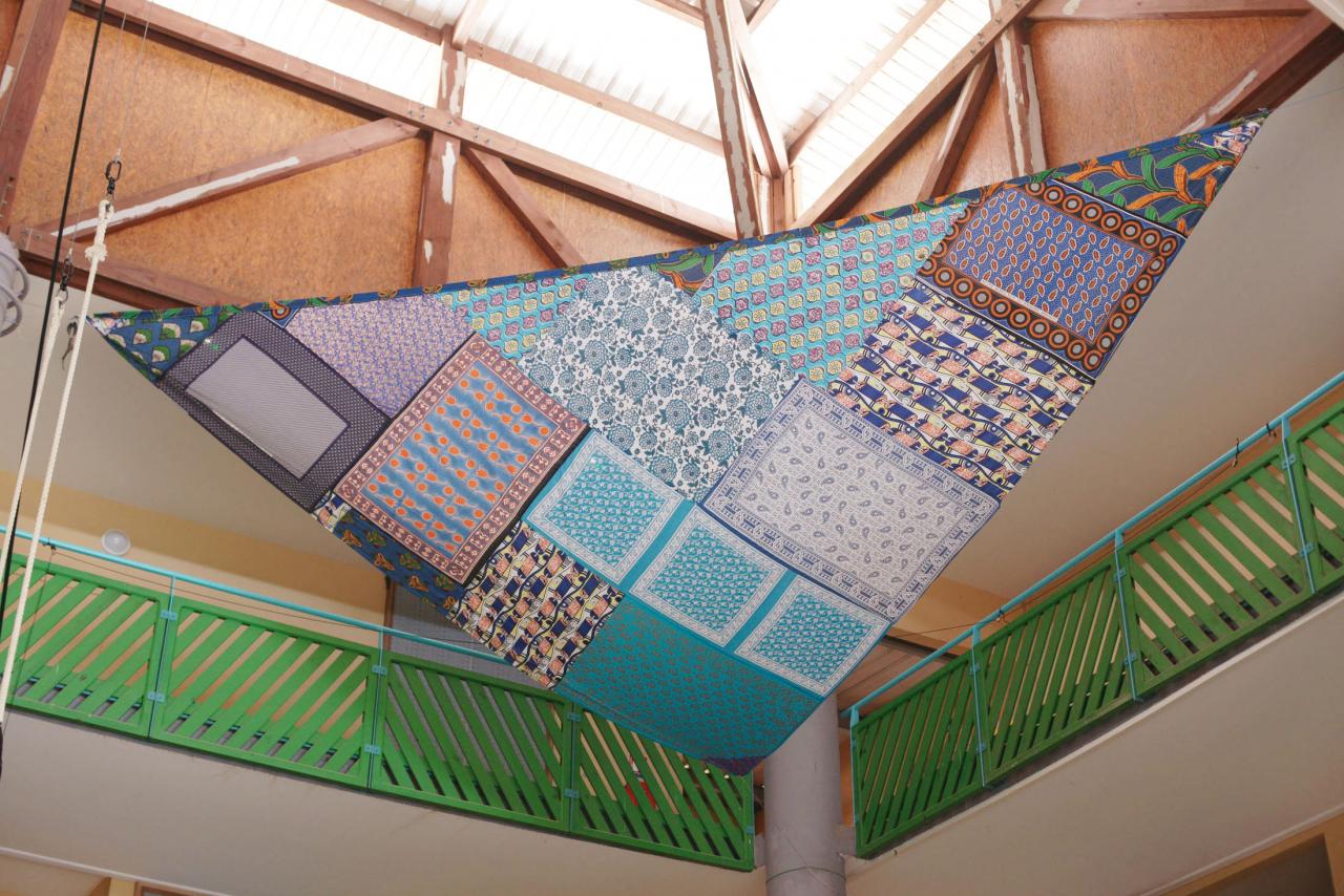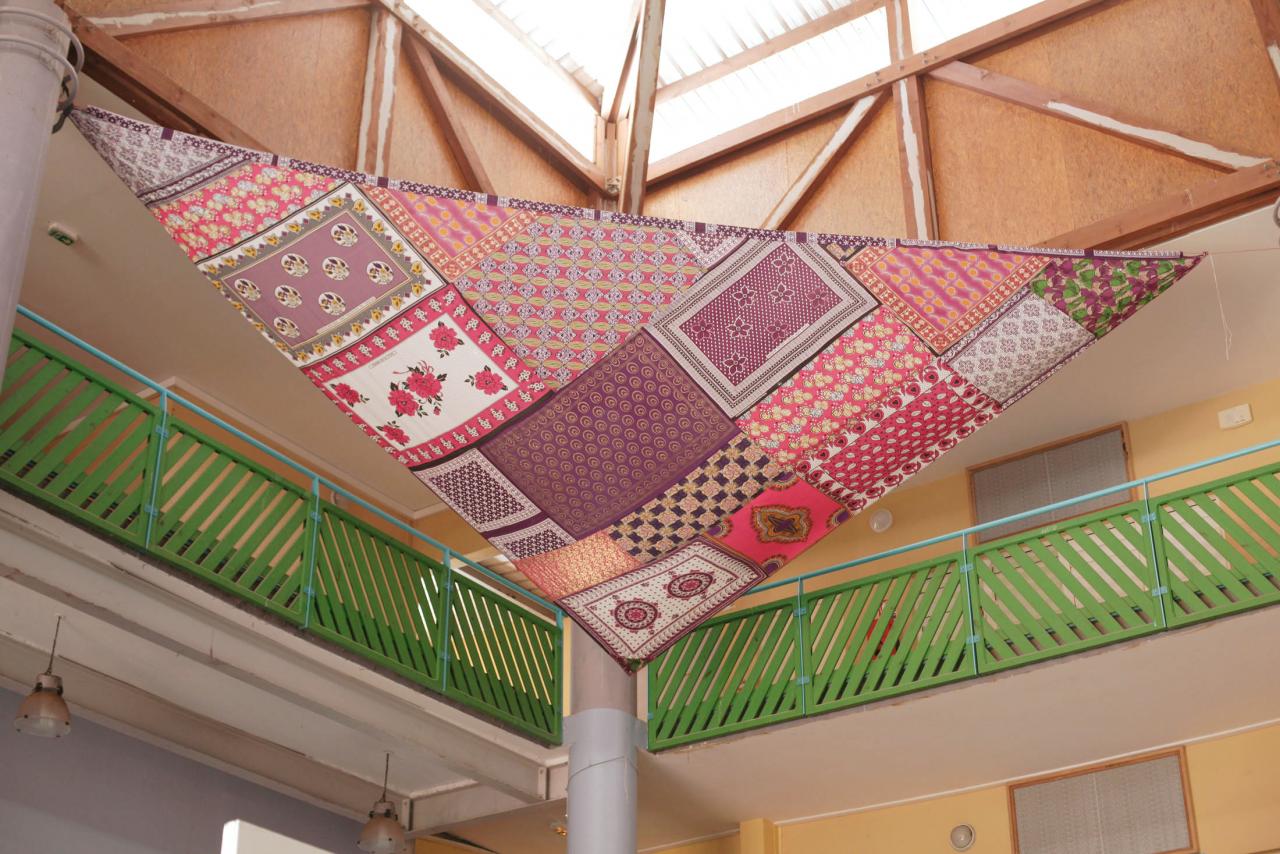 « Avec la problématique du « visa Balladur1 » concernant Mayotte au sein de l’archipel des Comores, cette installation de quatre grandes voiles cousues de soulouva, lambawane et shiromani, est une proposition poétique pour un déplacement libre entre les quatre îles de l’archipel. Les voiles sont de forme triangulaire comme les voiles de boutres, bateaux typiques de l’océan Indien d’origine arabe, qui symbolisent le lien entre îles et côtes, échanges, commerce, pêche et cabotage. Issues d’une résidence artistique en milieu scolaire, les quatre voiles sont disposées aux quatre coins cardinaux du bâtiment, dans le hall principal du collège. »