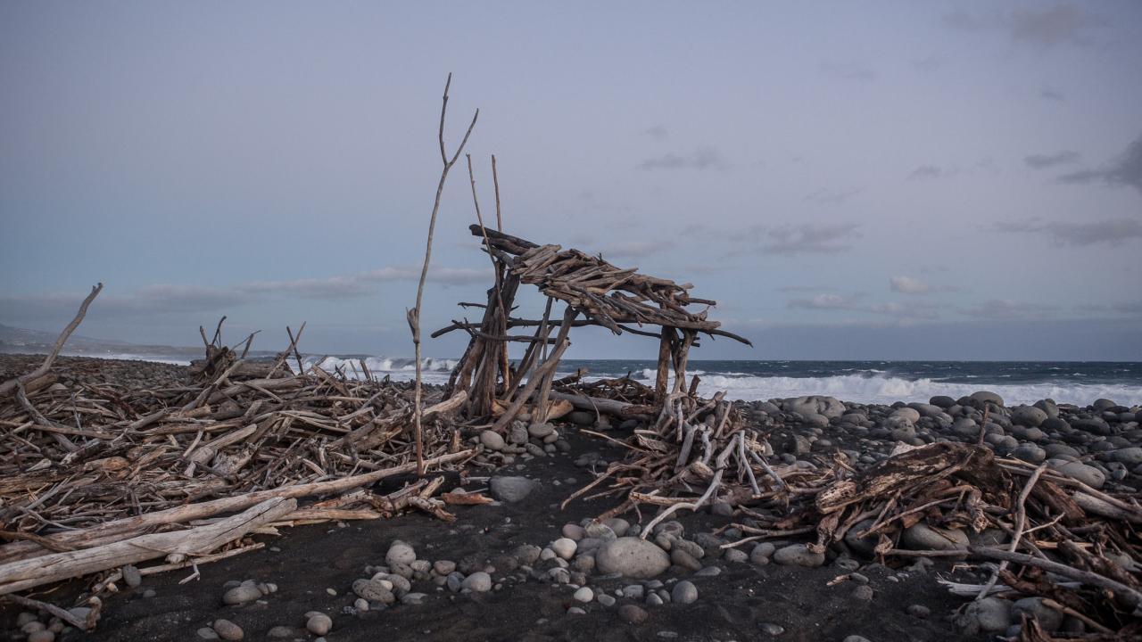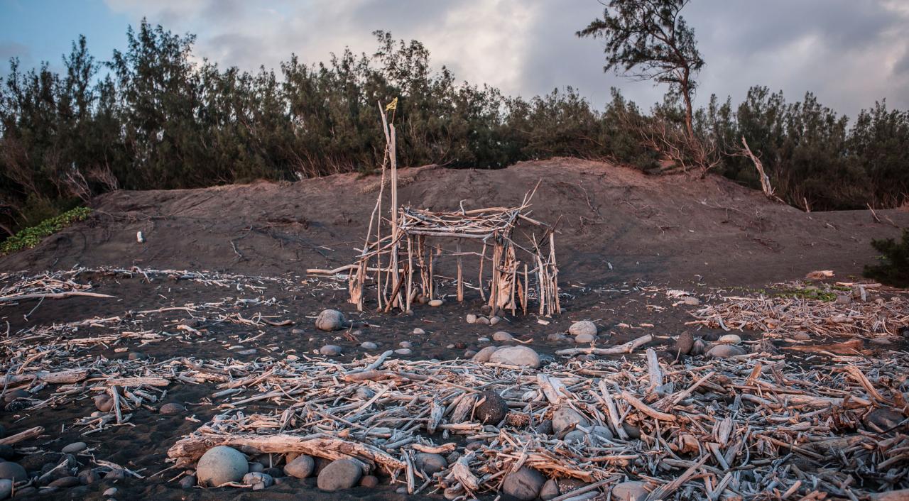 « Création de sculptures in situ par geste architectural. Cabanes construites en une journée sans outils avec des matériaux glanés sur place. La photographie prise entre chien et loup devient la trace de cette action. »