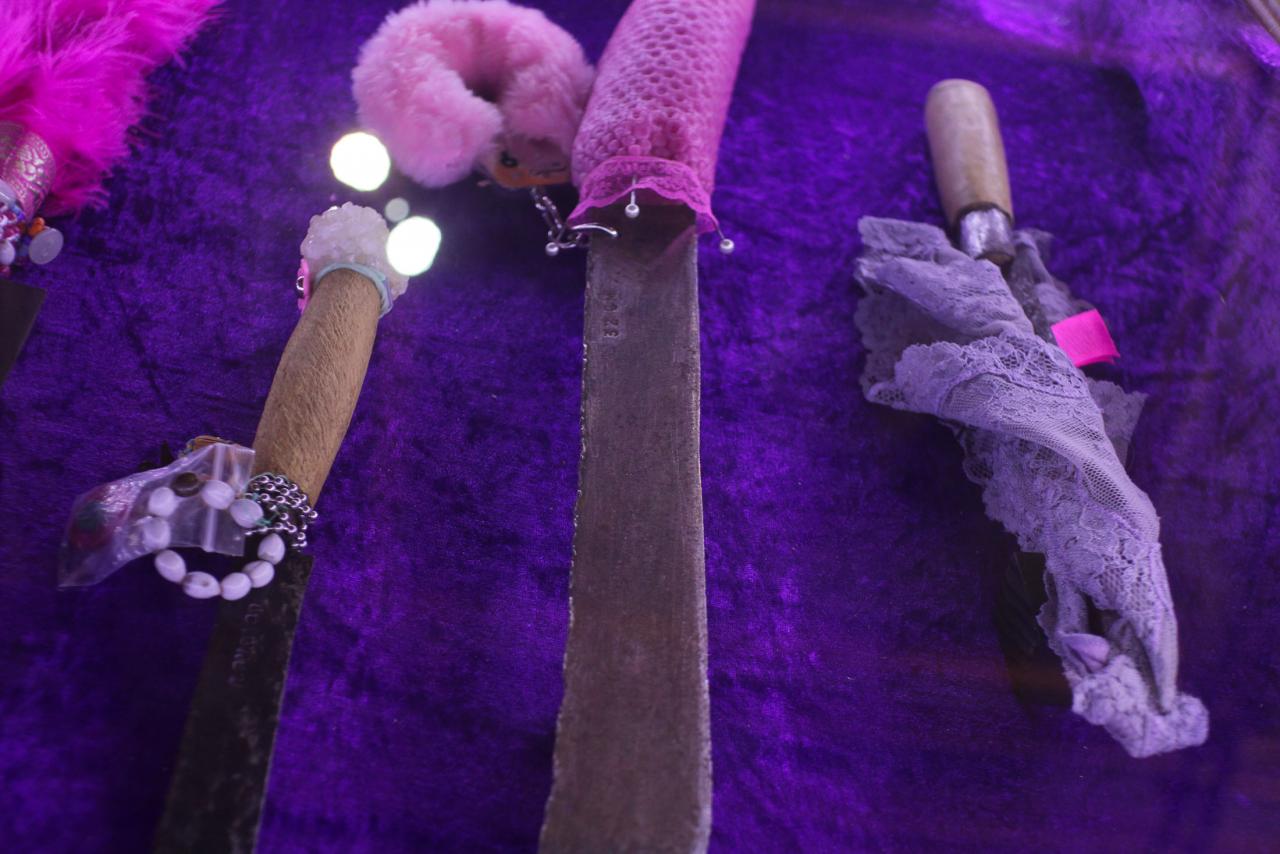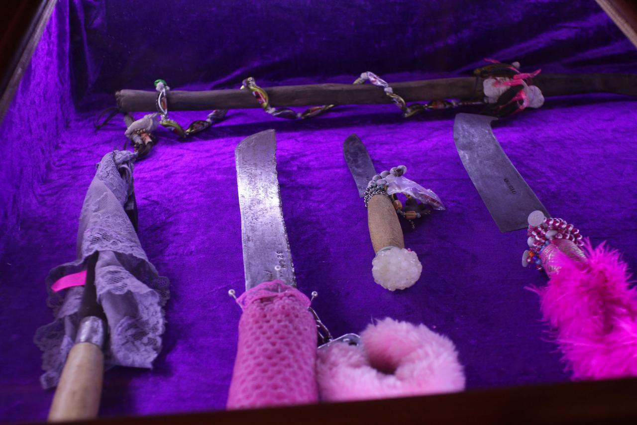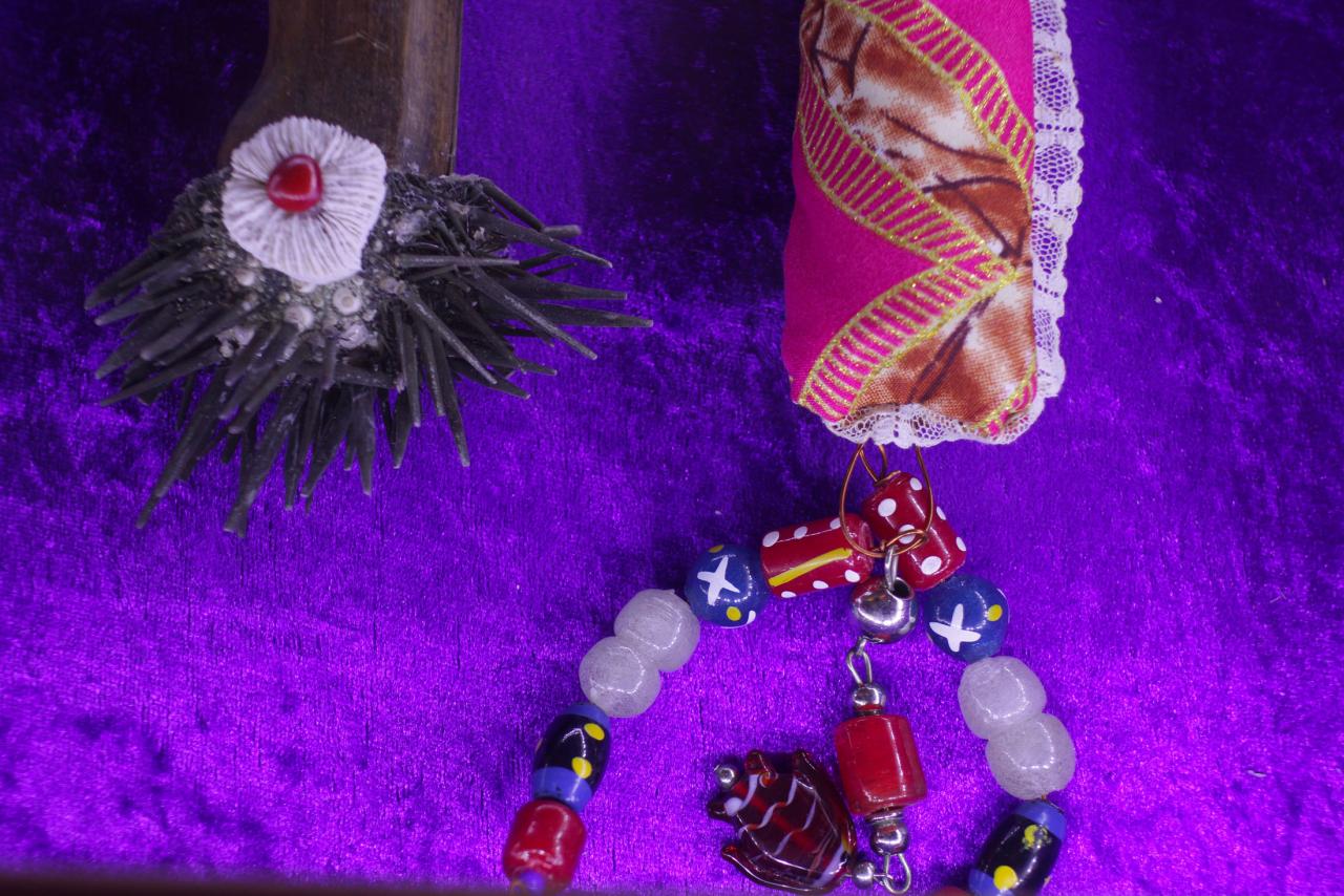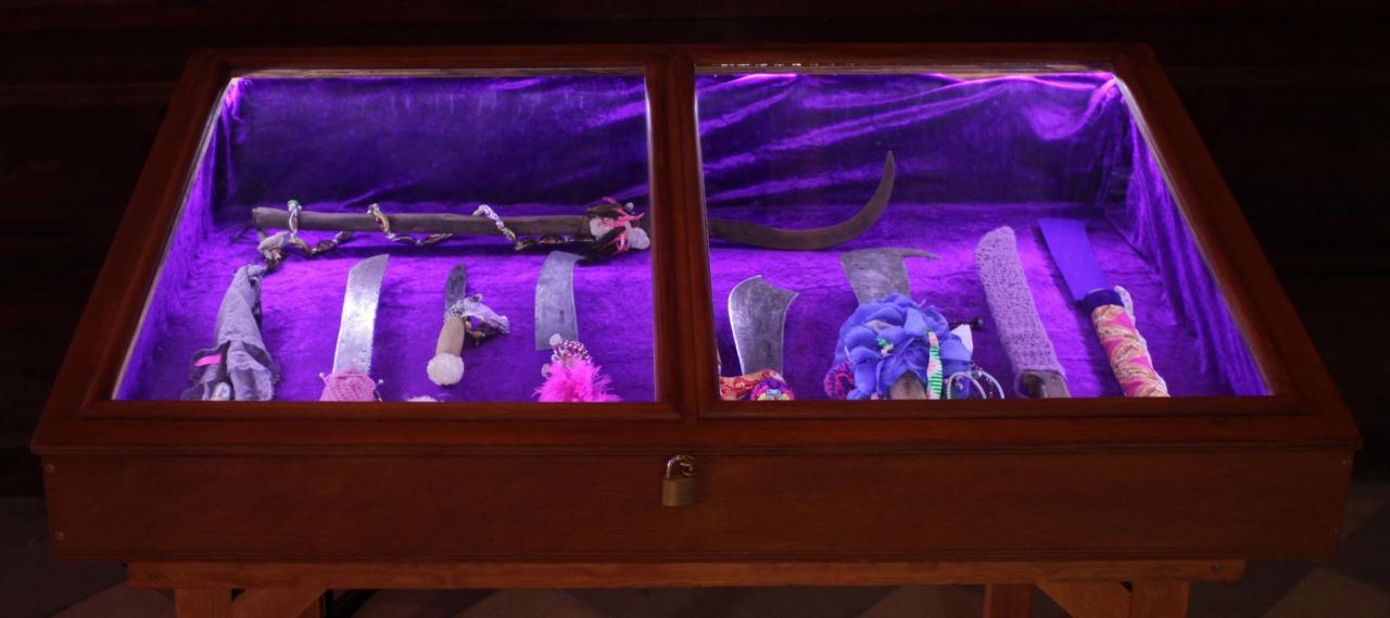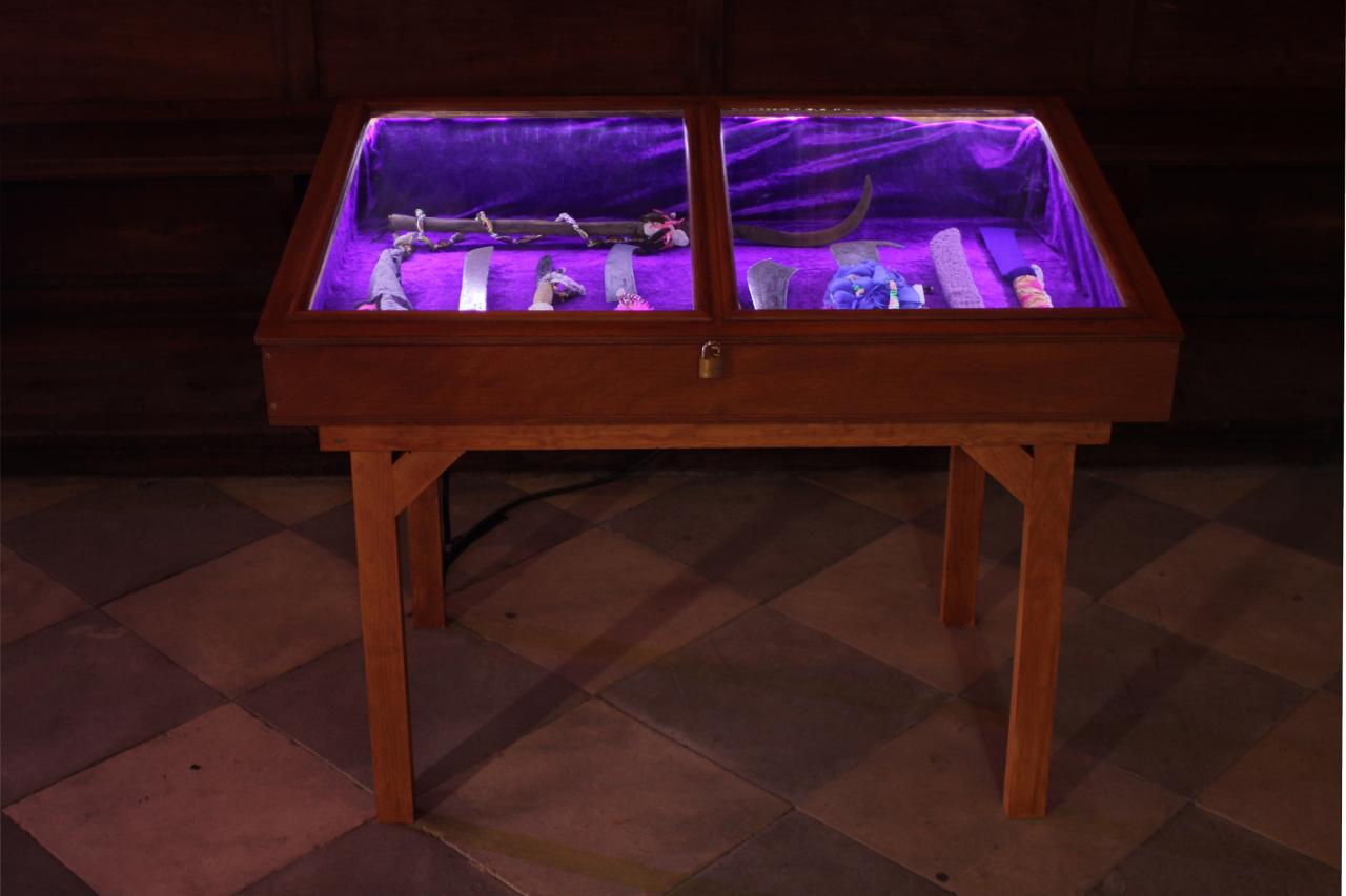 Installation de sculptures sous vitrine, machettes, tissu, latex, cire, graines, coquillages, 80 x 120 cm.