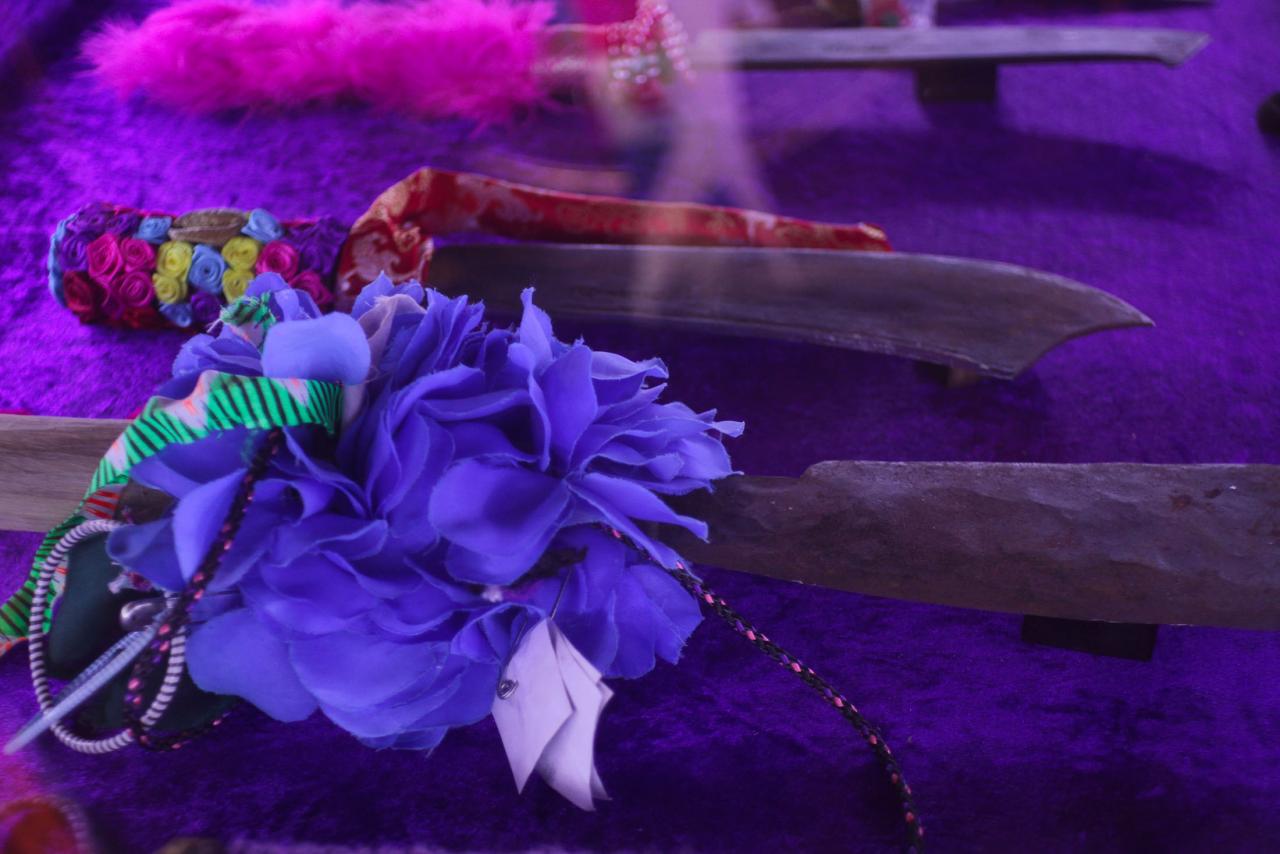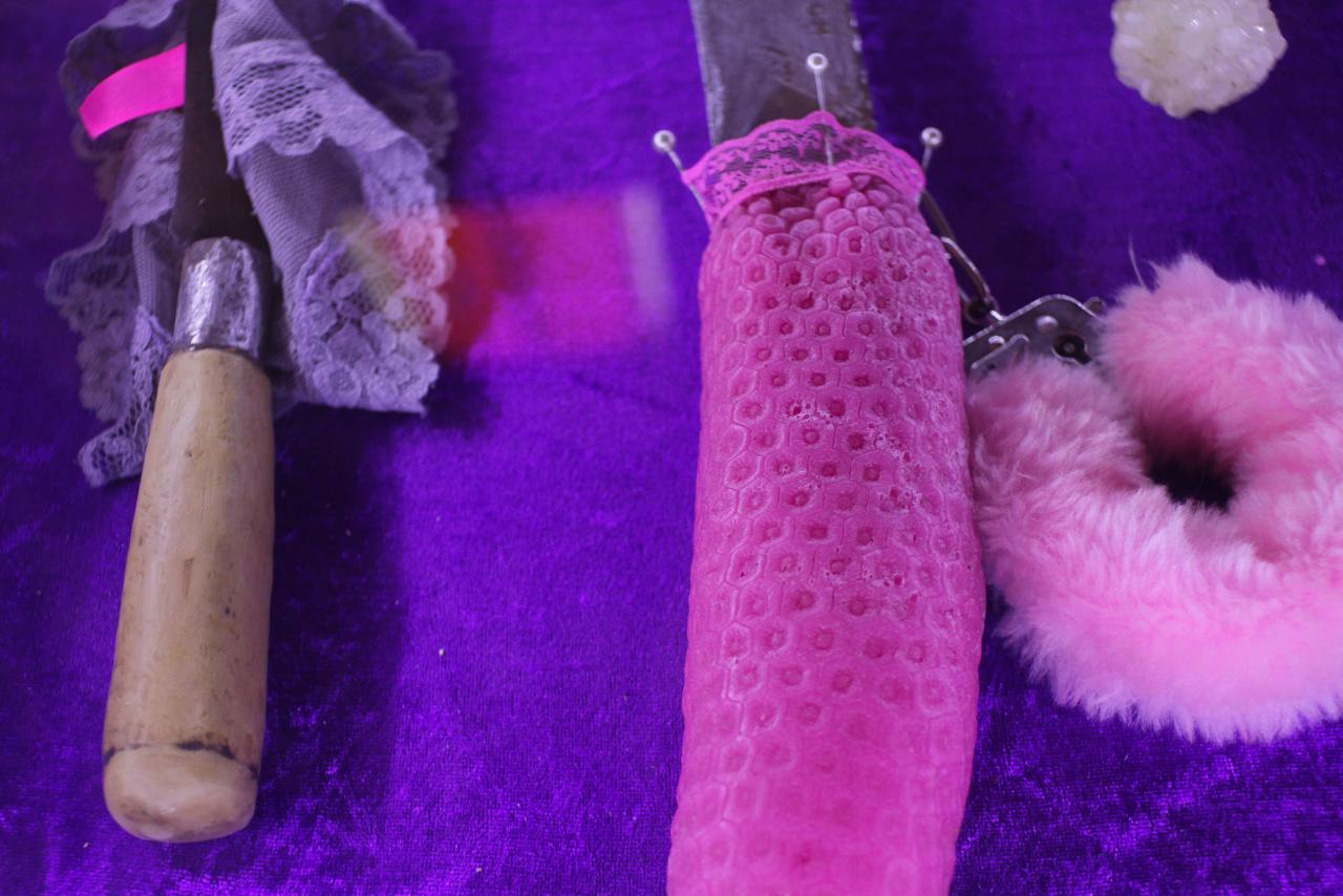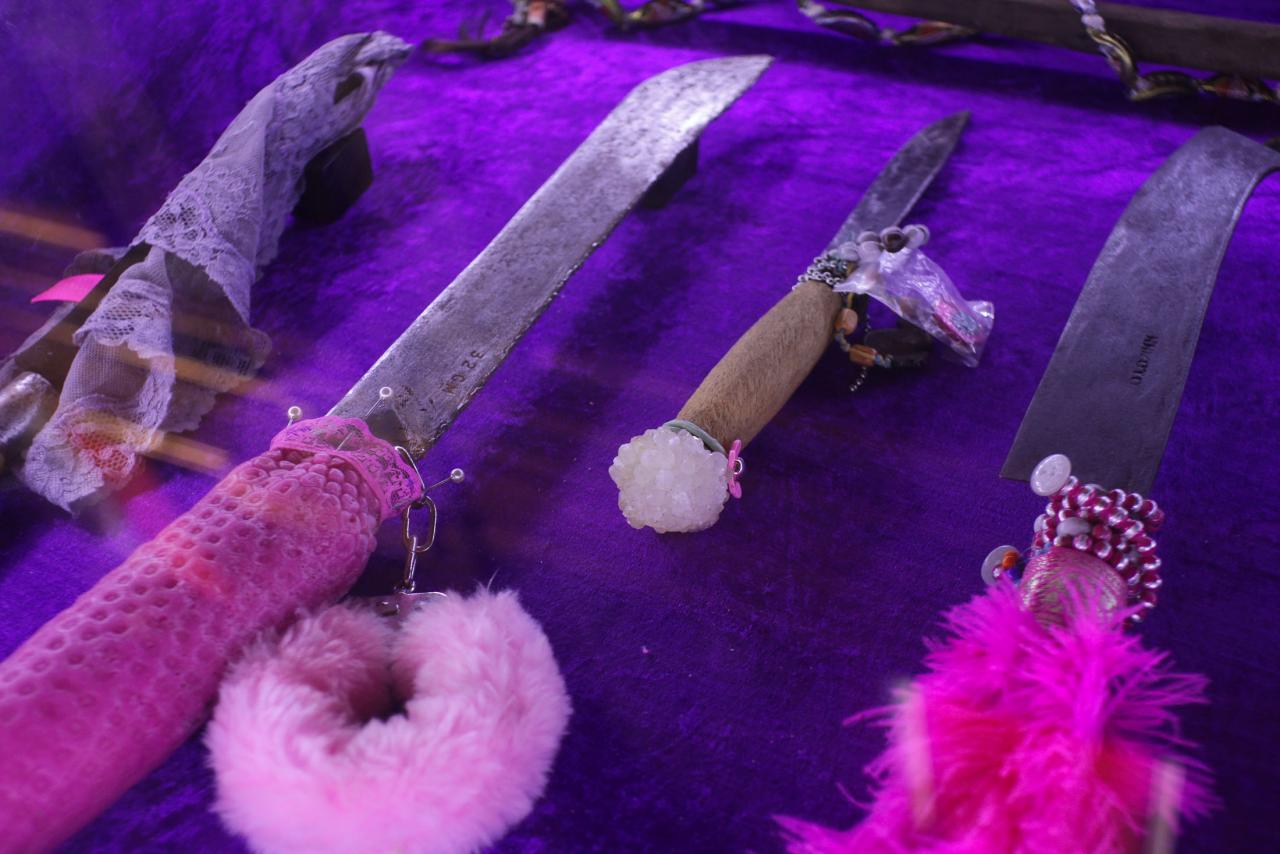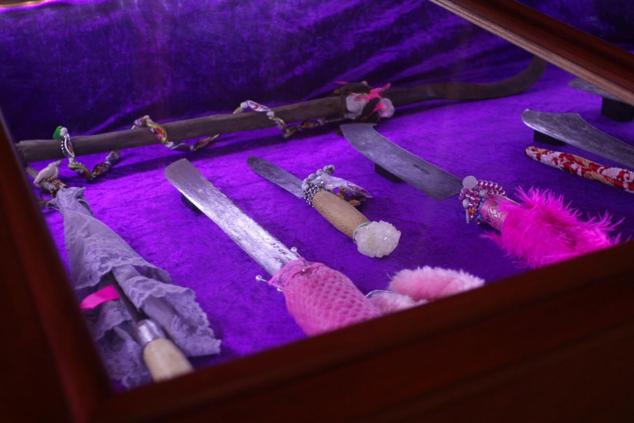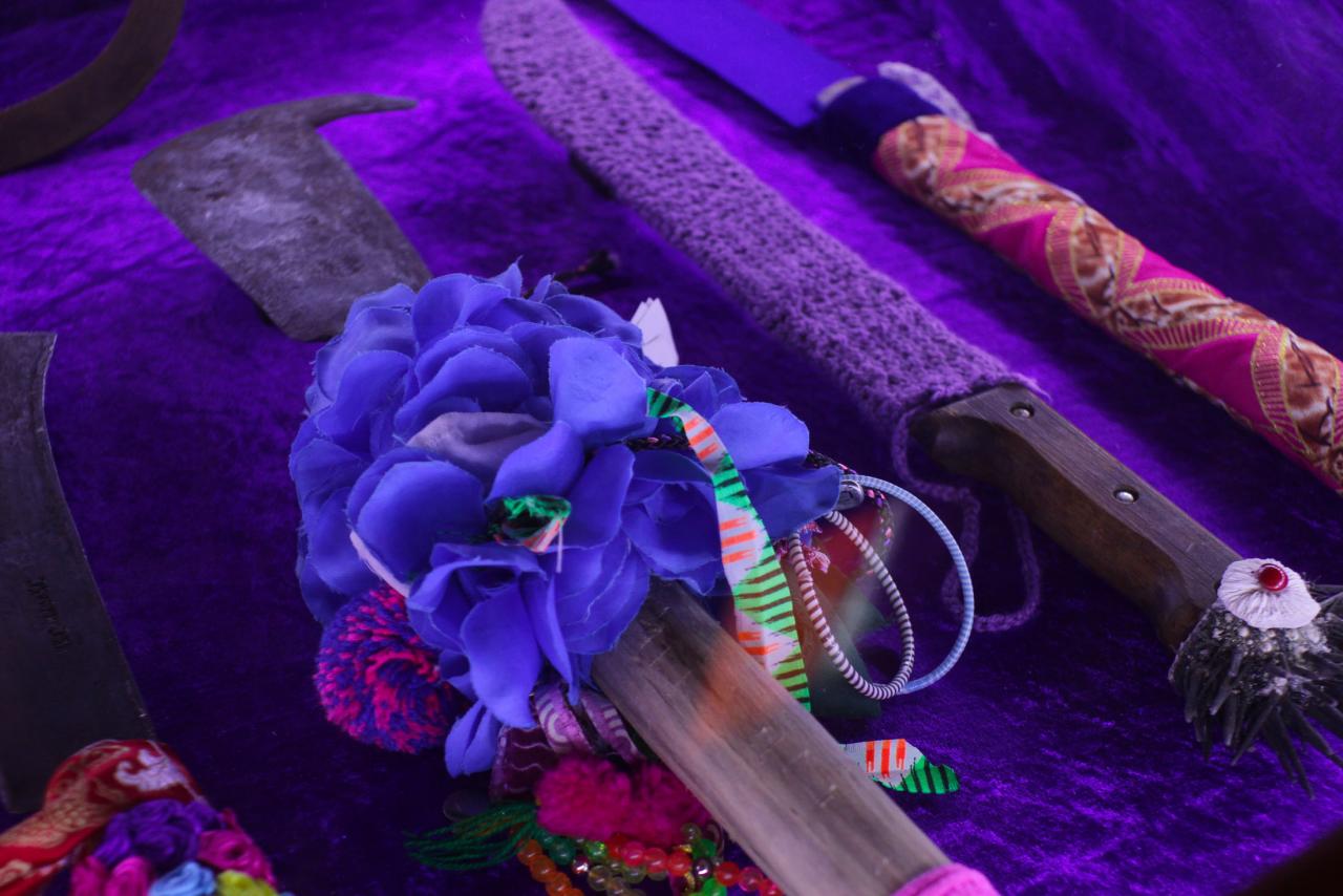 Installation de sculptures sous vitrine, machettes, tissu, latex, cire, graines, coquillages, 80 x 120 cm.